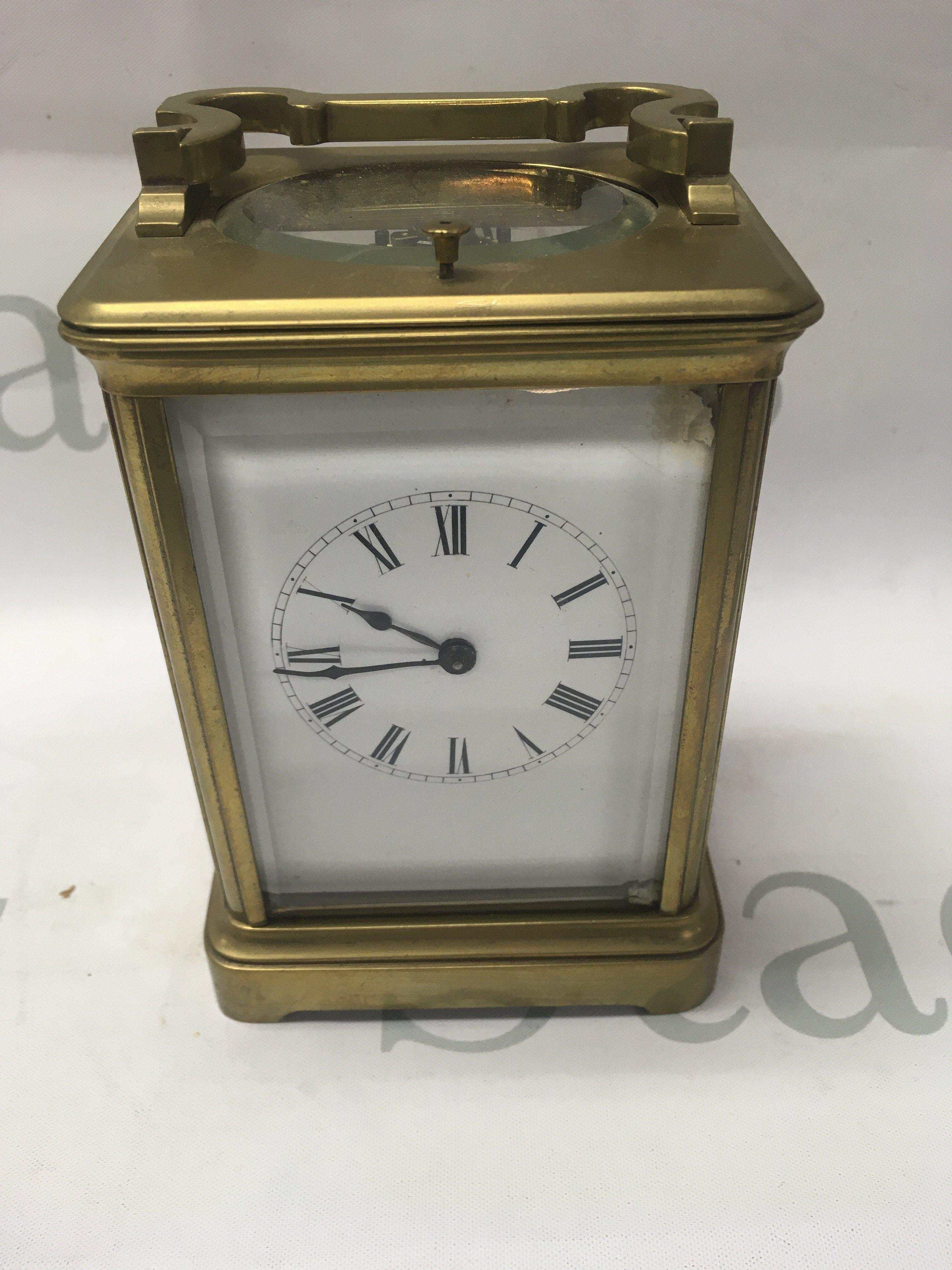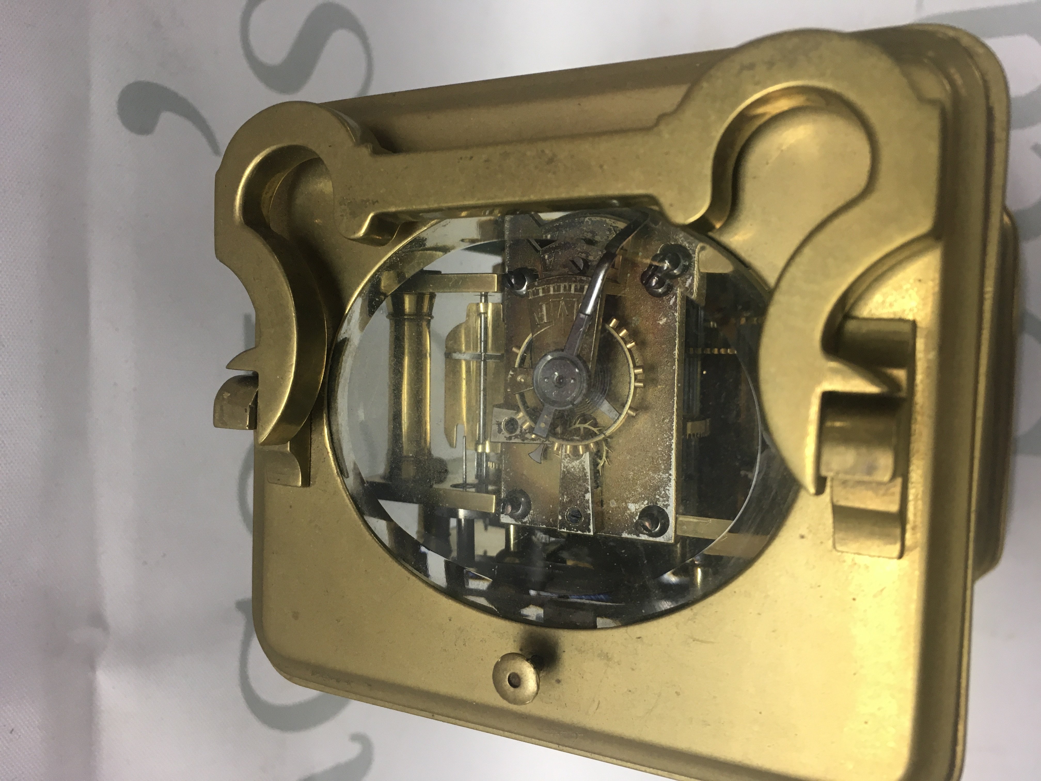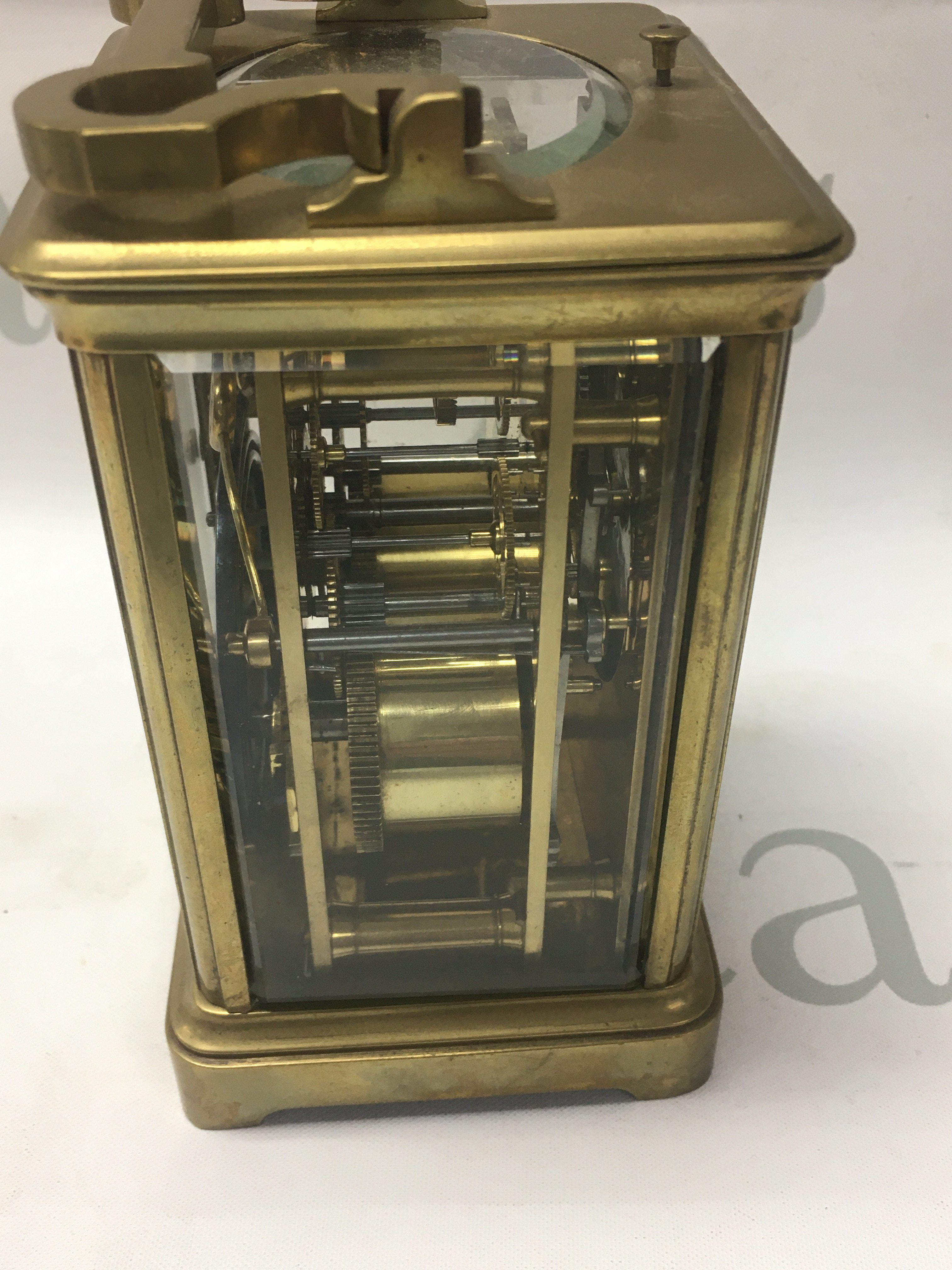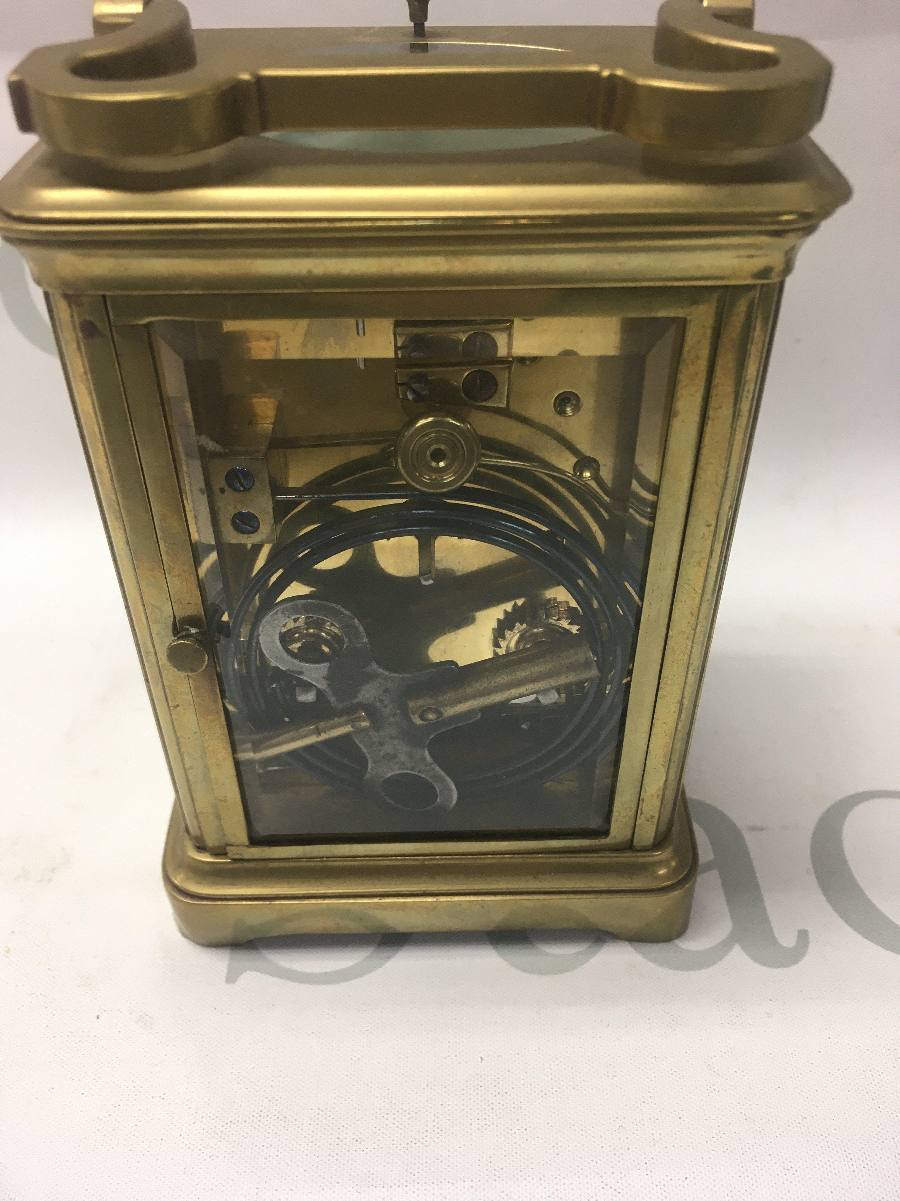 A brass carriage clock with repeat button movement the dial with Roman numerals 14 cm .