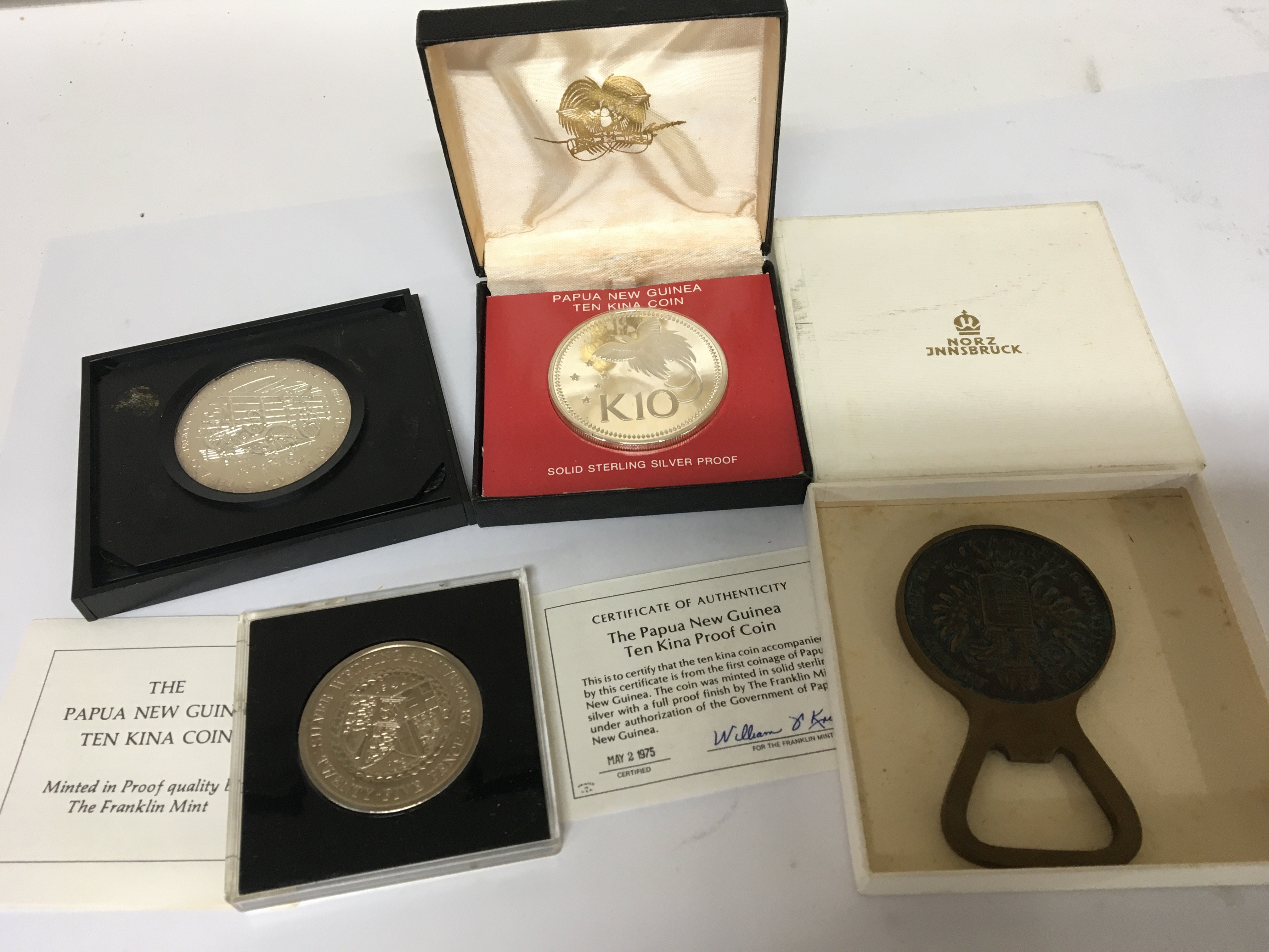 A silver commemorative coin 148-1973 Netherlands Antilles a K10 silver Papua New Guinea Coin silver wedding anniversary coin and a coin bottle opener and silver centenary of the horse tram (5)