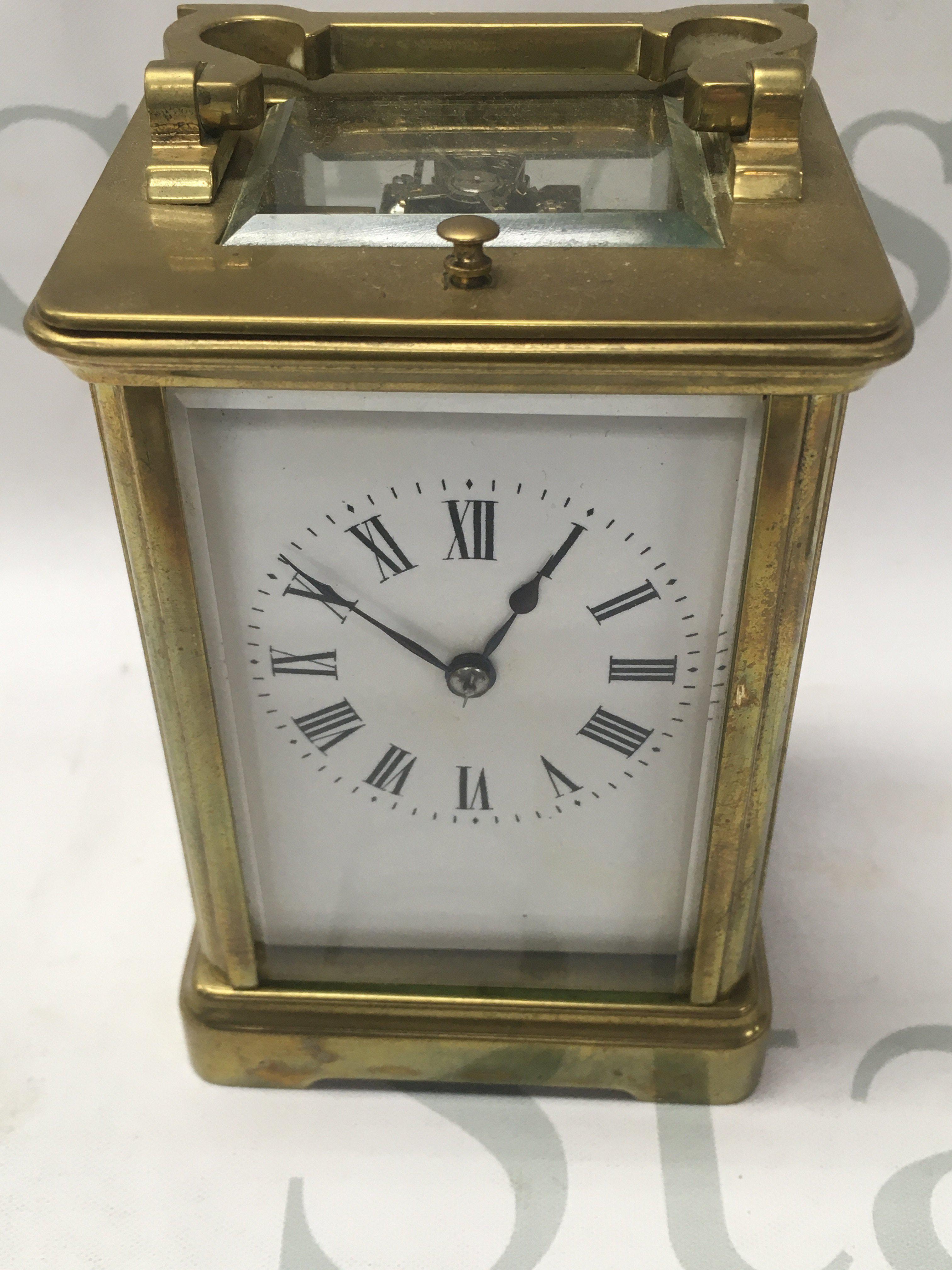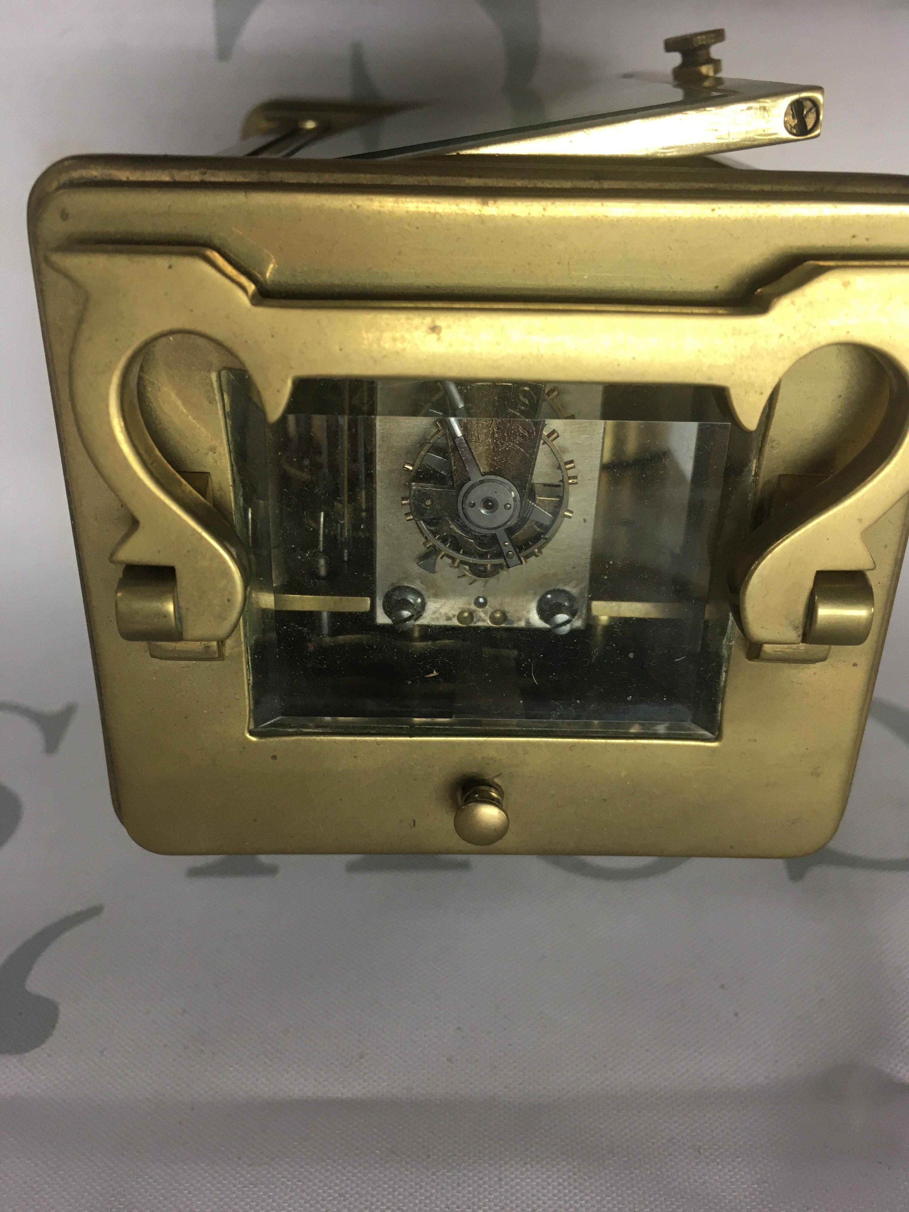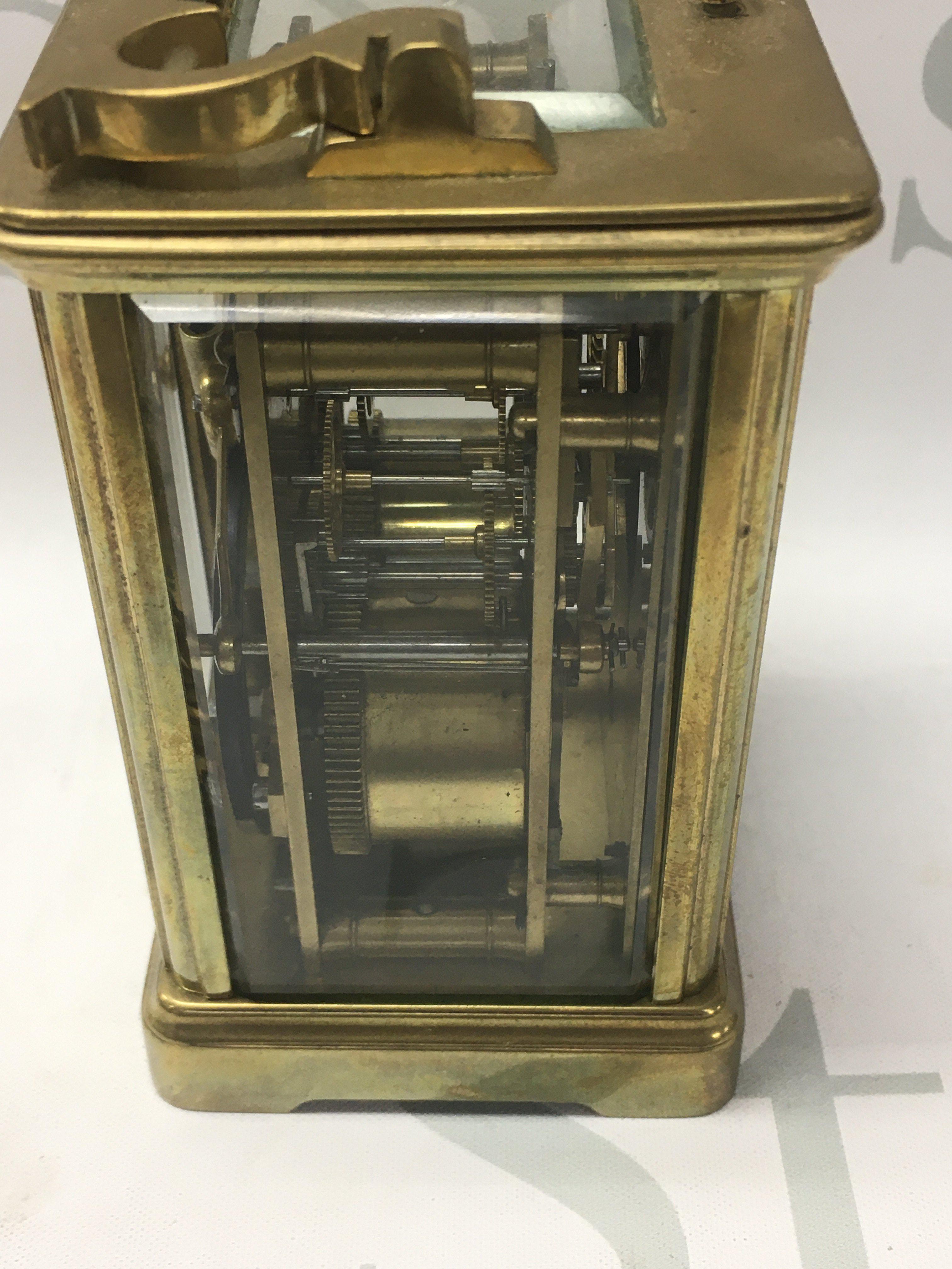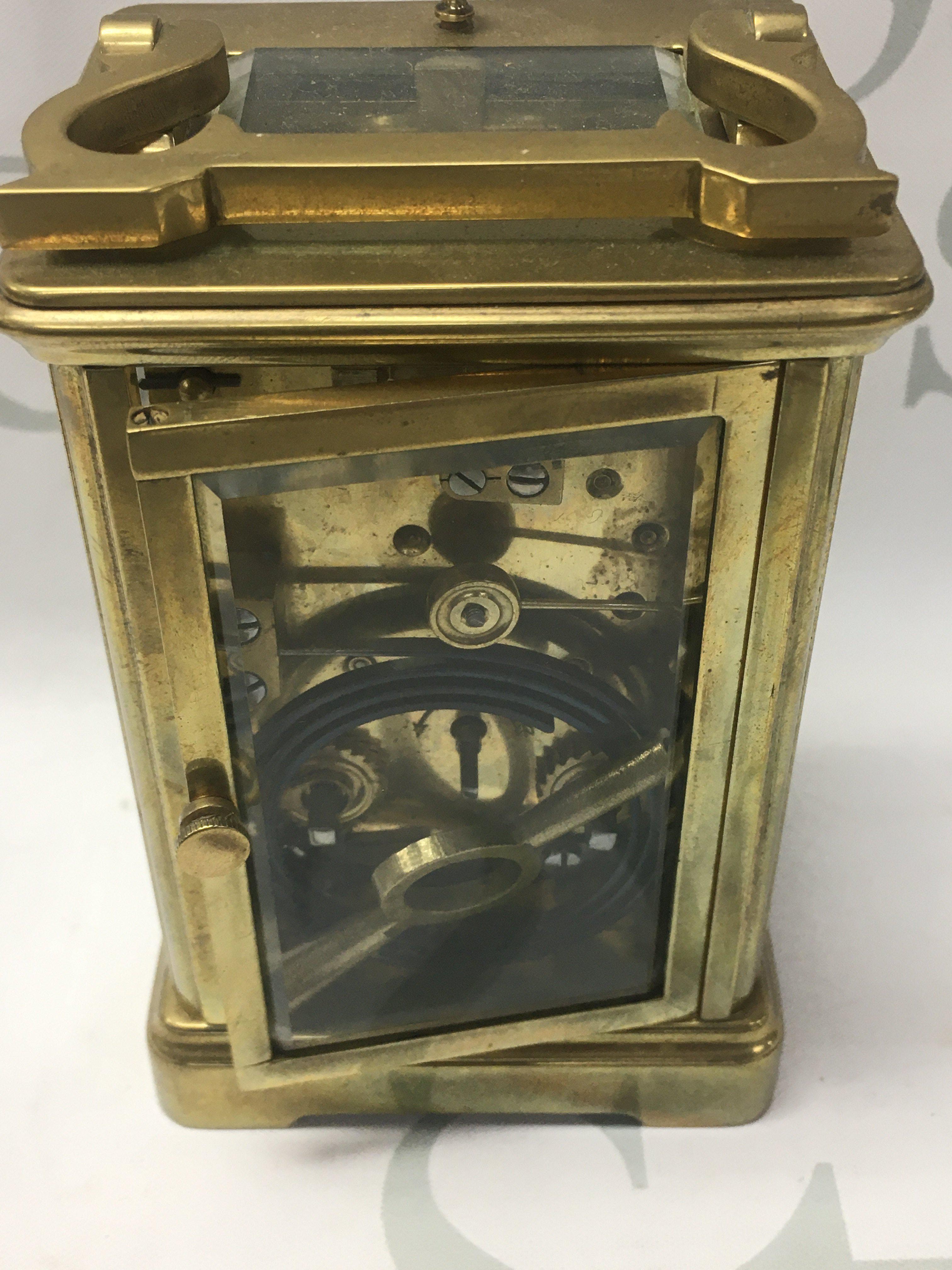 A brass carriage clock the dial with Roman numerals with repeat button movement 12 cm .