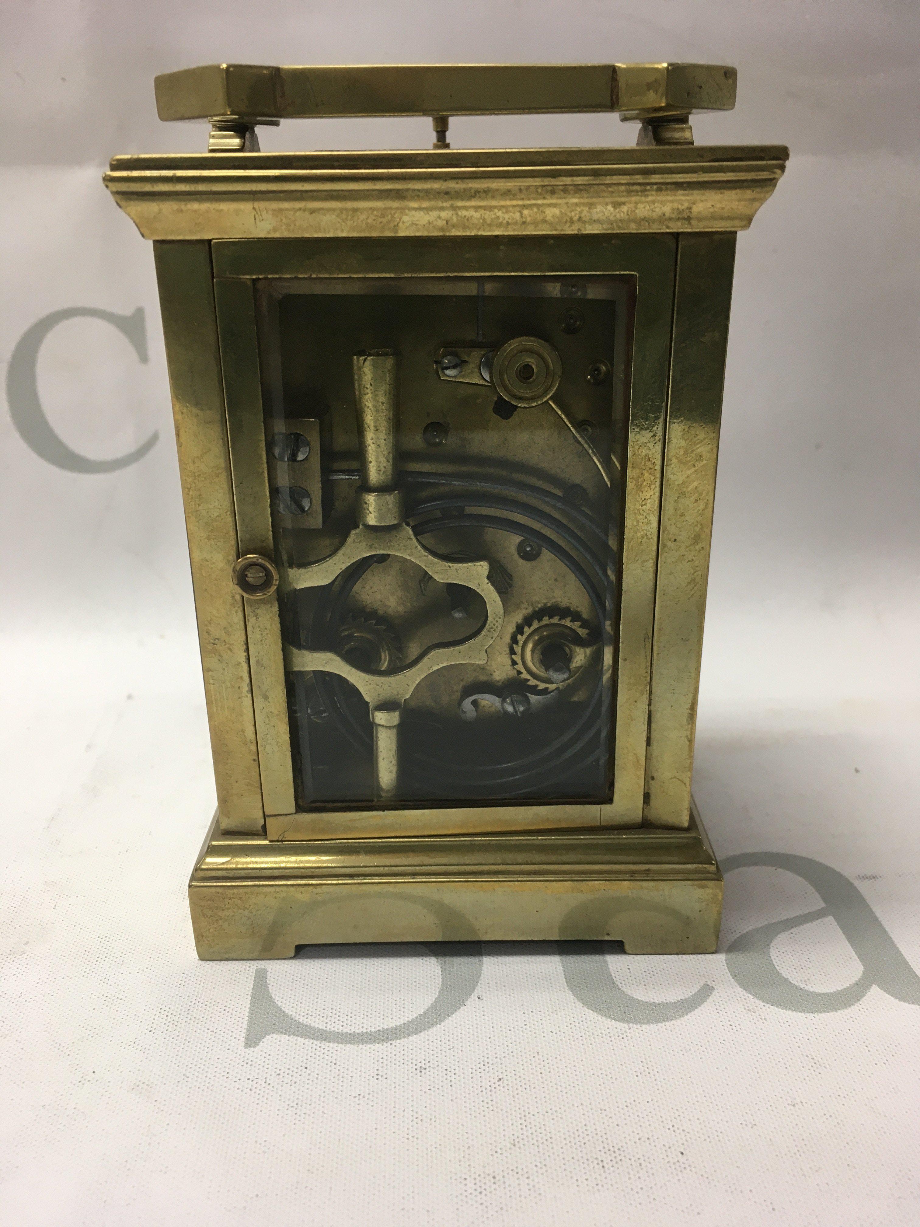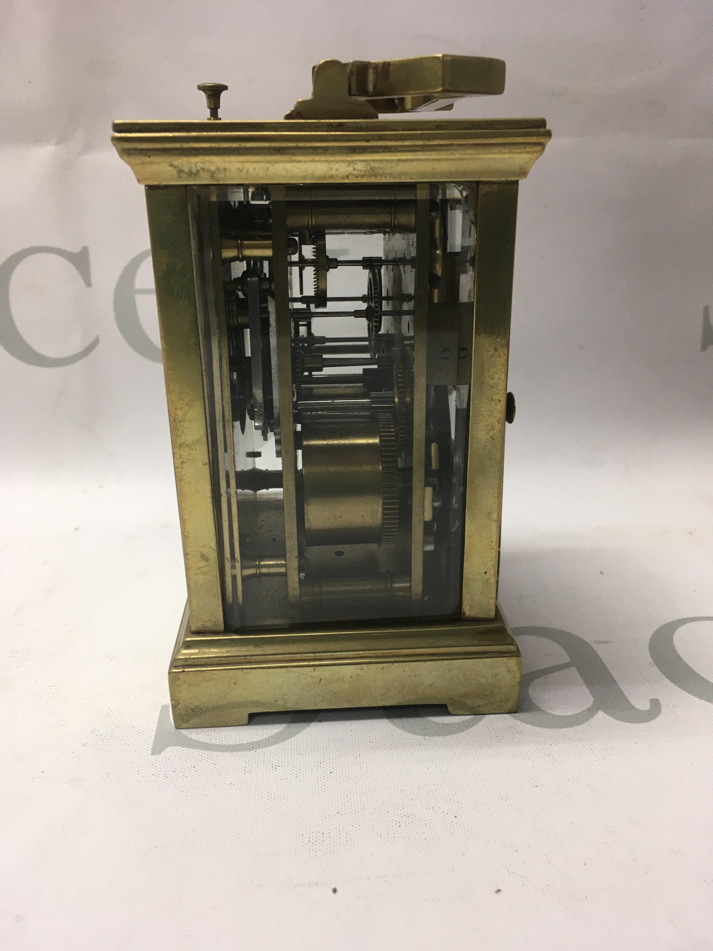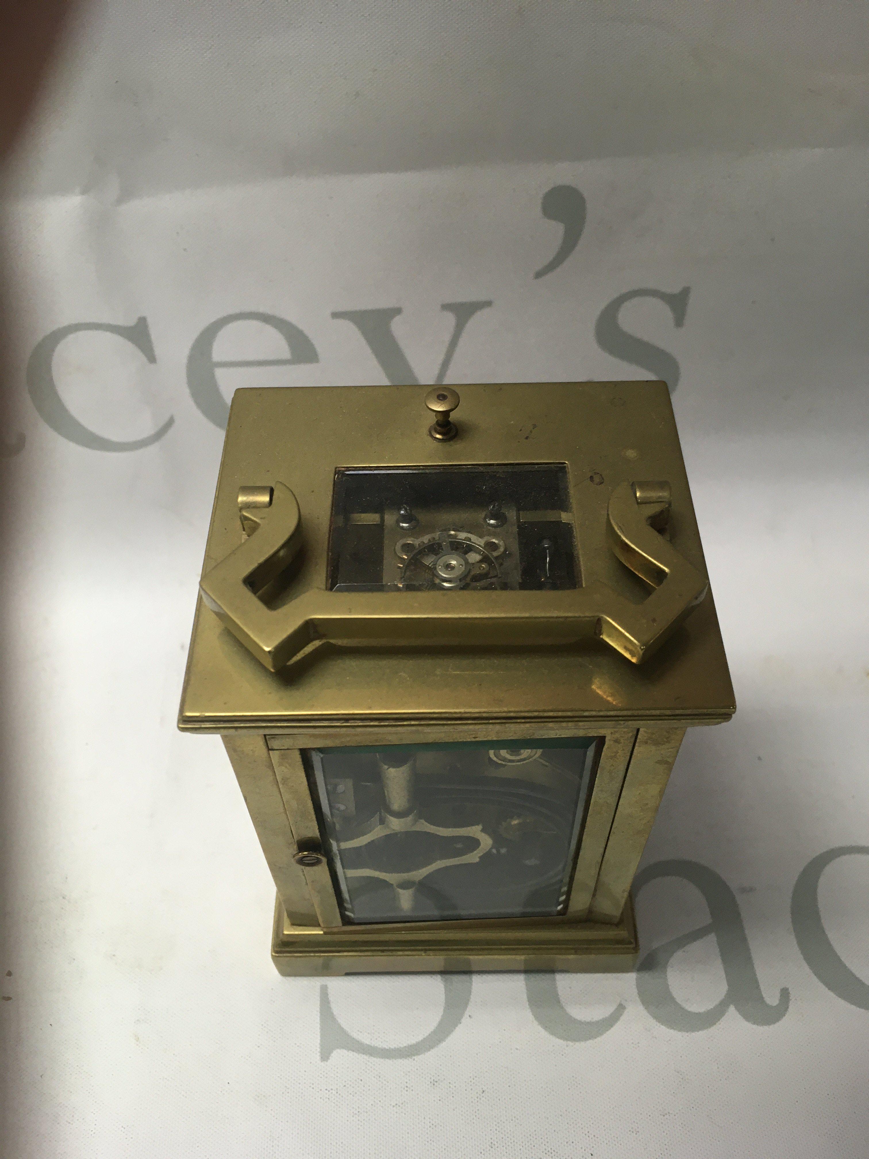 A brass carriage clock the dial with Roman numerals repeat button movement 12 cm .