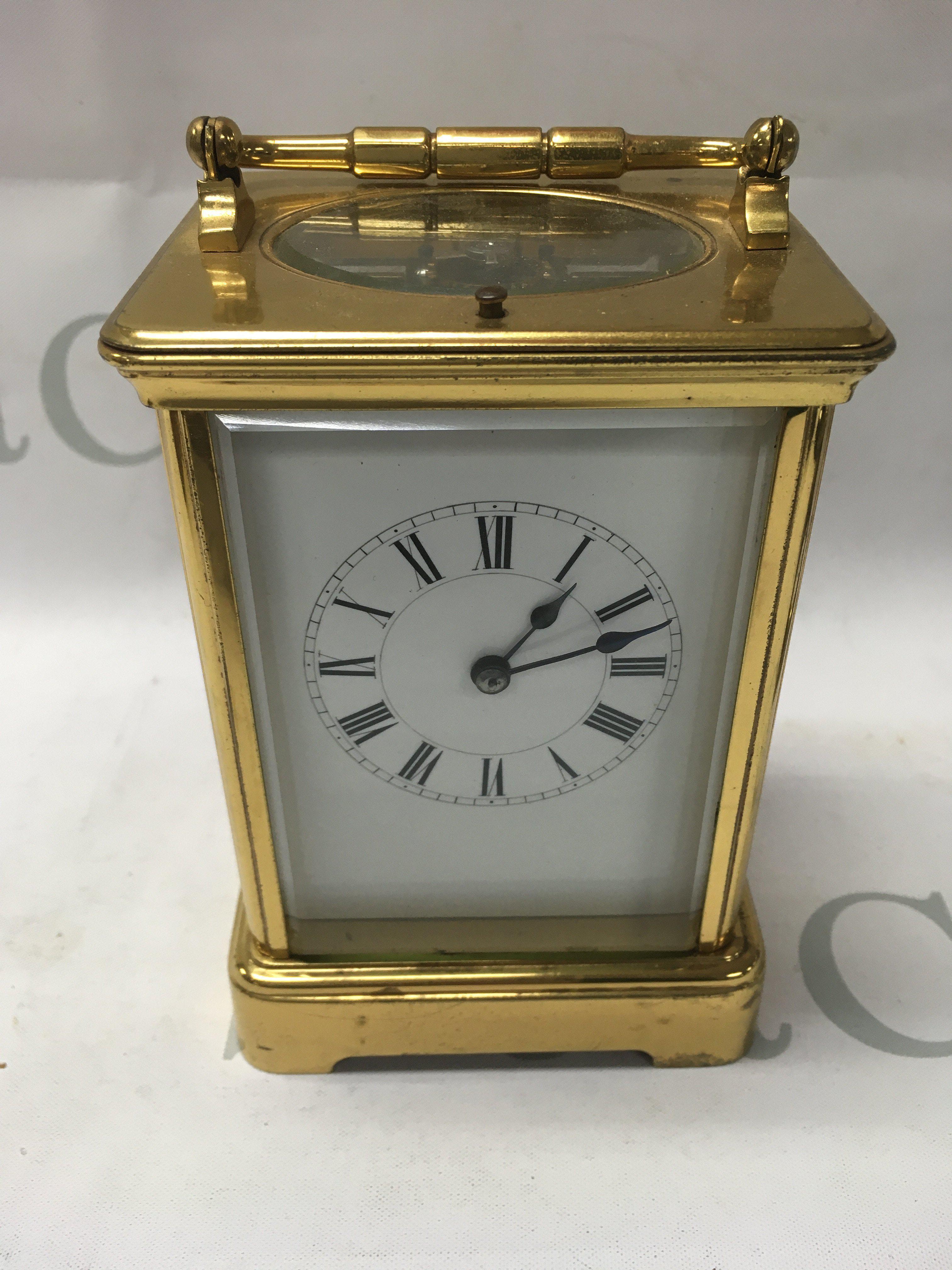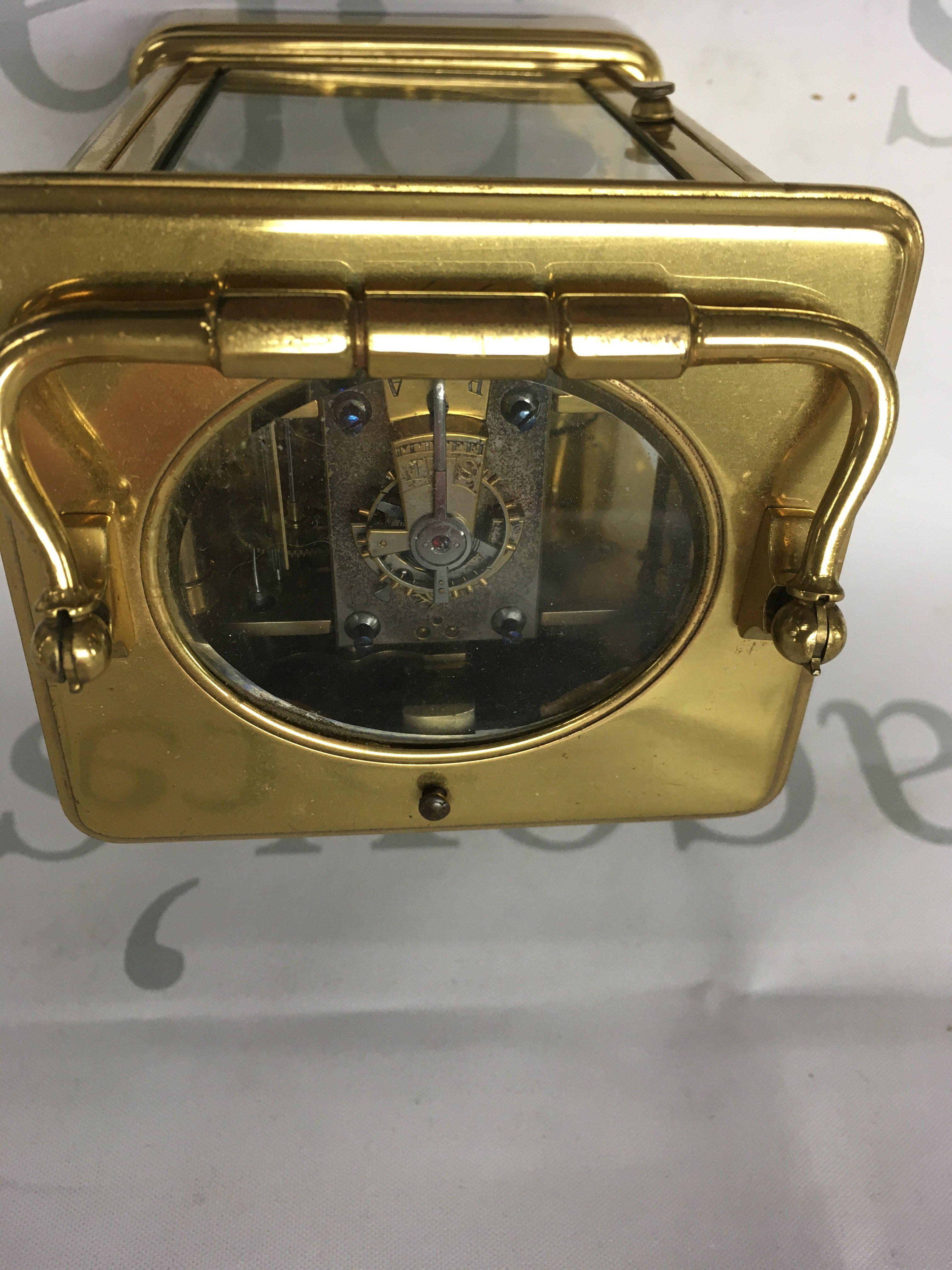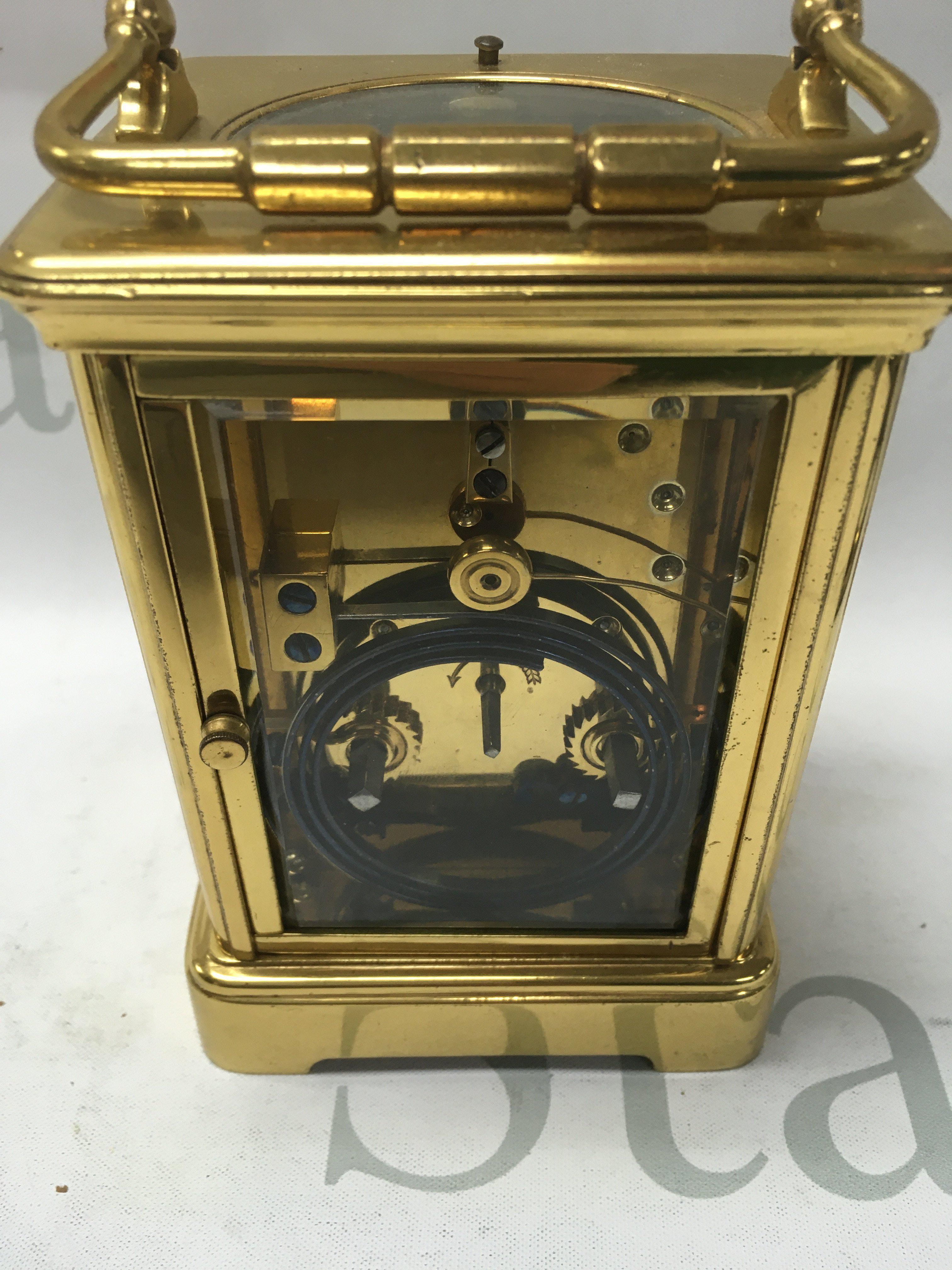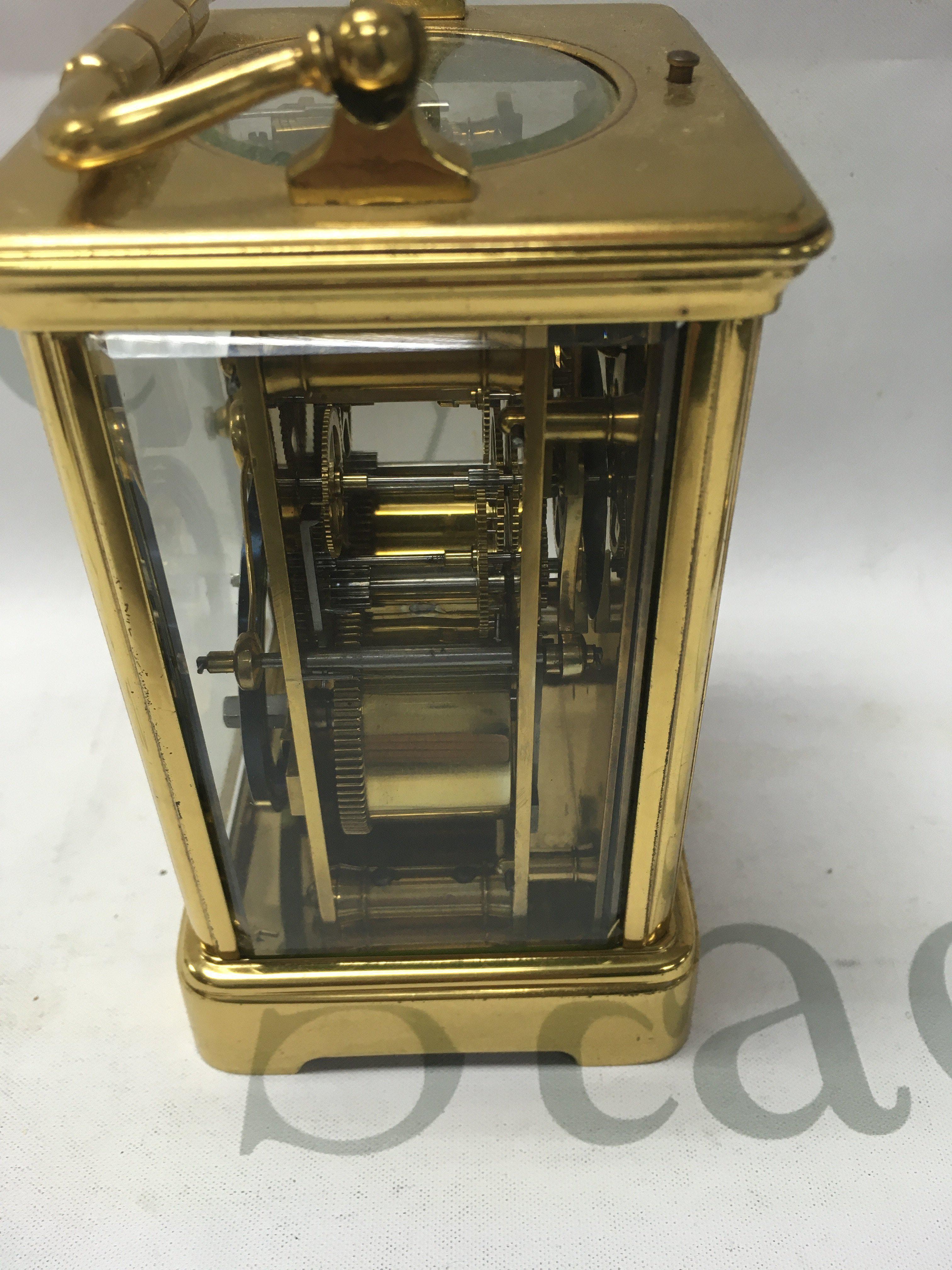 A brass case Repeat carriage clock the dial with Roman numerals .