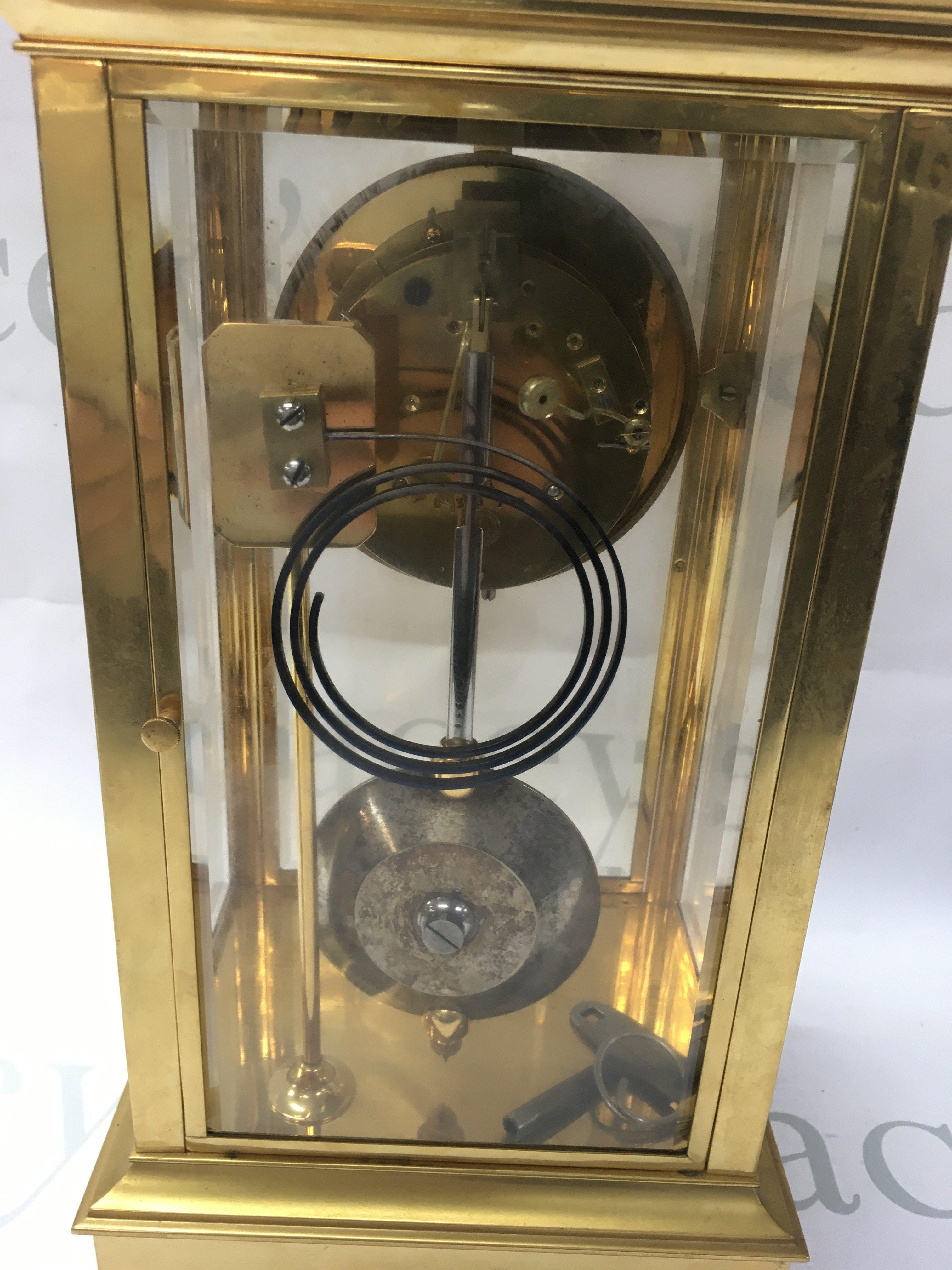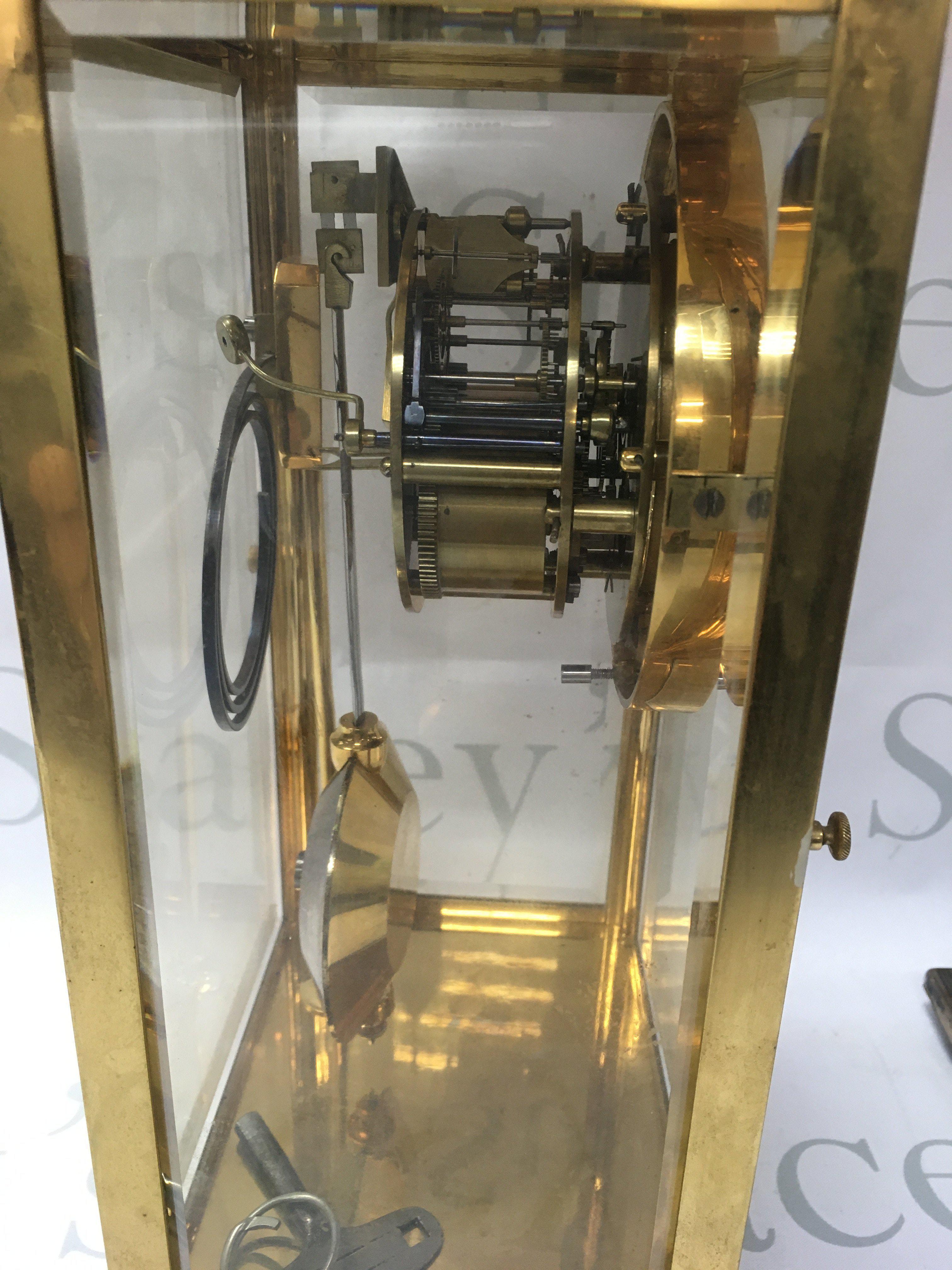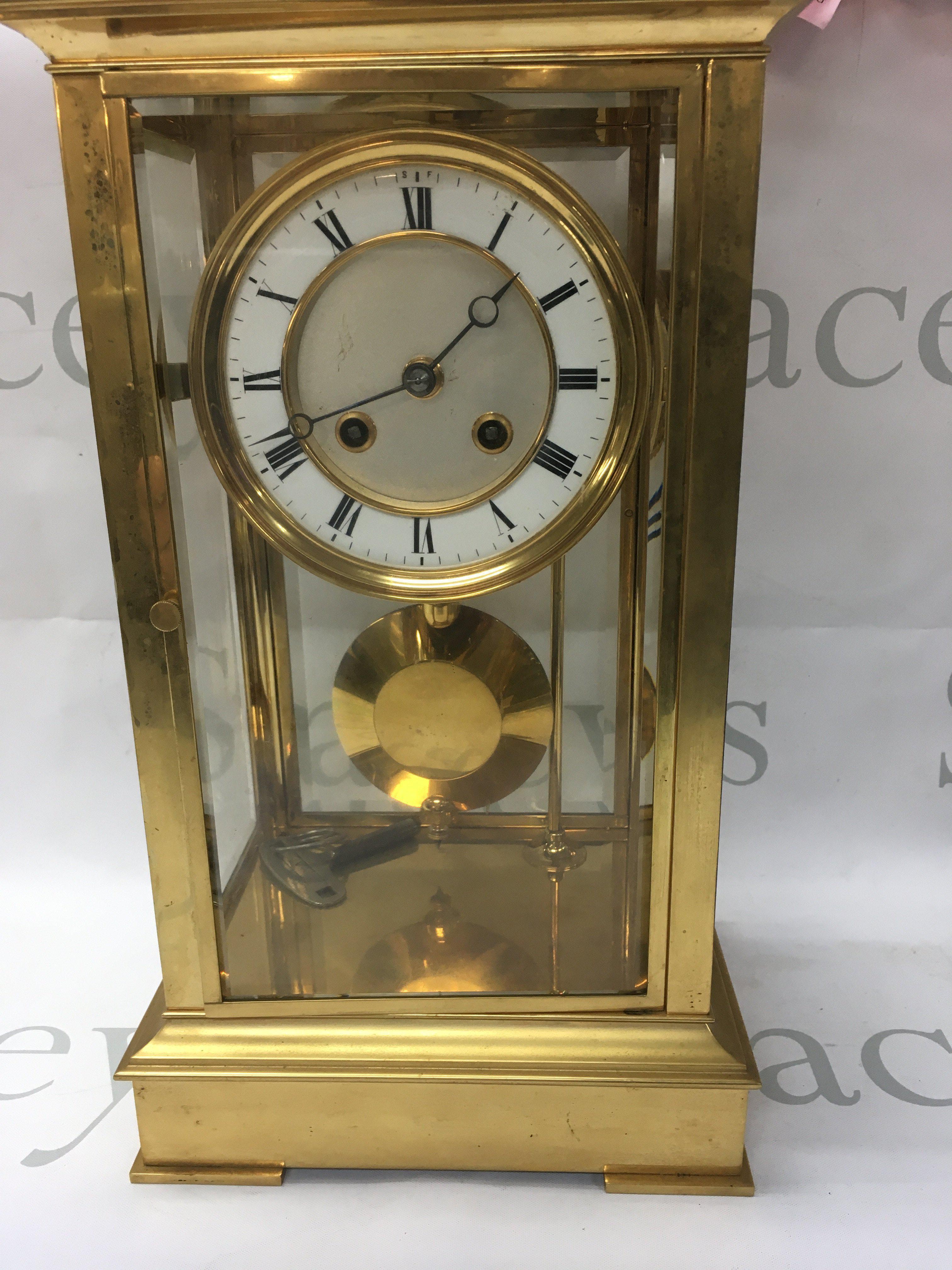 A brass four glass mantle clock the dial with Roman numerals visible pendulum striking on a gong ,