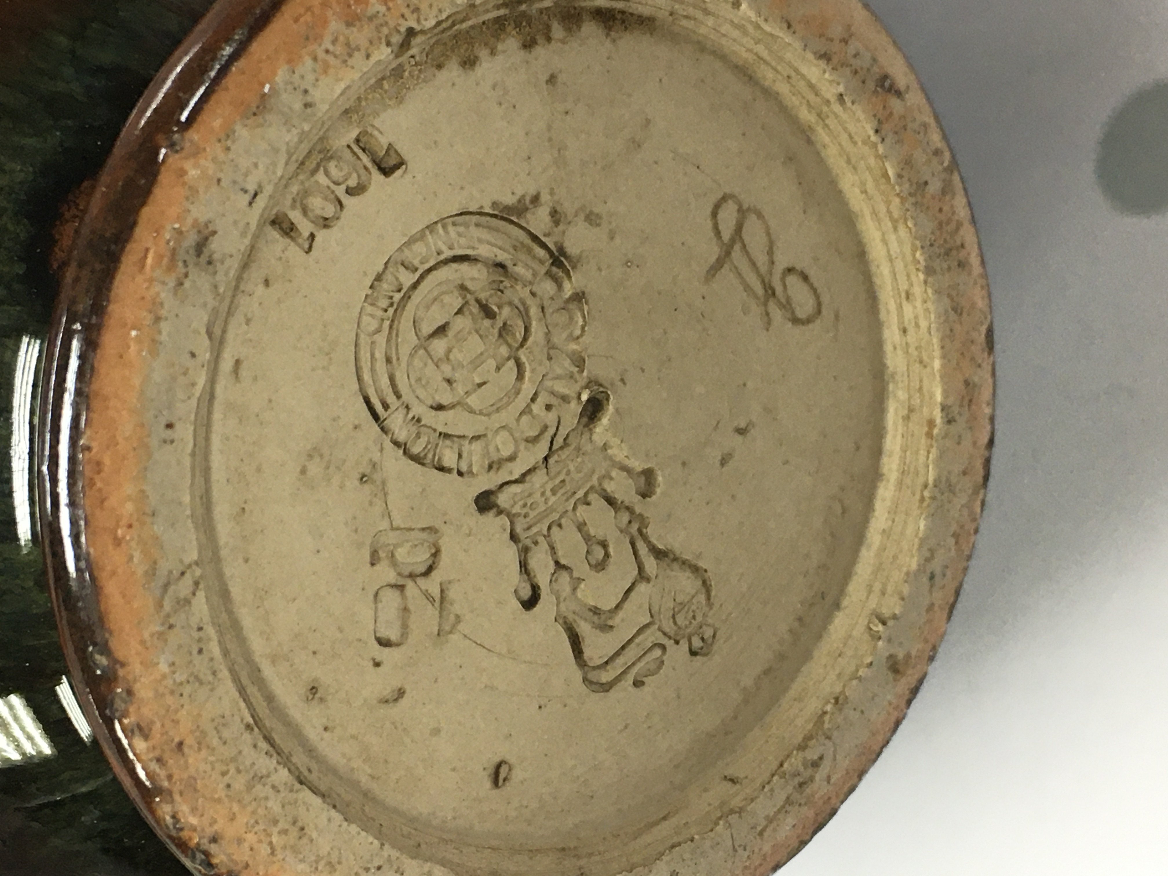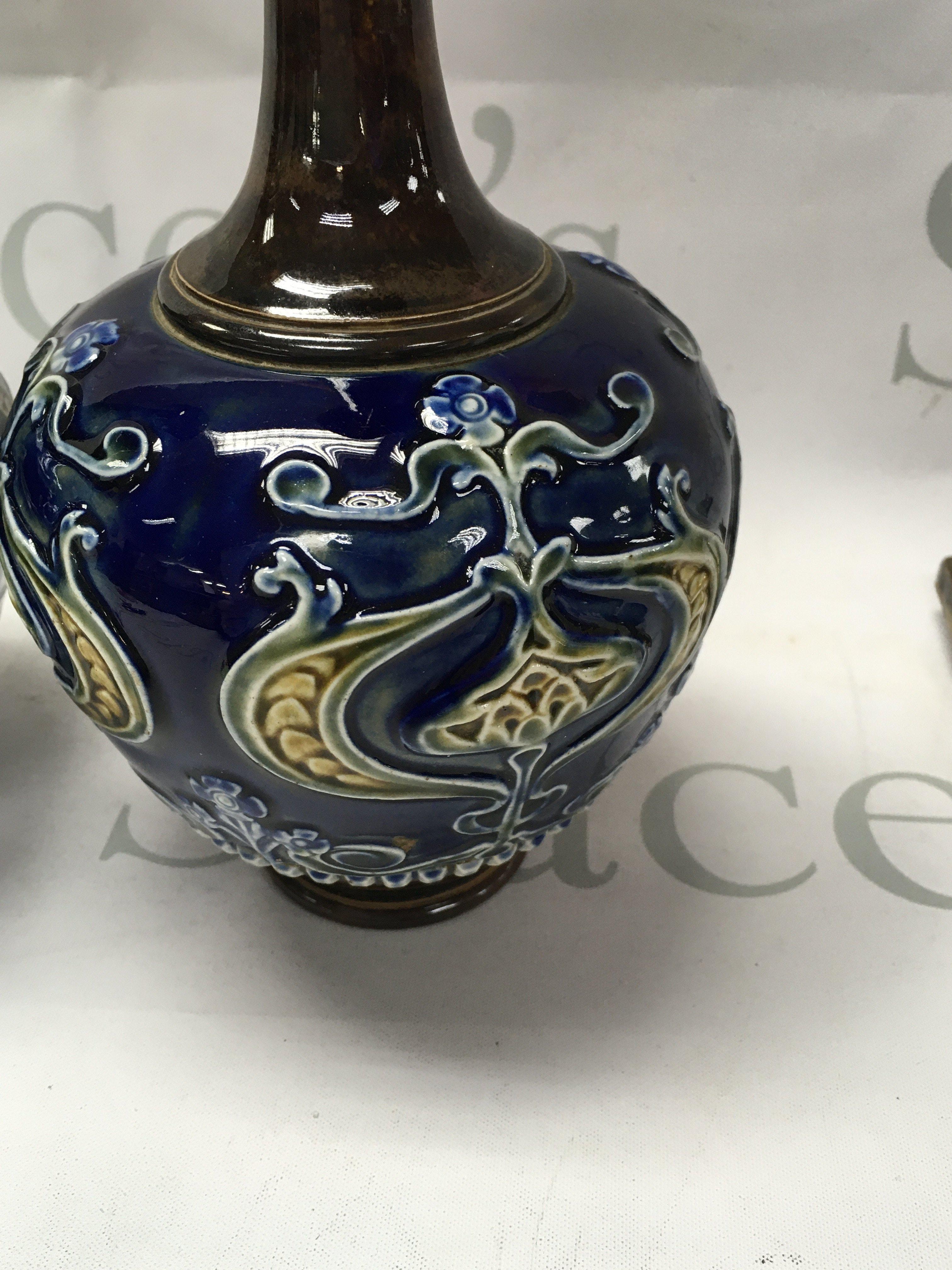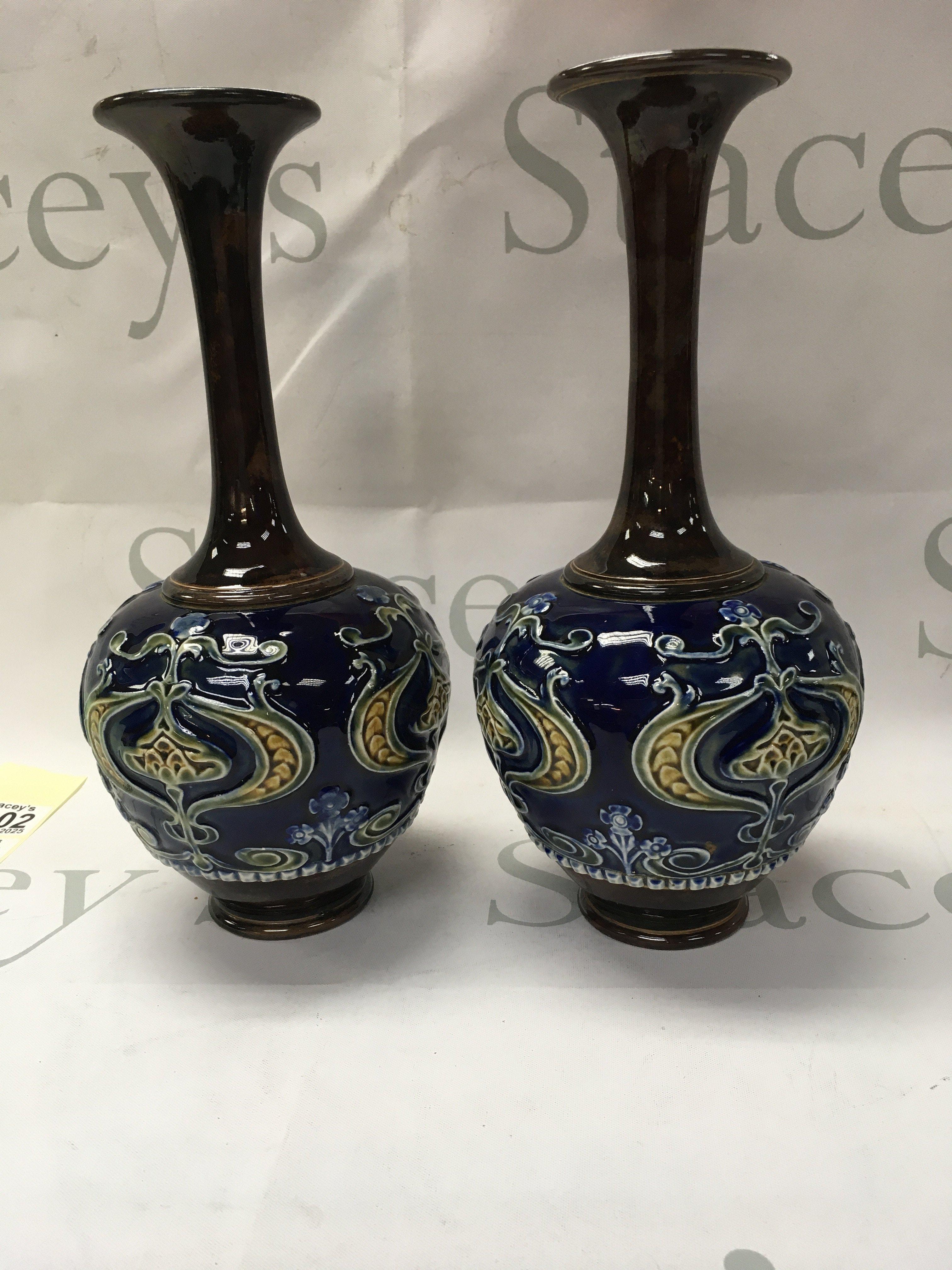 A pair of Doulton stone ware vases decorated with stylised flower motifs 26 cm no damage or restoration,