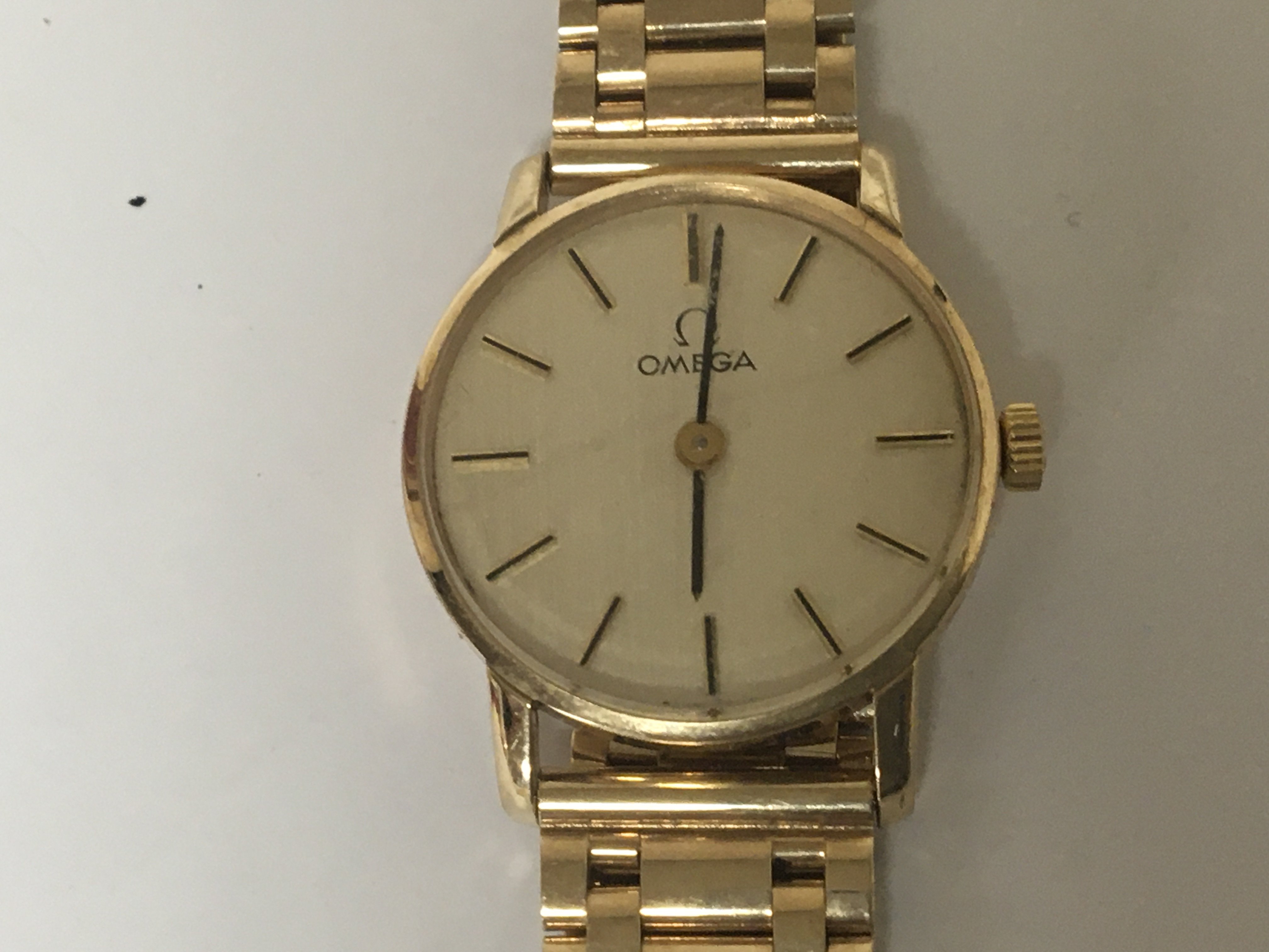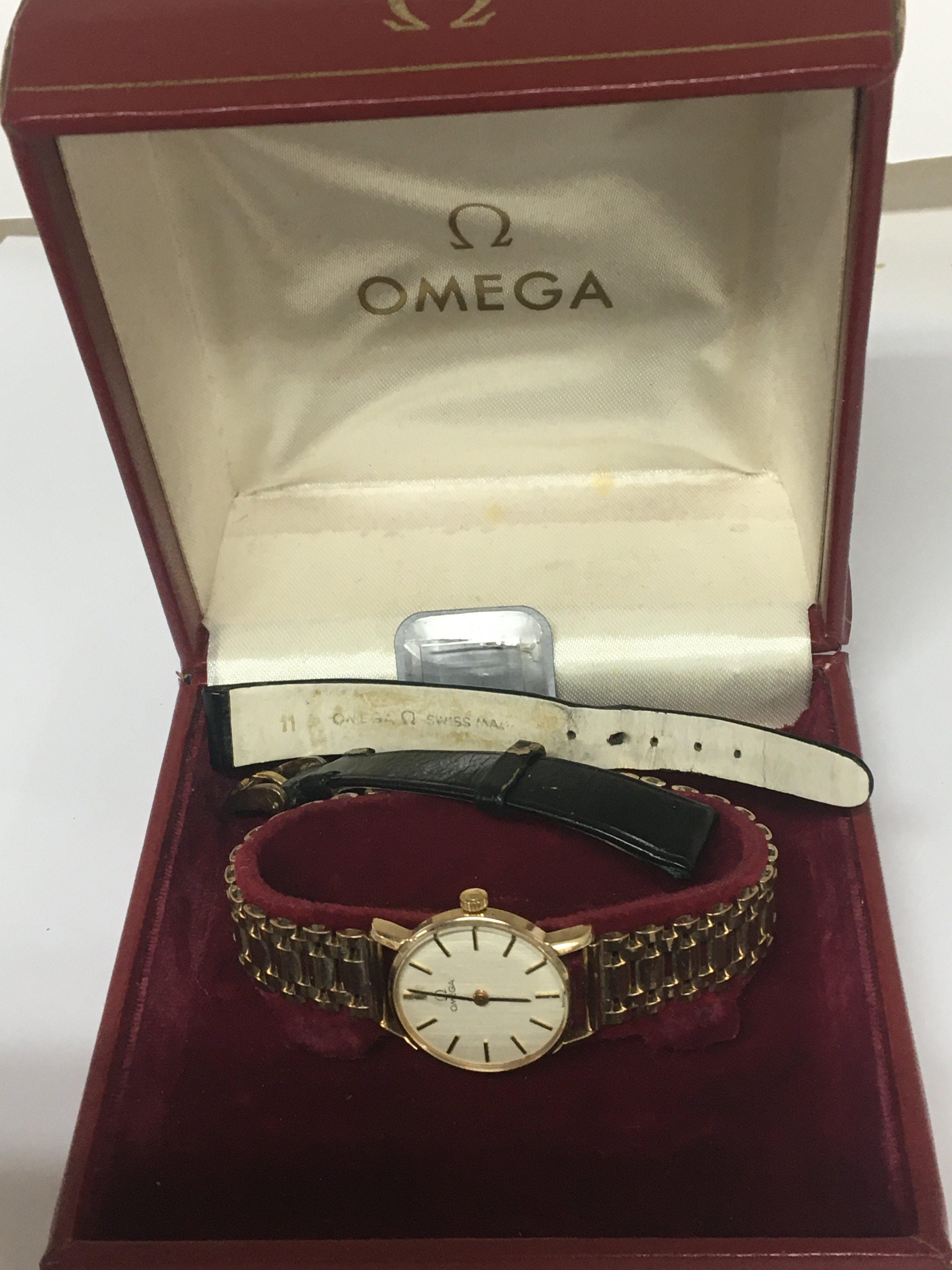 A ladies 9carat gold Omega Watch with attached gold chain in a fitted box with replacement omega leather strap. Total watch weight 29g