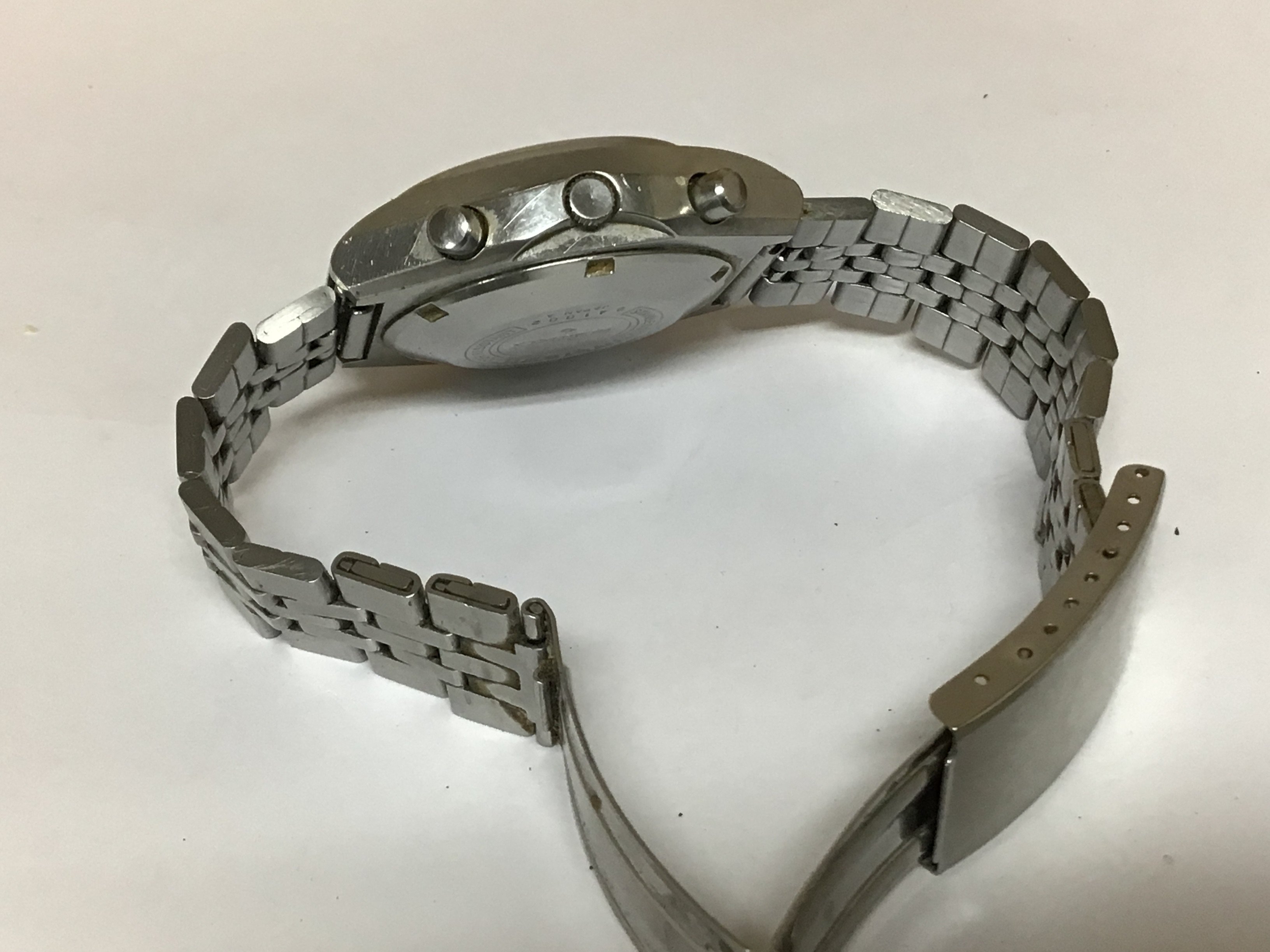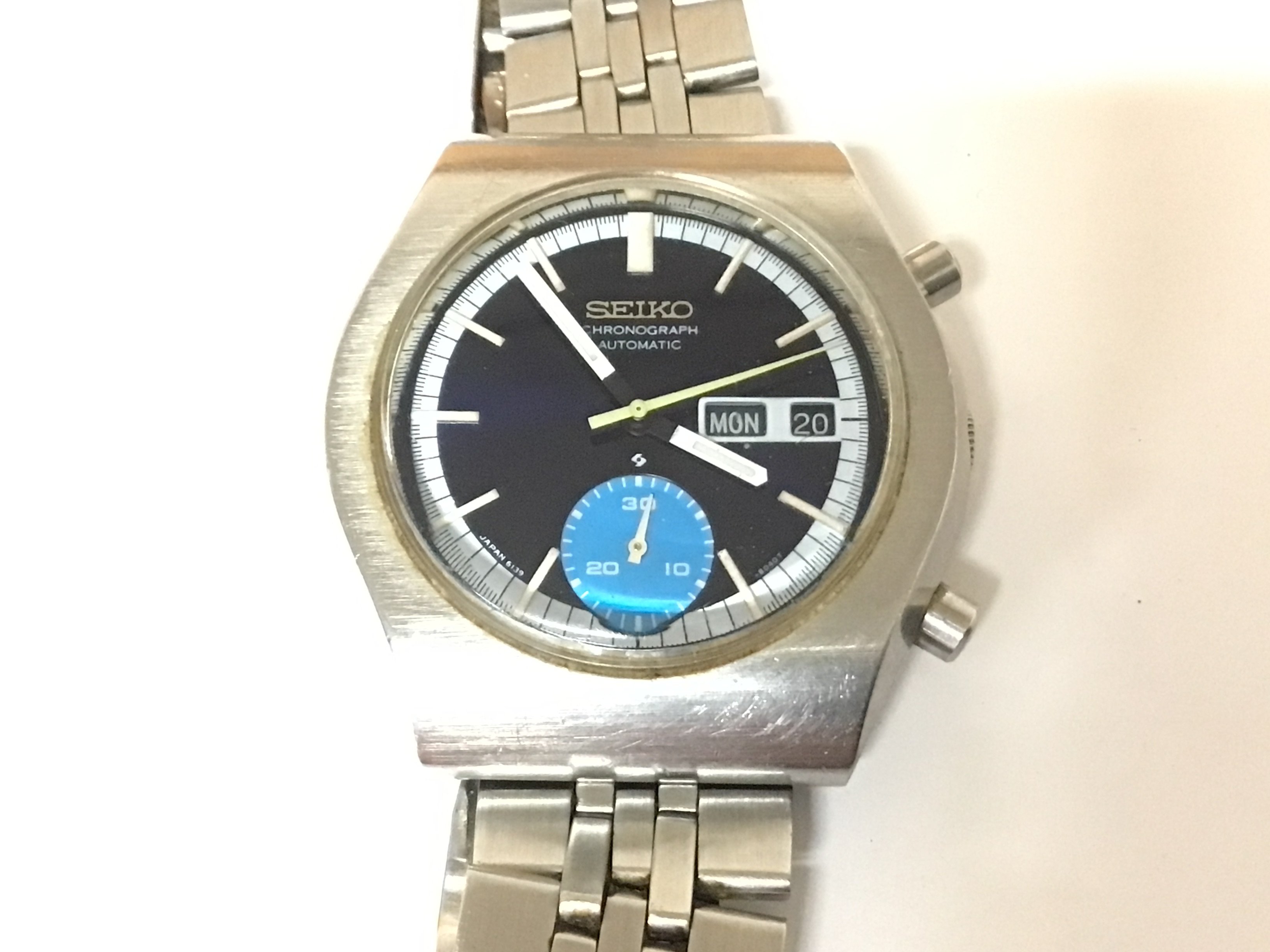 A Vintage early 1970 Seiko Chronograph Automatic watch with day date and slightly unusual deep blue and pale blue subsidiary dial model 6139-8020 serial number 241002 watch seen working and in good condition for age few very minor scratches.