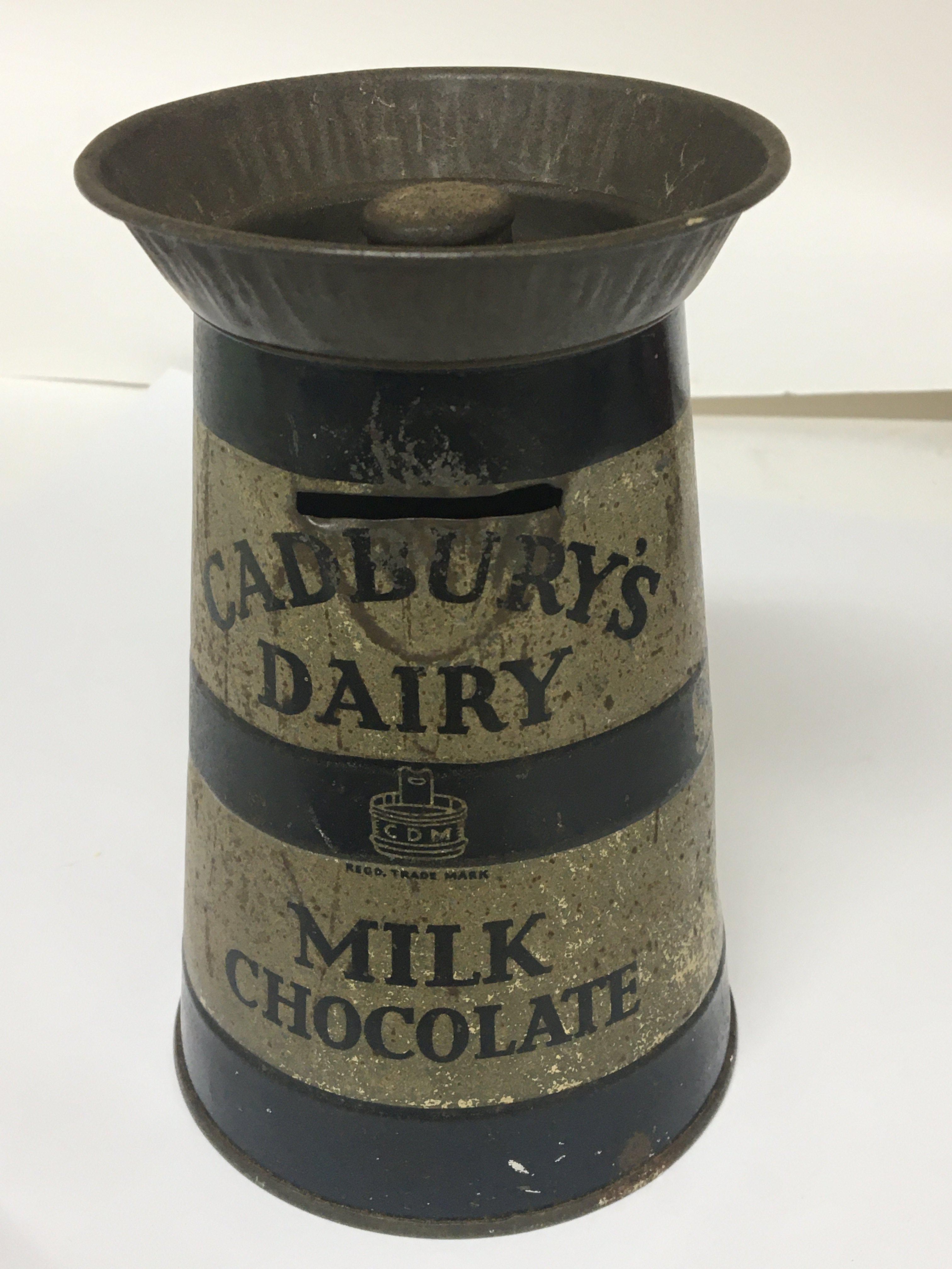 A Vintage Cadburys Dairy Milk Chocolate money box tin in the form of a decorated milk churn. Hight 14cm