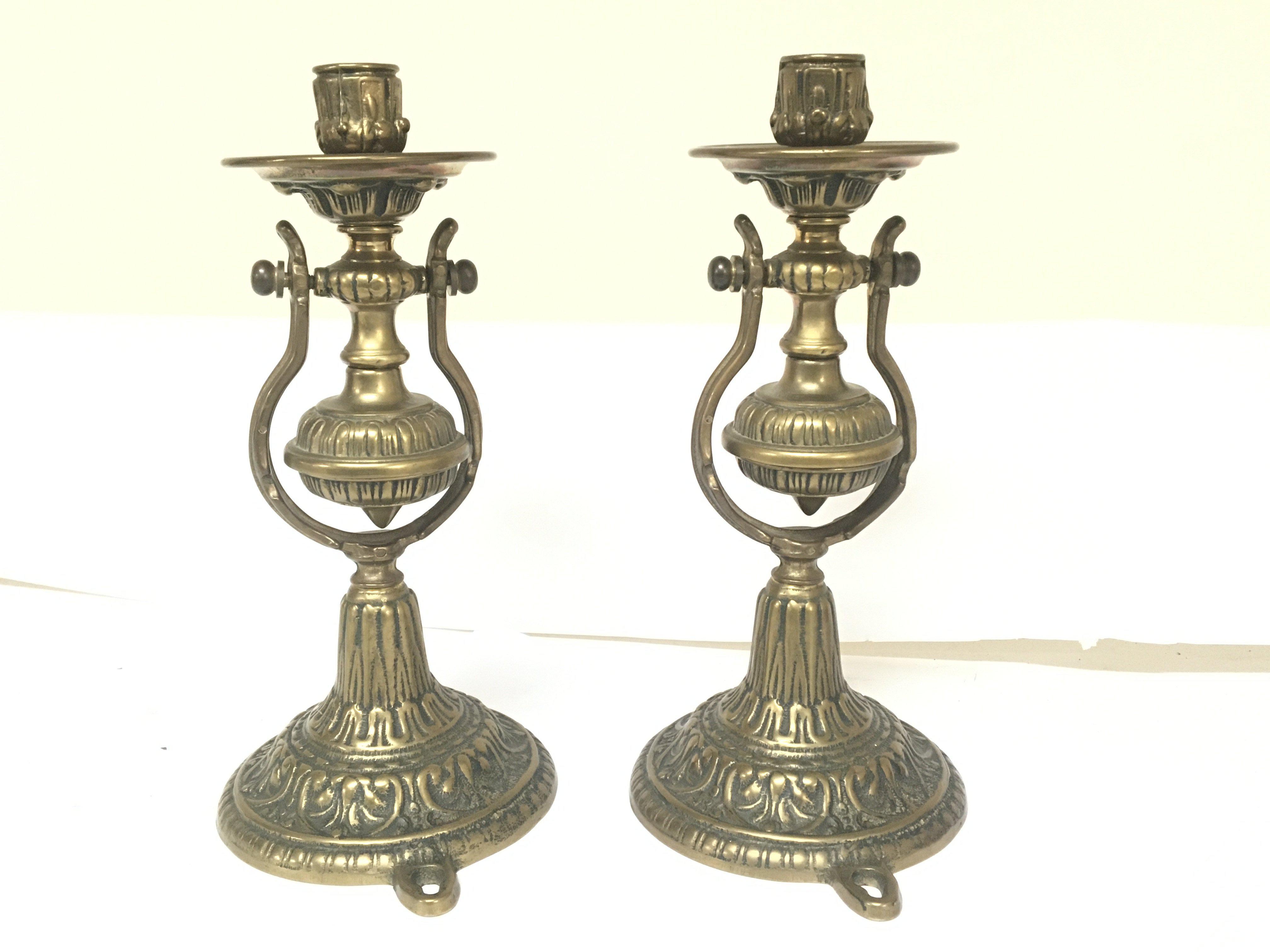 A pair of brass ships candle sticks the candle holder in a swing gimbal. Height 26cm