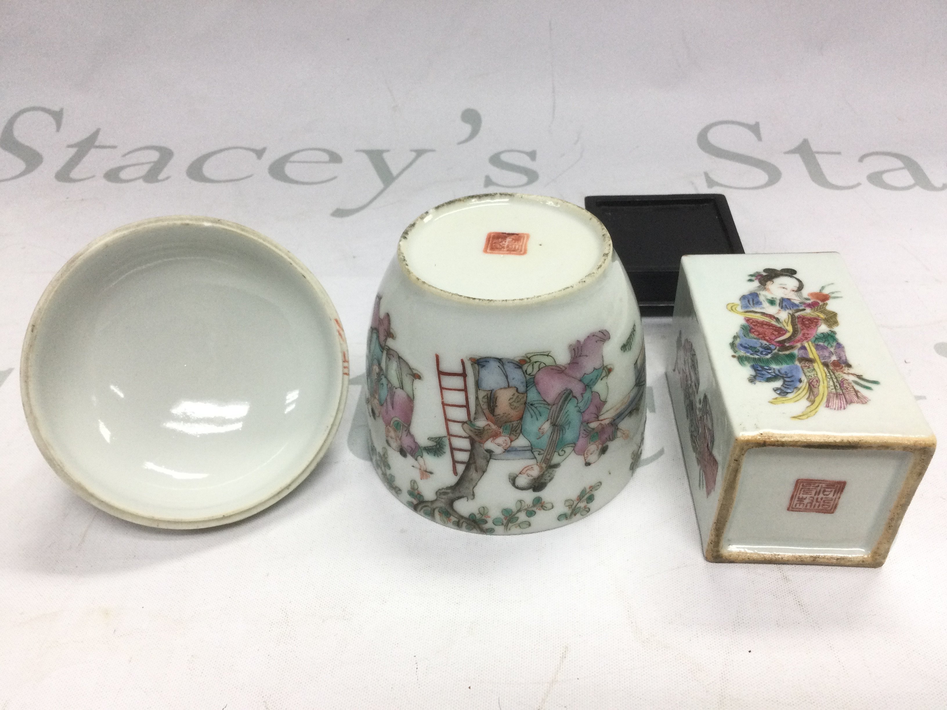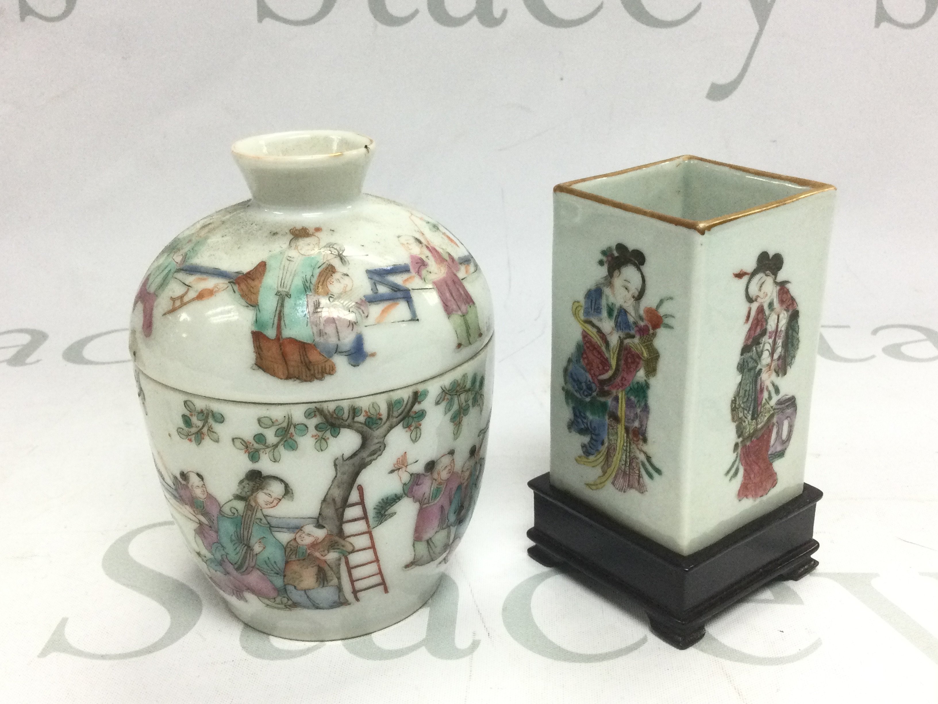A small brush pot of squared form decorated with geishas and raised on a hardwood stand plus a jar and cover decorated with various figures, appro height 11.5cm (2). Shipping category D.