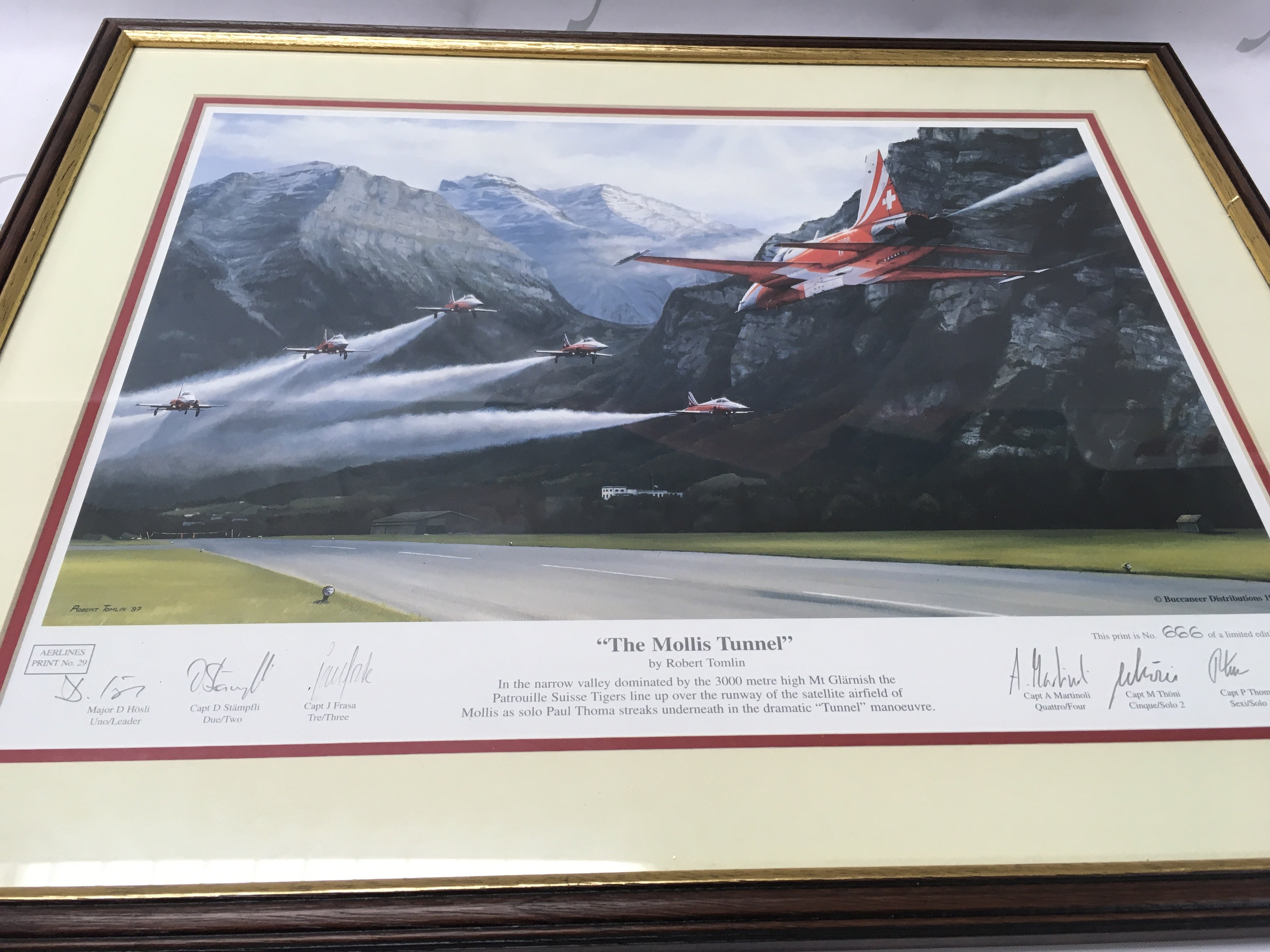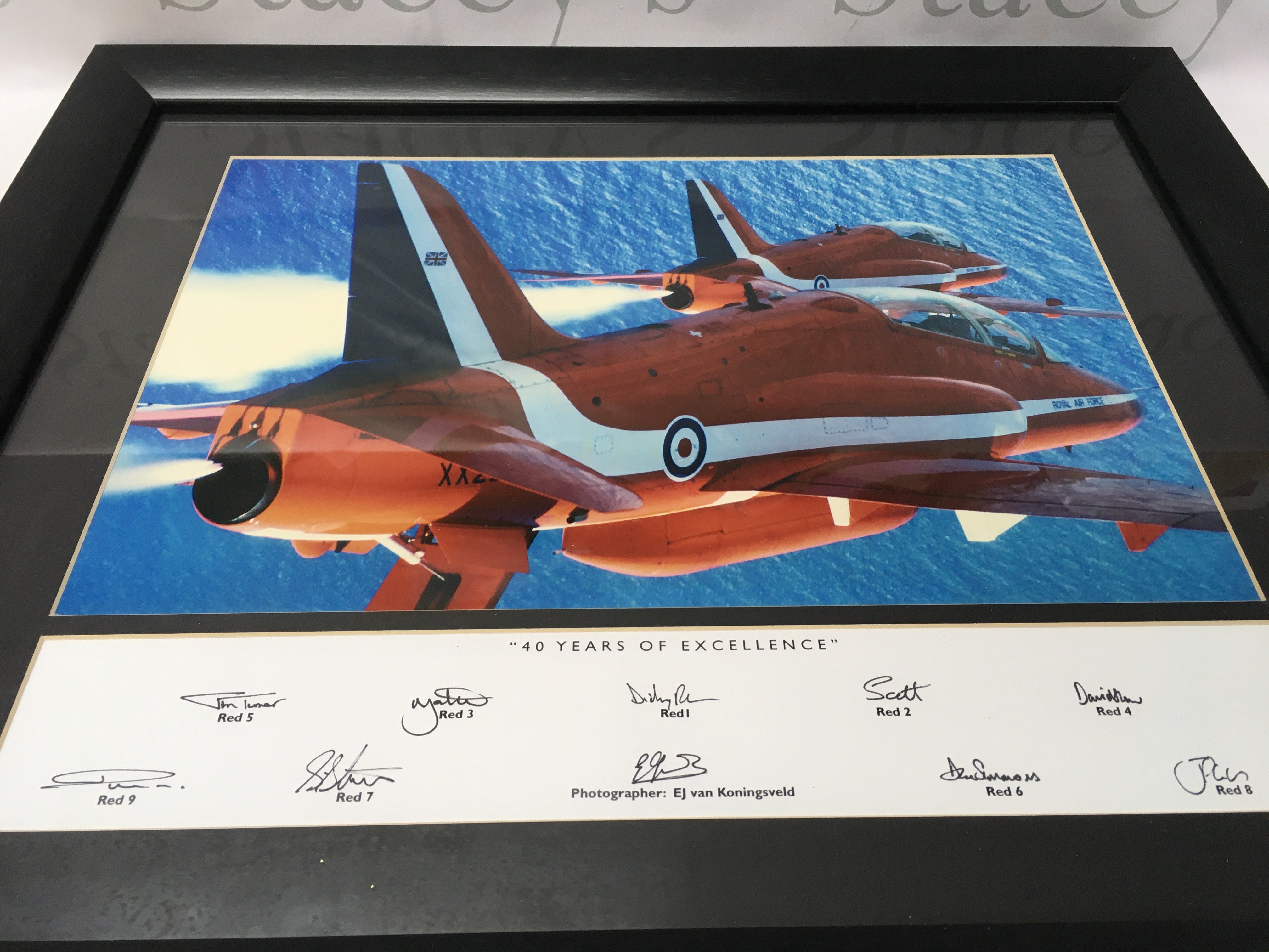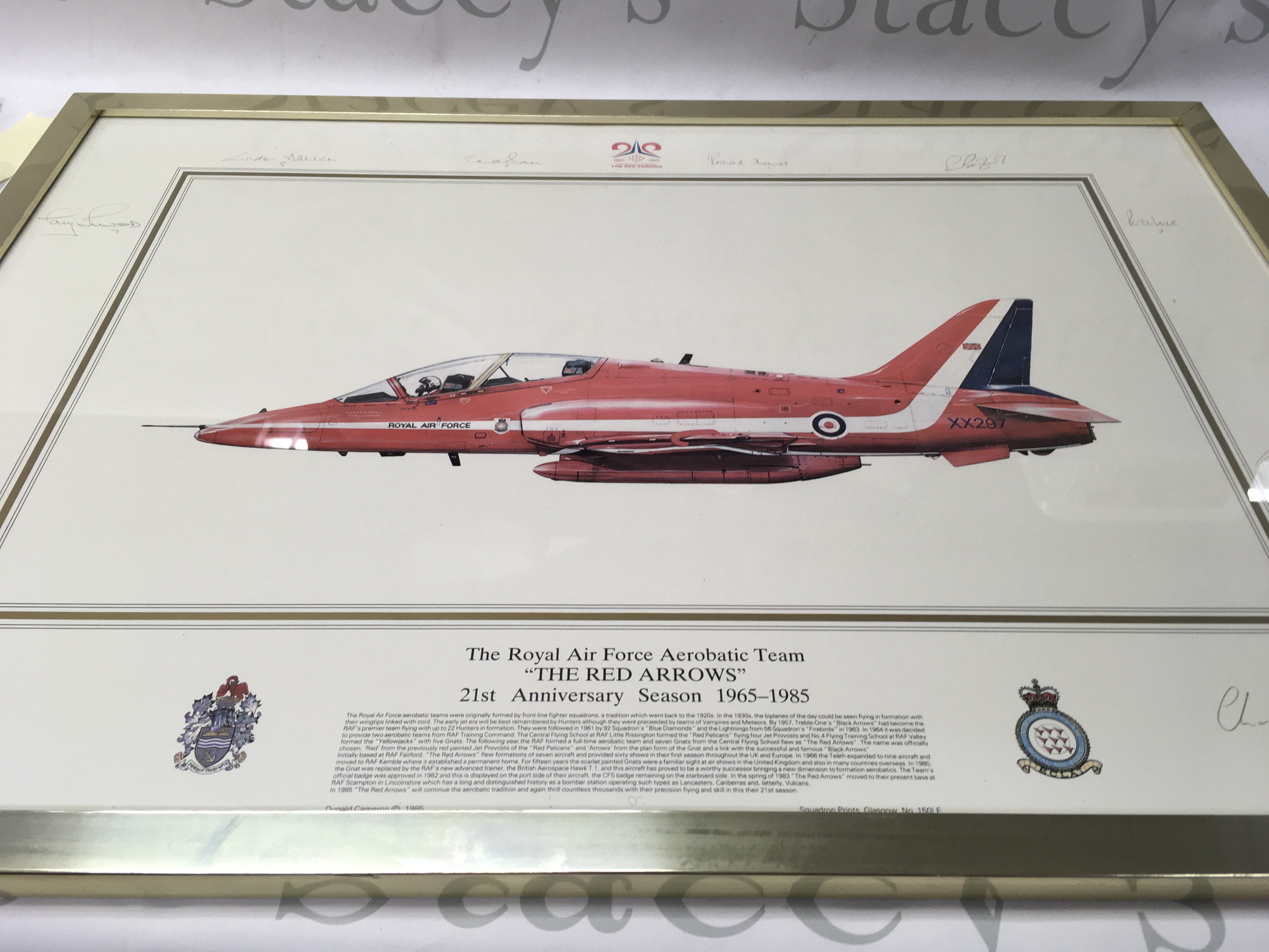 A collection of signed and framed red arrow prints in various sizes.