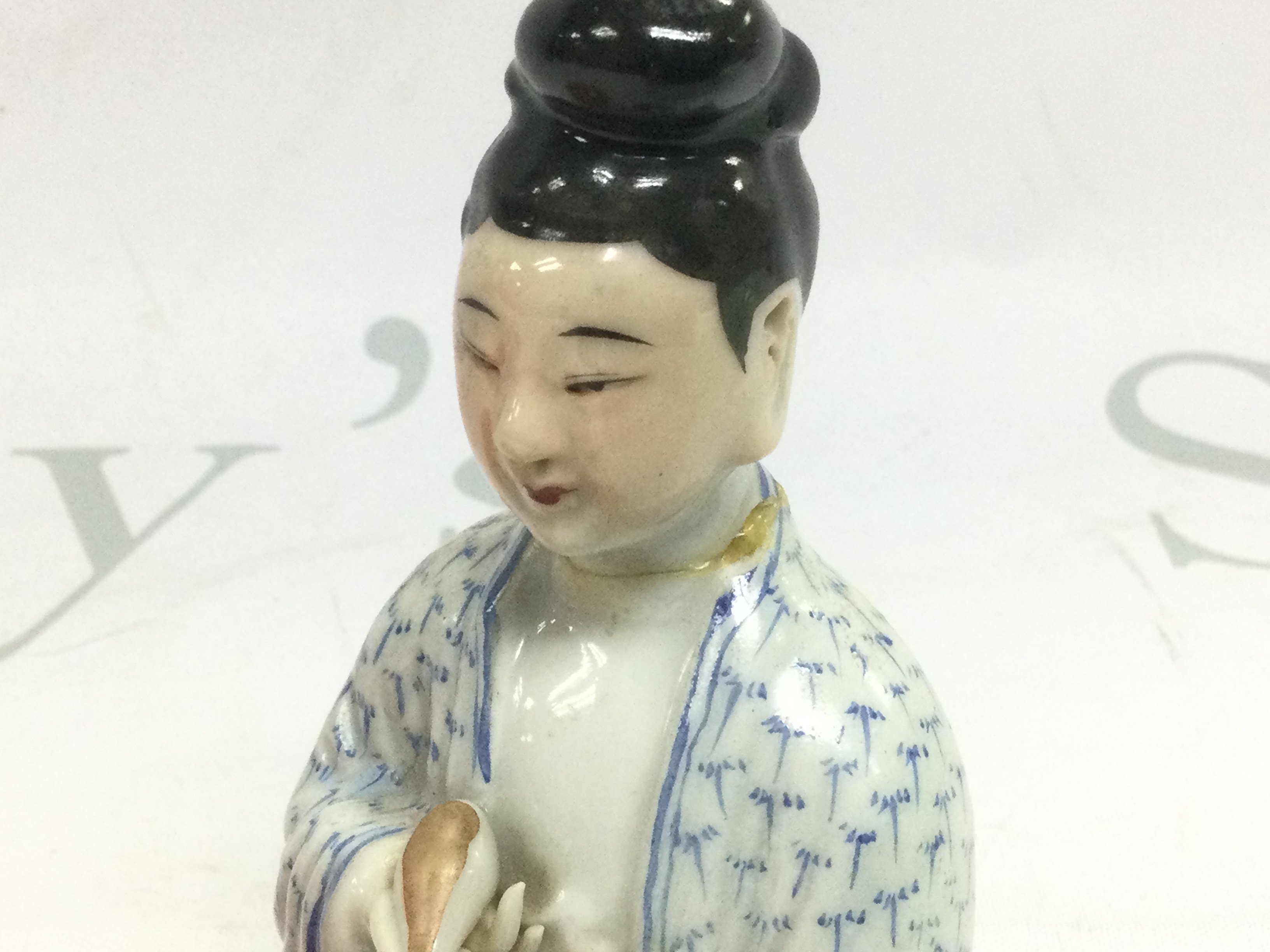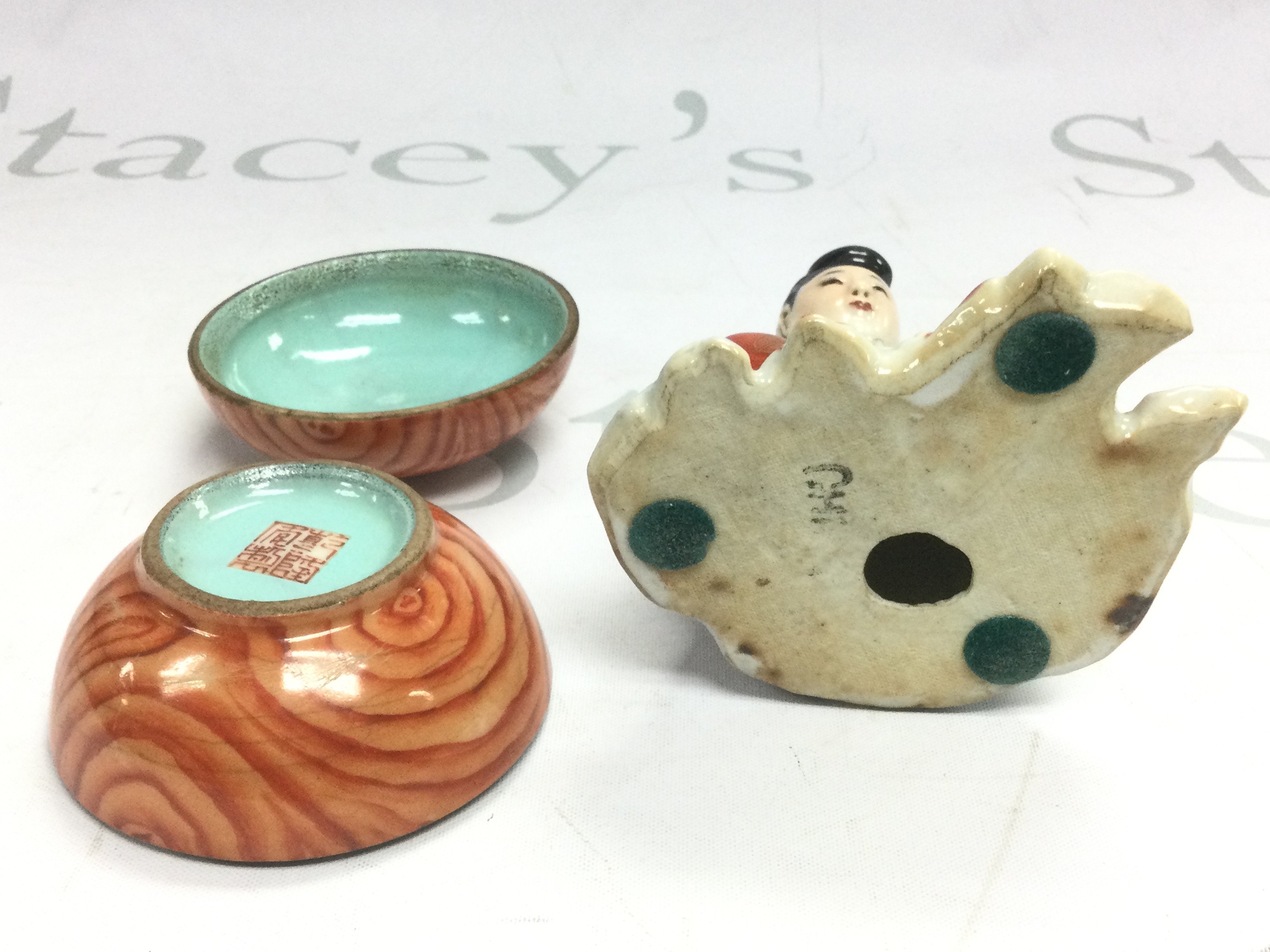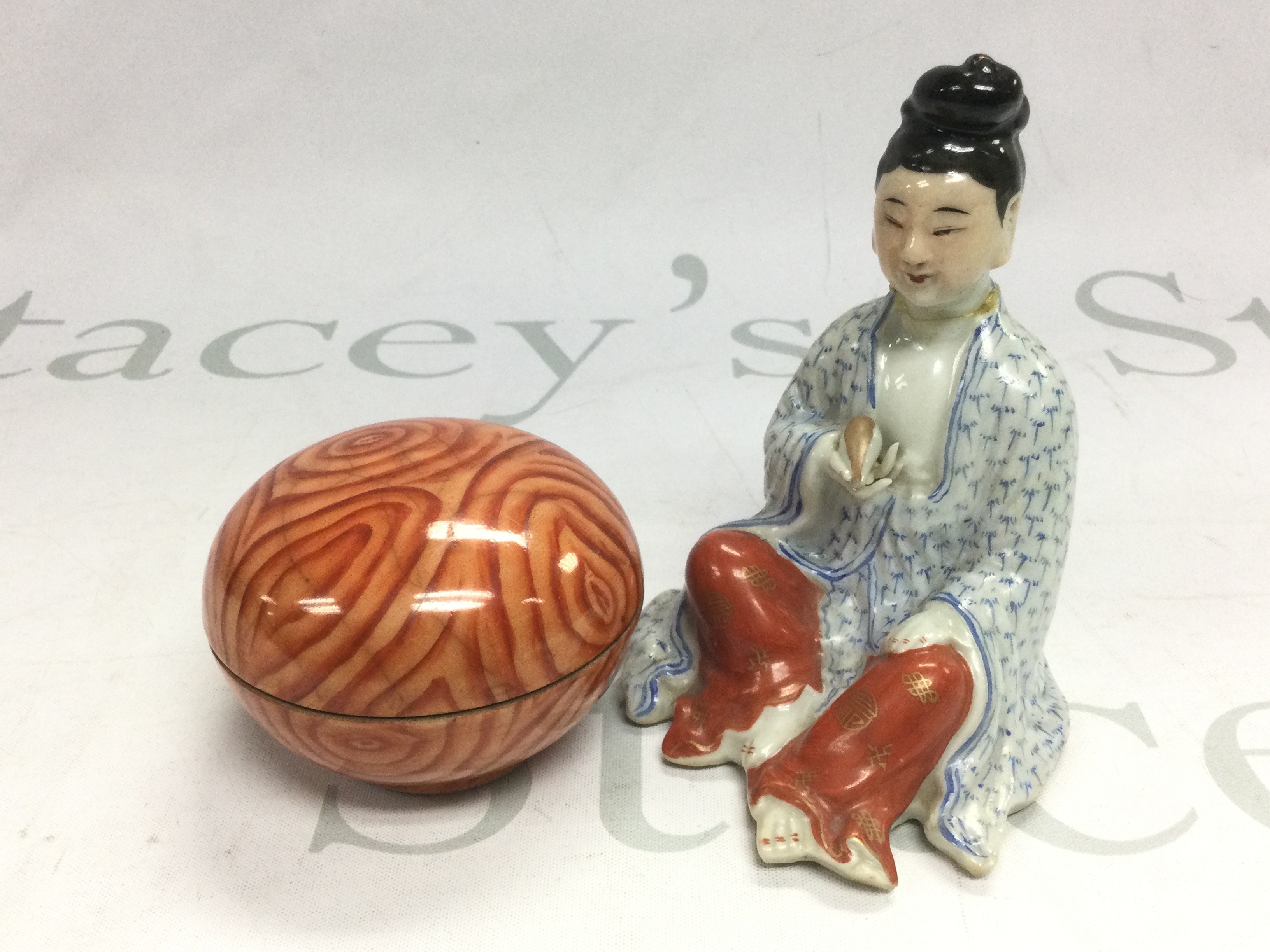 A small circular box and cover plus an Oriental figure, approx 11.5cm a/f. Shipping category D.