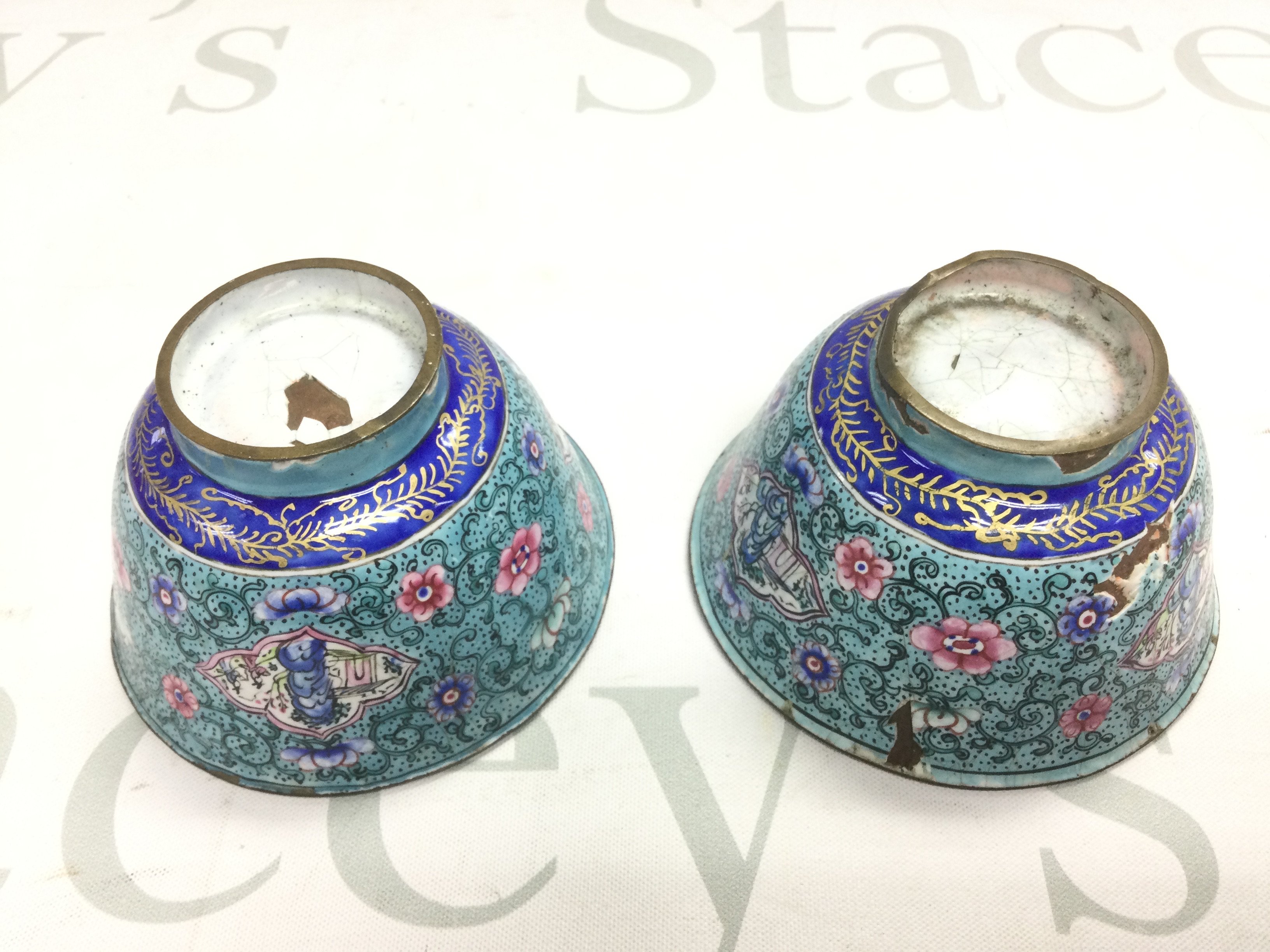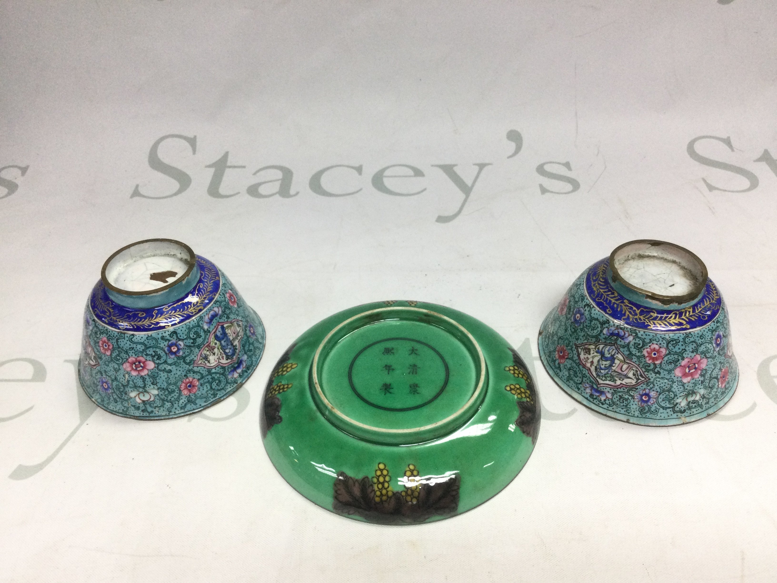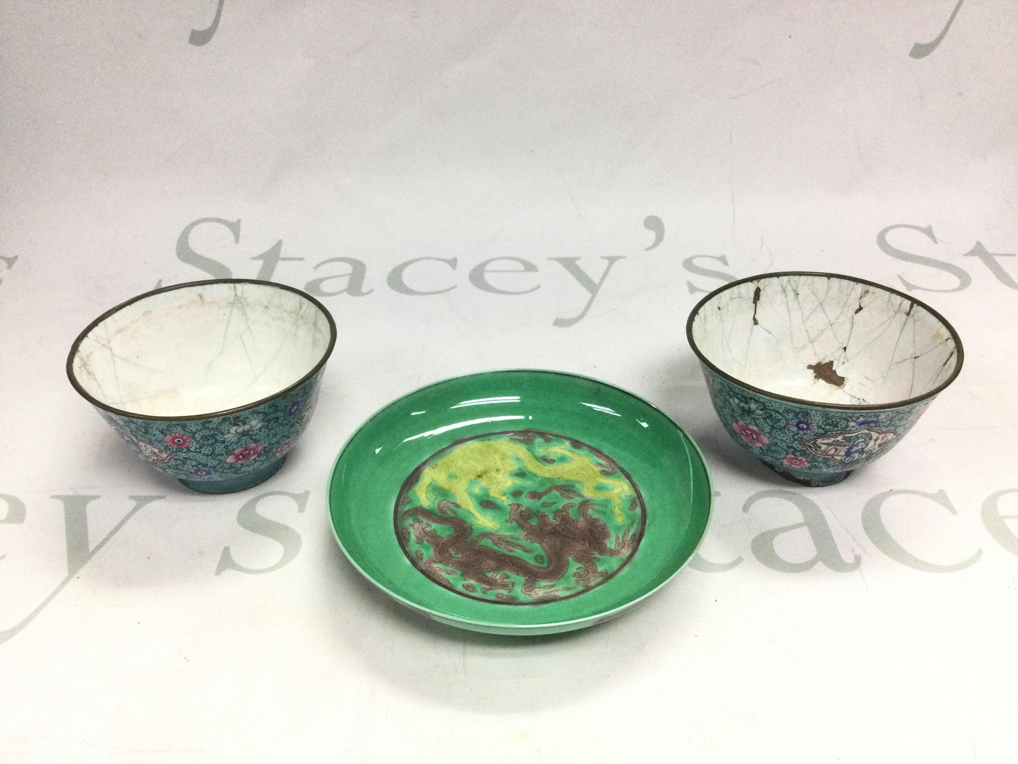 Two enamel tea bowls and an Oriental ceramic dish decorated with dragons, approx width 12.5cm (3). Shipping category D.