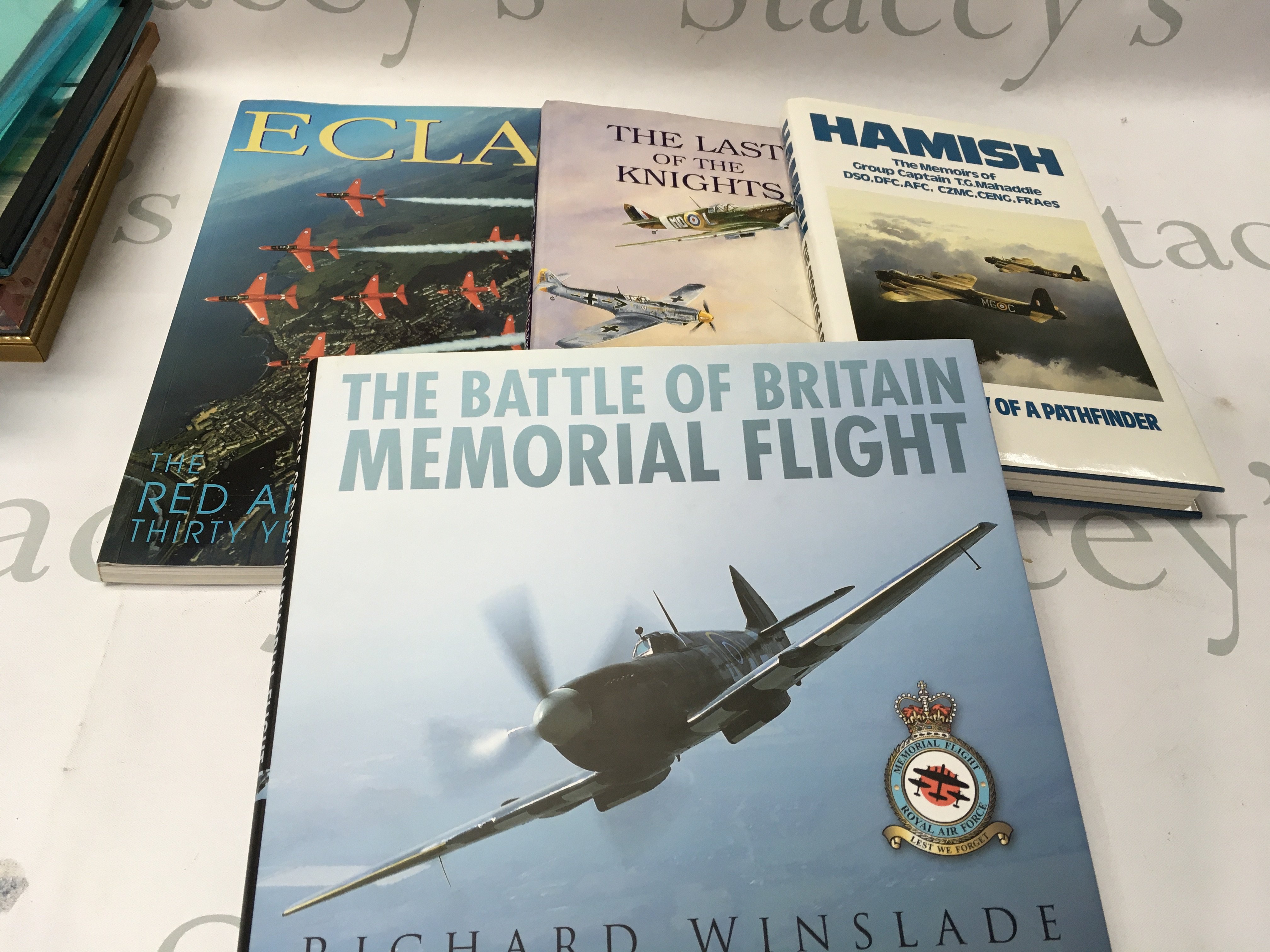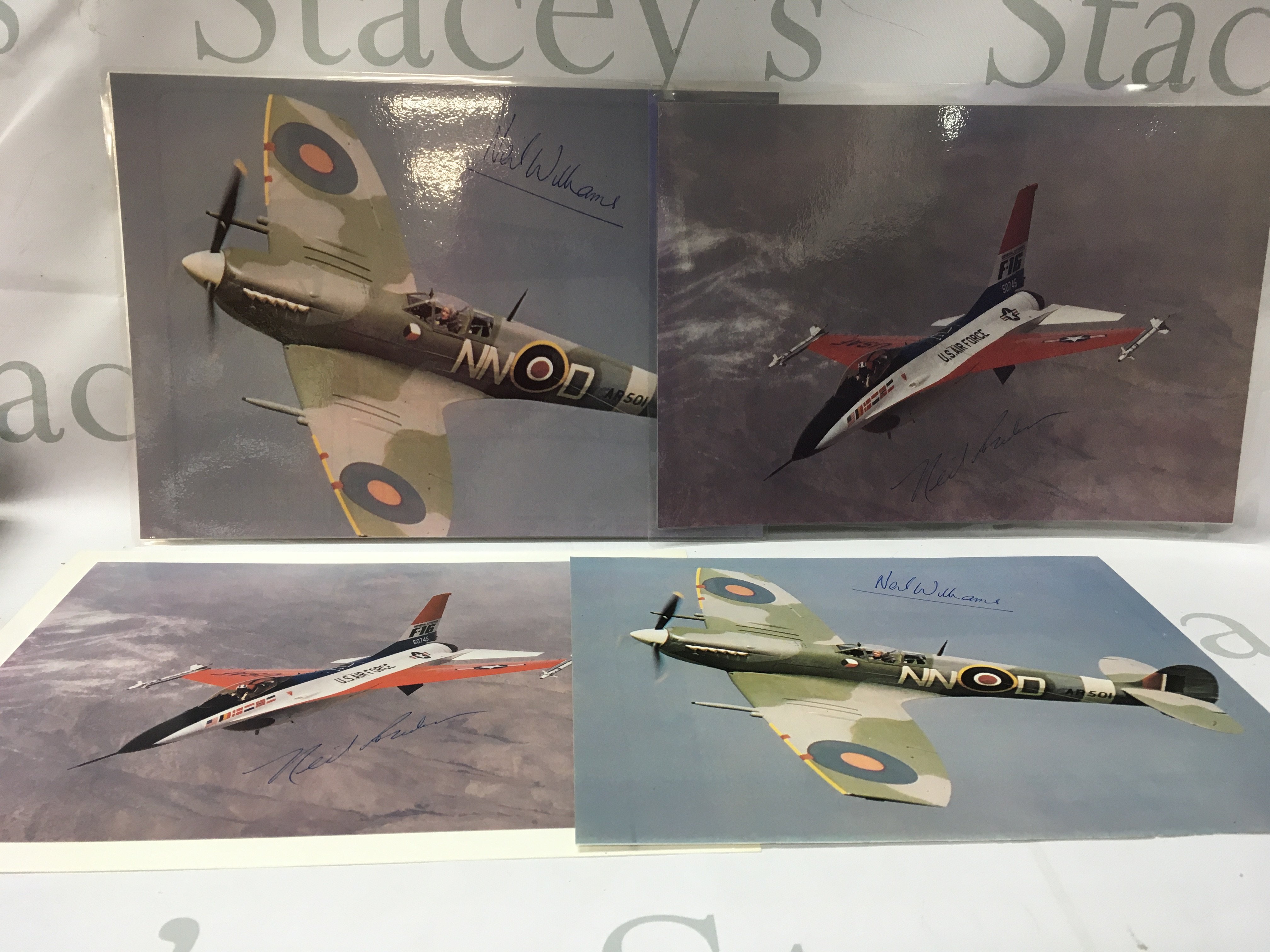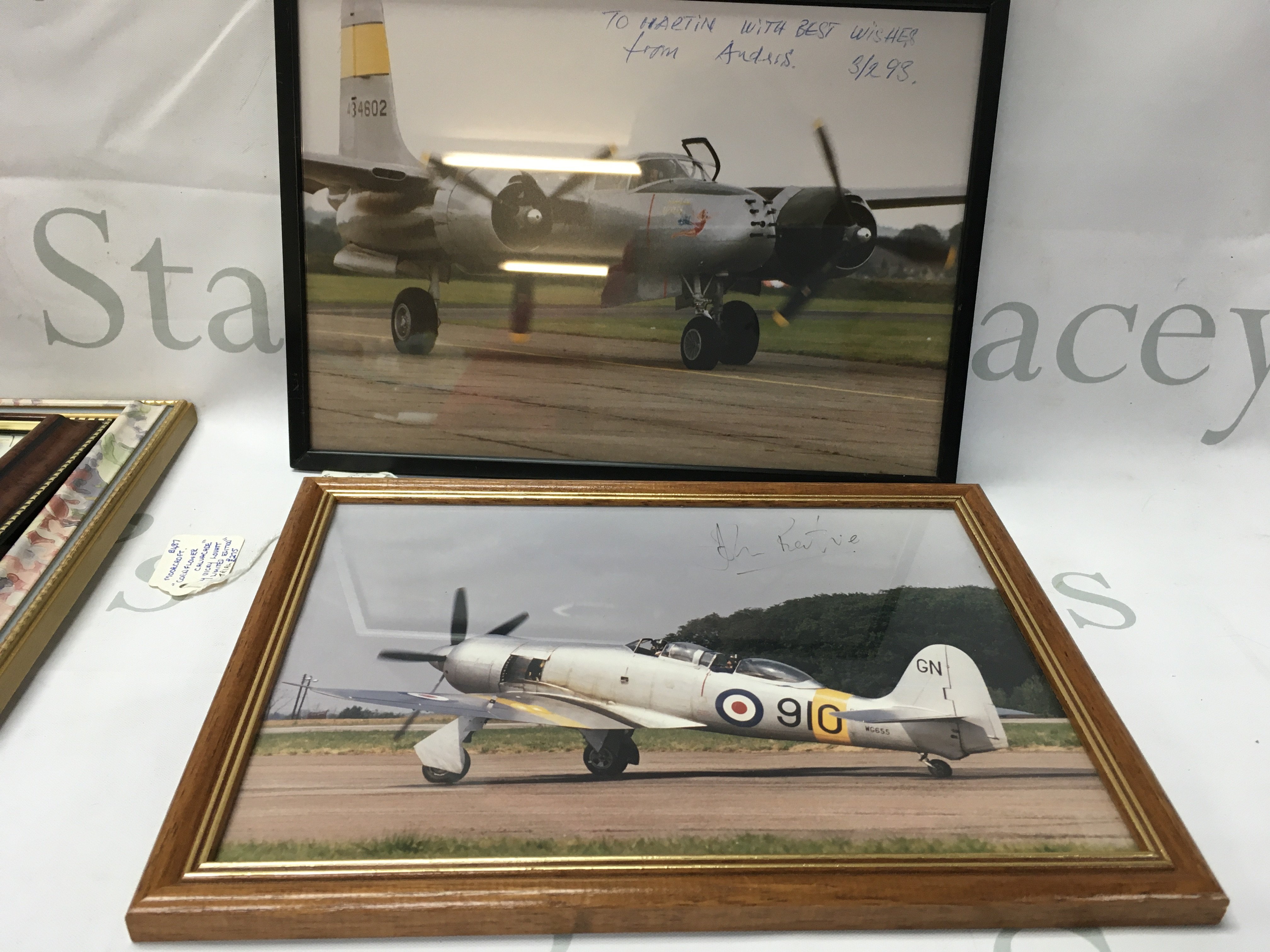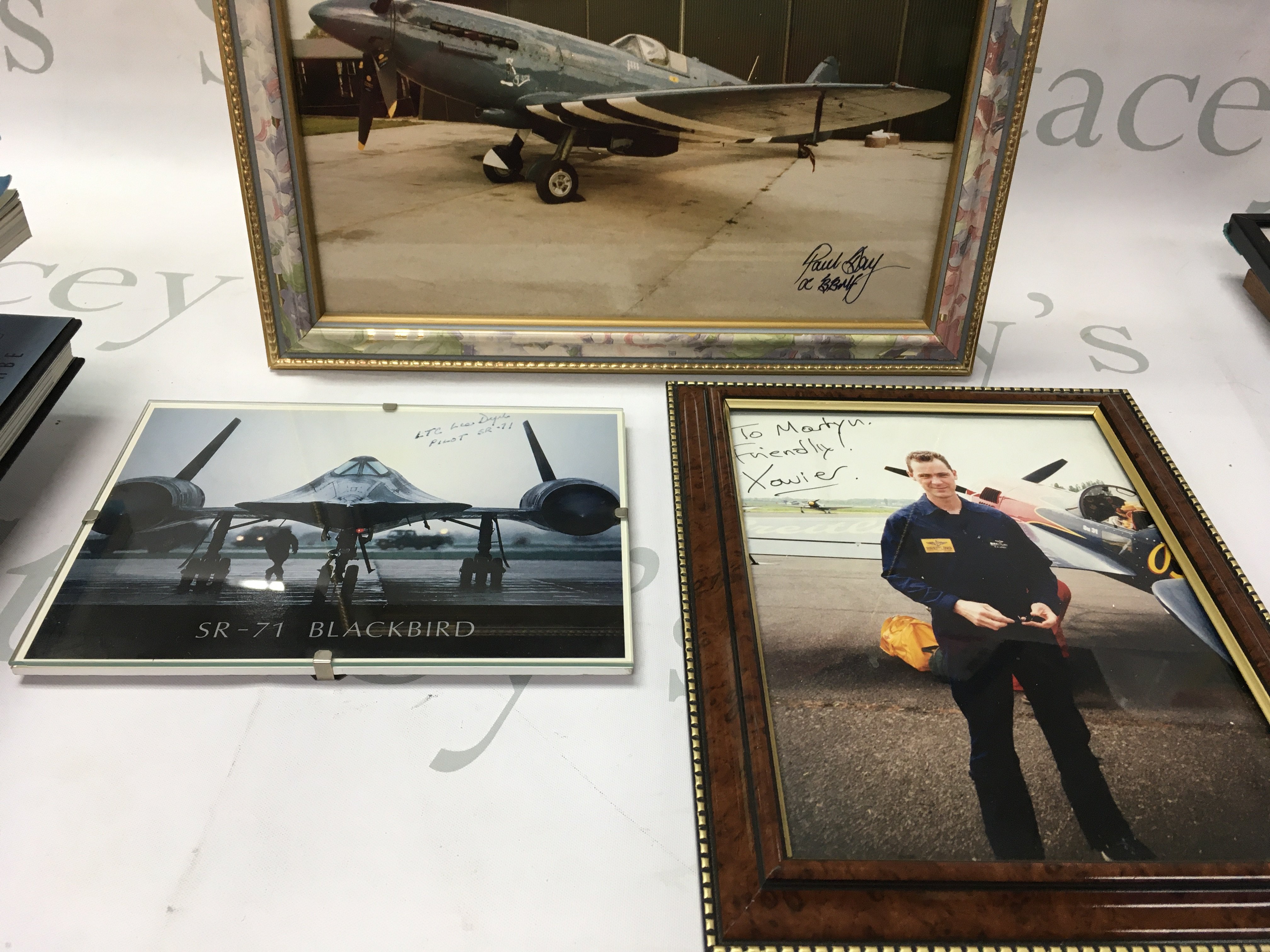 A collection of small unframed and framed aircraft photos and prints including some signed books and memoirs.