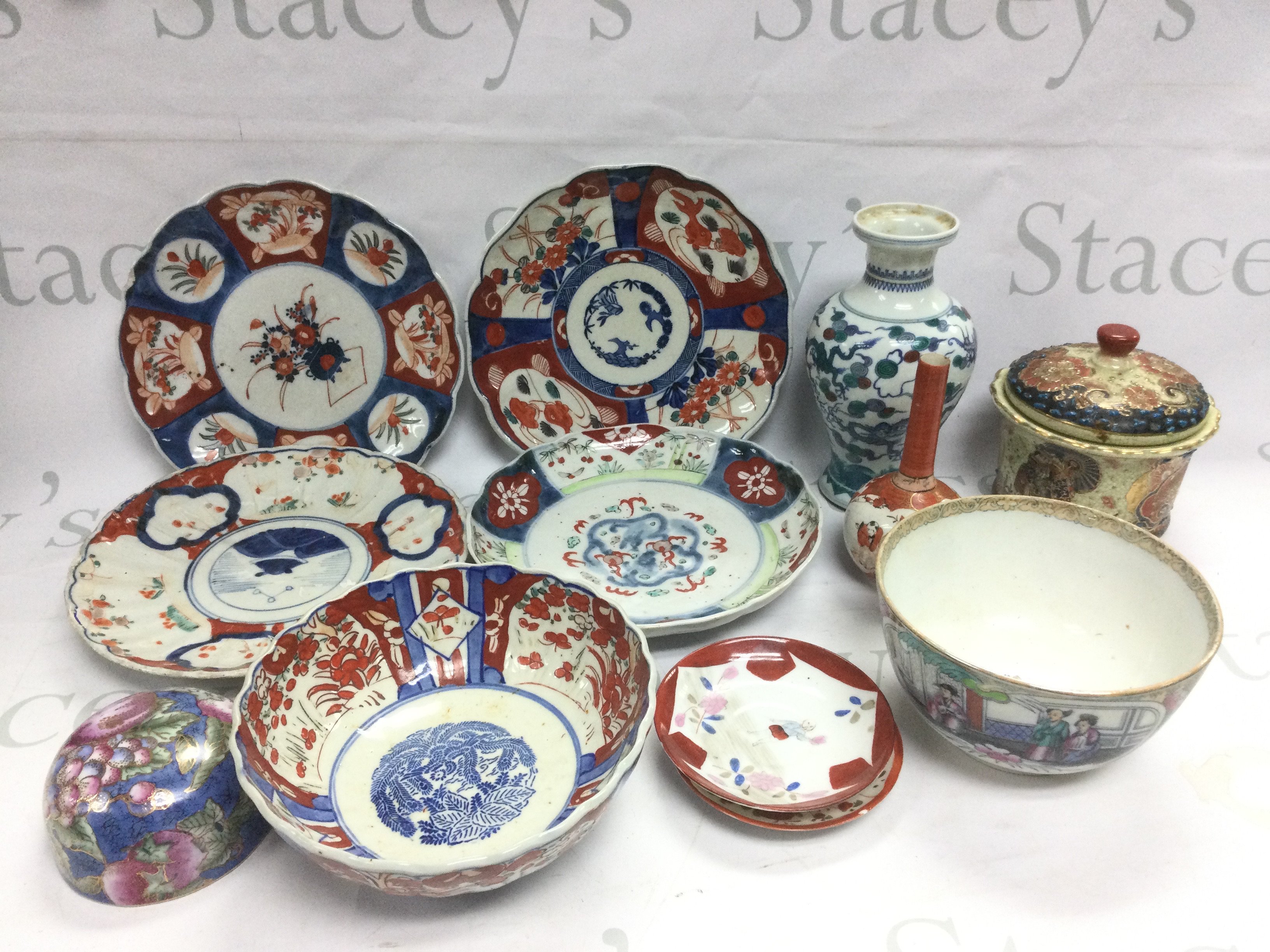 A box of Oriental and Oriental style ceramics including imari plates, bowls etc. Shipping category D.