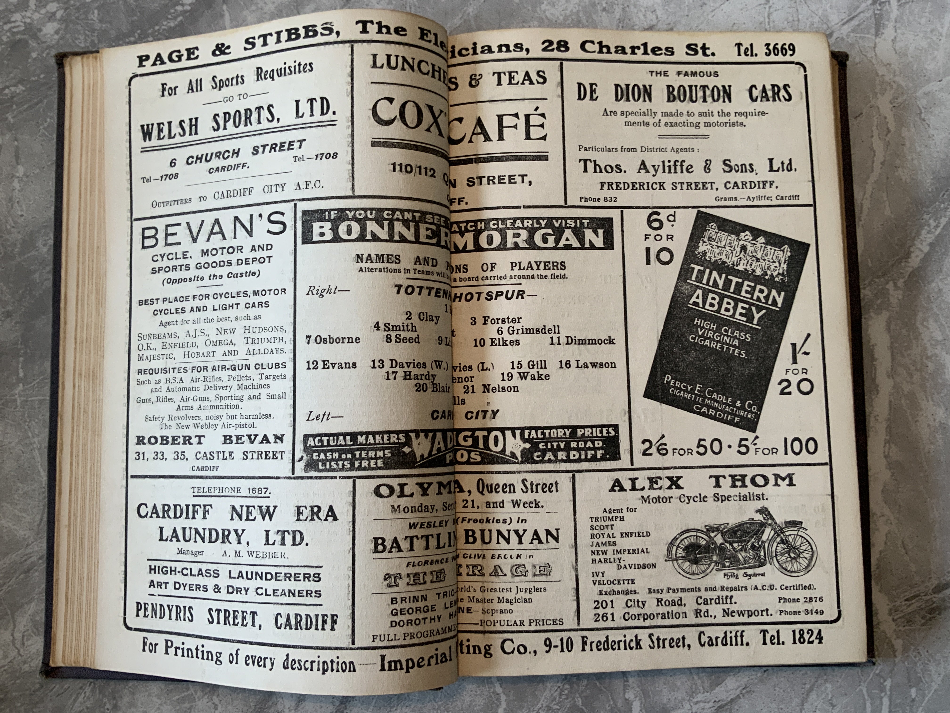 1925 - 1926 Cardiff City Bound Volume Of Football Programmes: 8 page programmes of first team division 1, reserves Welsh League and A team matches. First team includes Manchester United Arsenal West Ham Leeds and Tottenham. Covers missing.