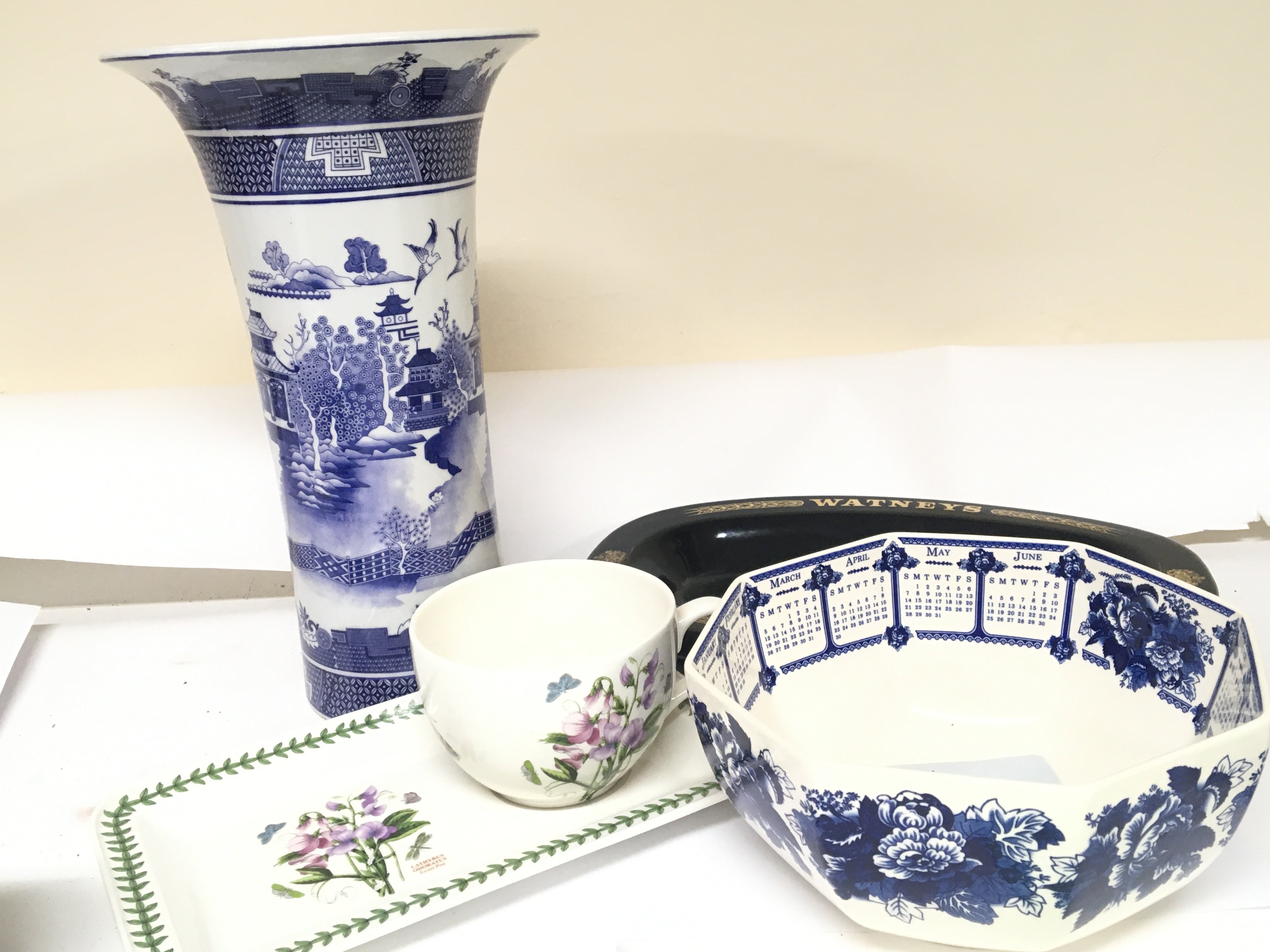 A collection of ceramics A Wedgwood blue and white calender bowl a Watneys Advertising dish large blue and white vase and large Portmeirion cup and dish no obvious damage.