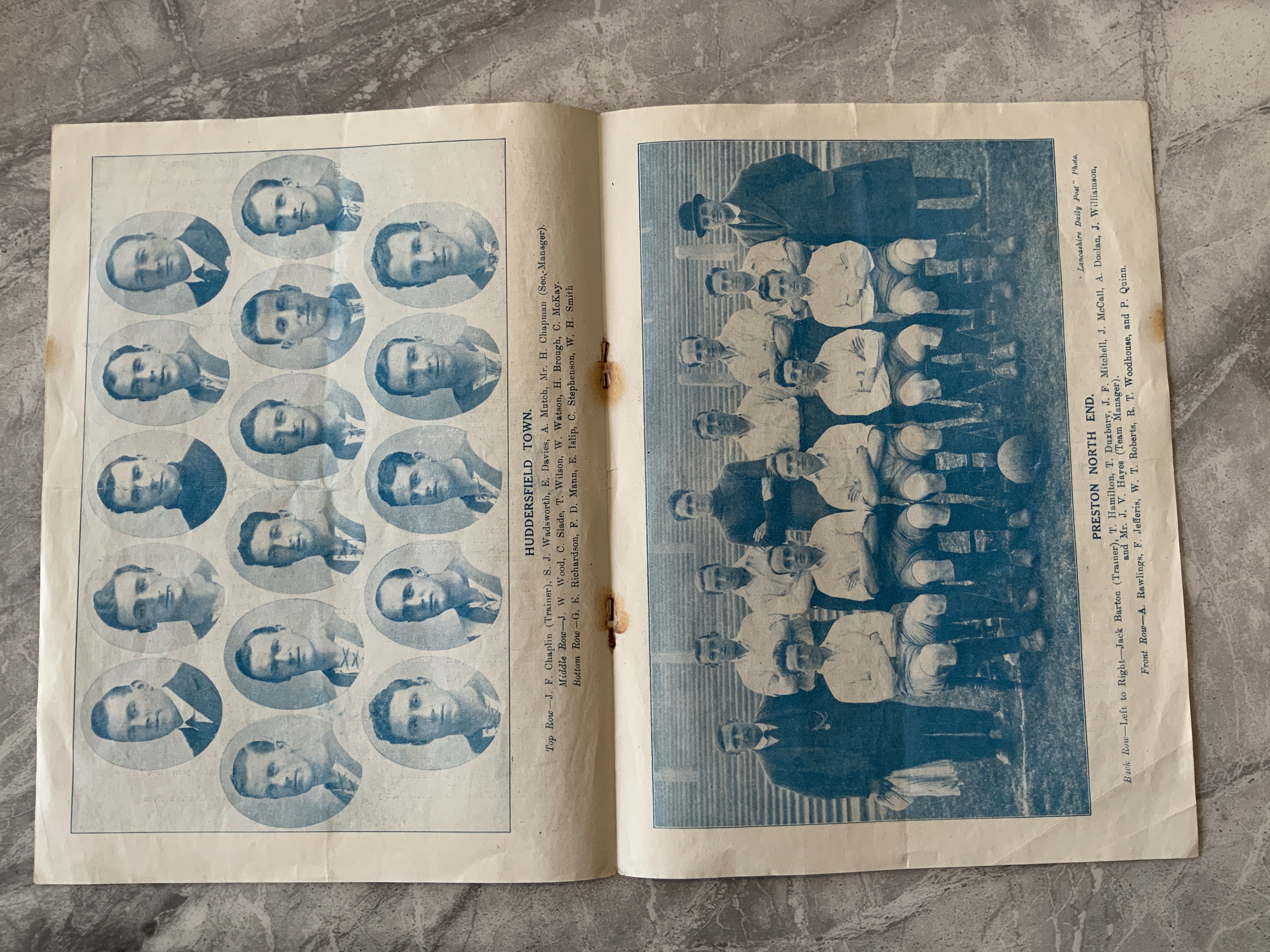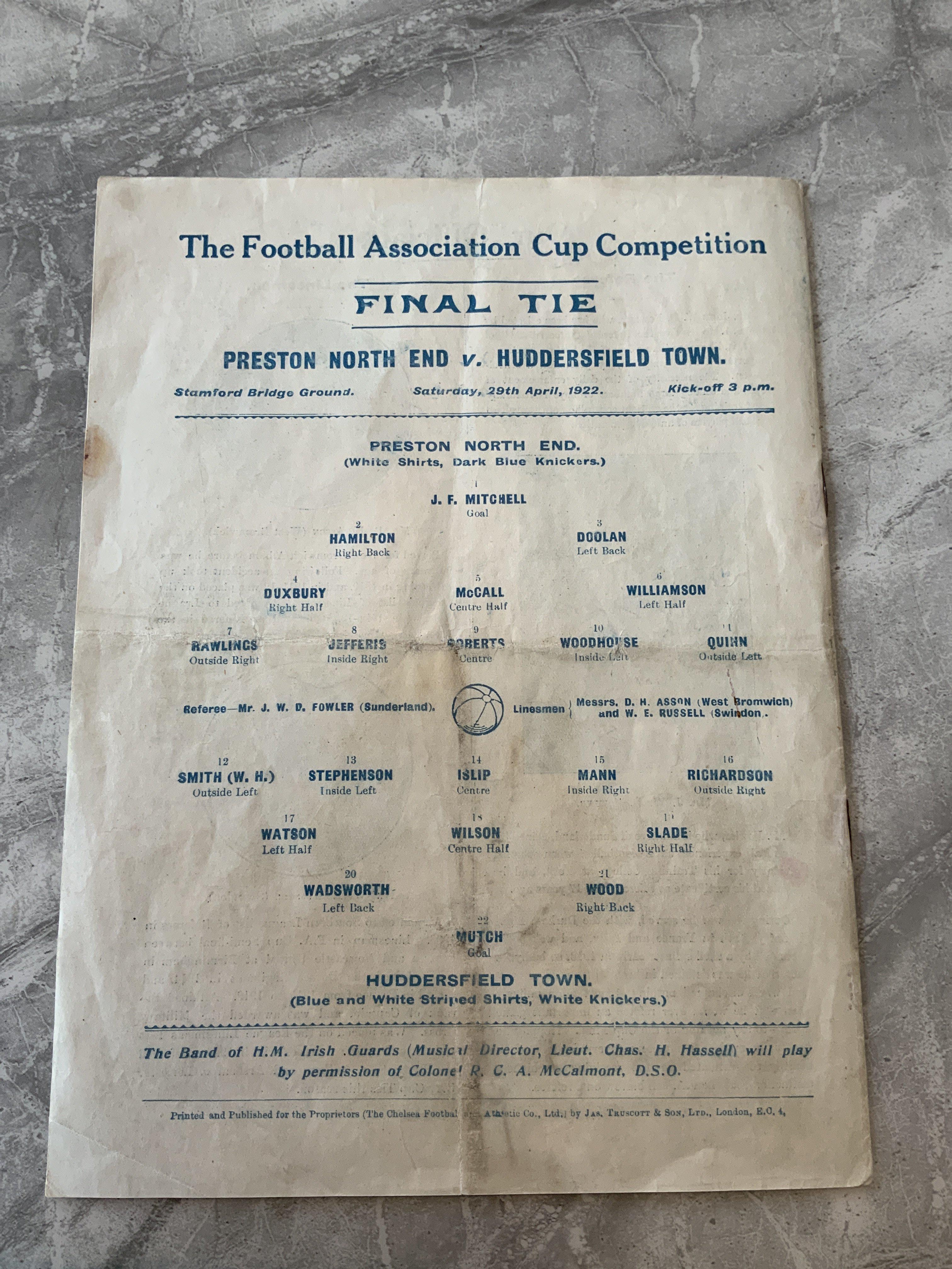1922 FA Cup Final Football Programme: Preston v Huddersfield Town played at Chelsea. Very good condition now after professional clean and repair to staple area. No team changes. The last FA Cup played at Chelsea before Wembley took over for the next 77 years. Receipt from 2021 for nearly 2k.