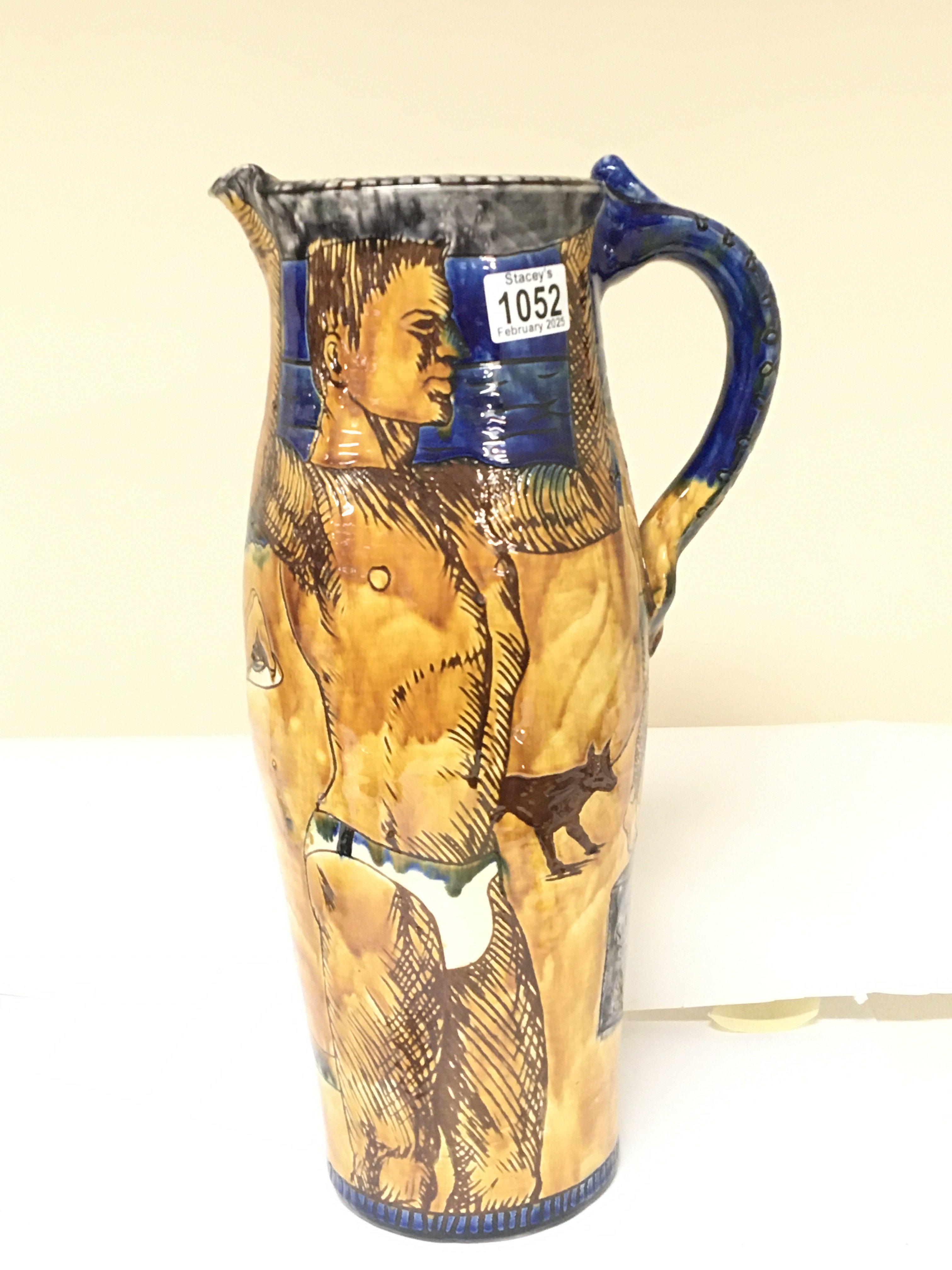 A large 20th century contemporary ceramic jug decorated with figures K King 92 Carrying a Surfboard. Height 45cm