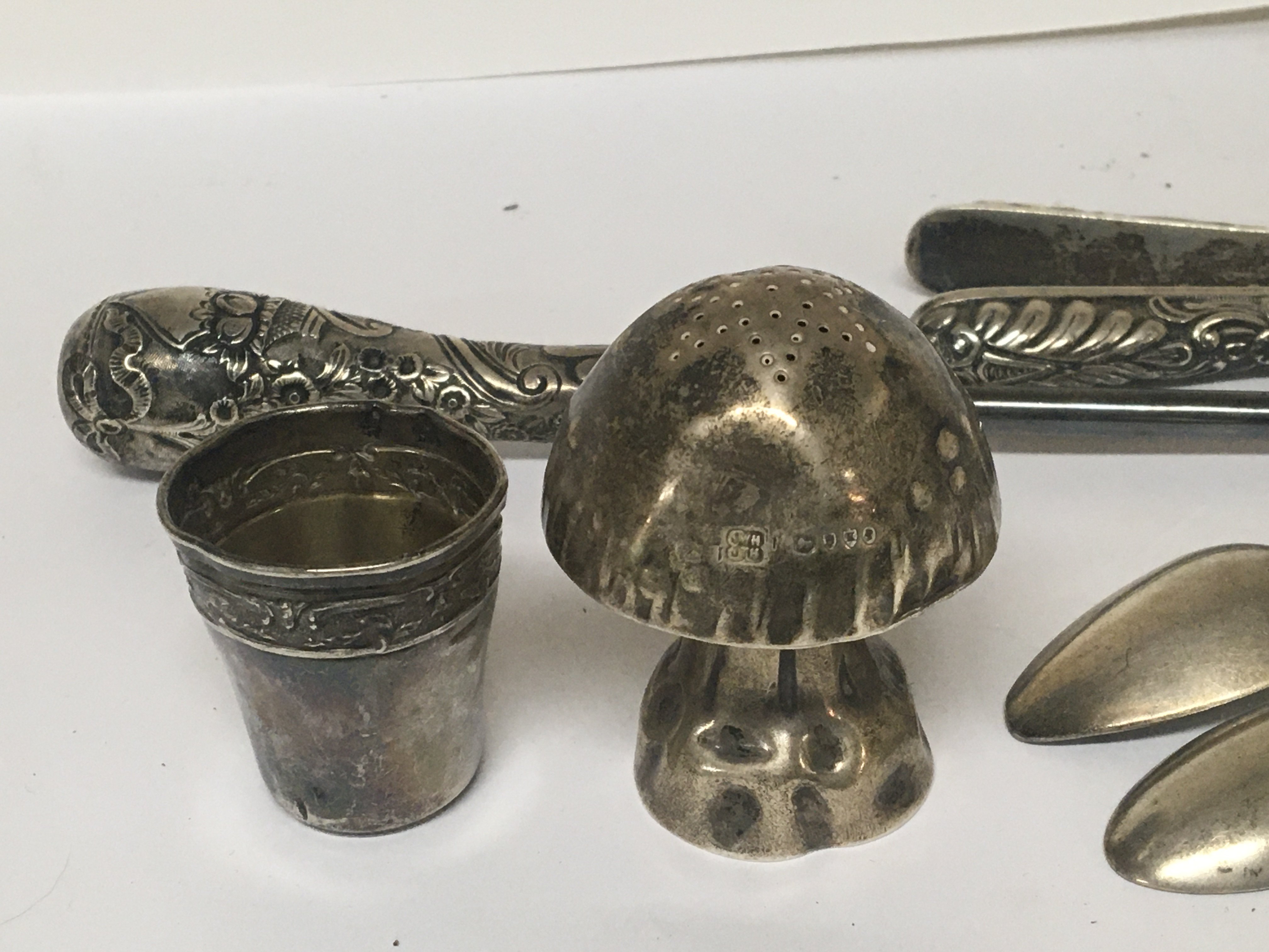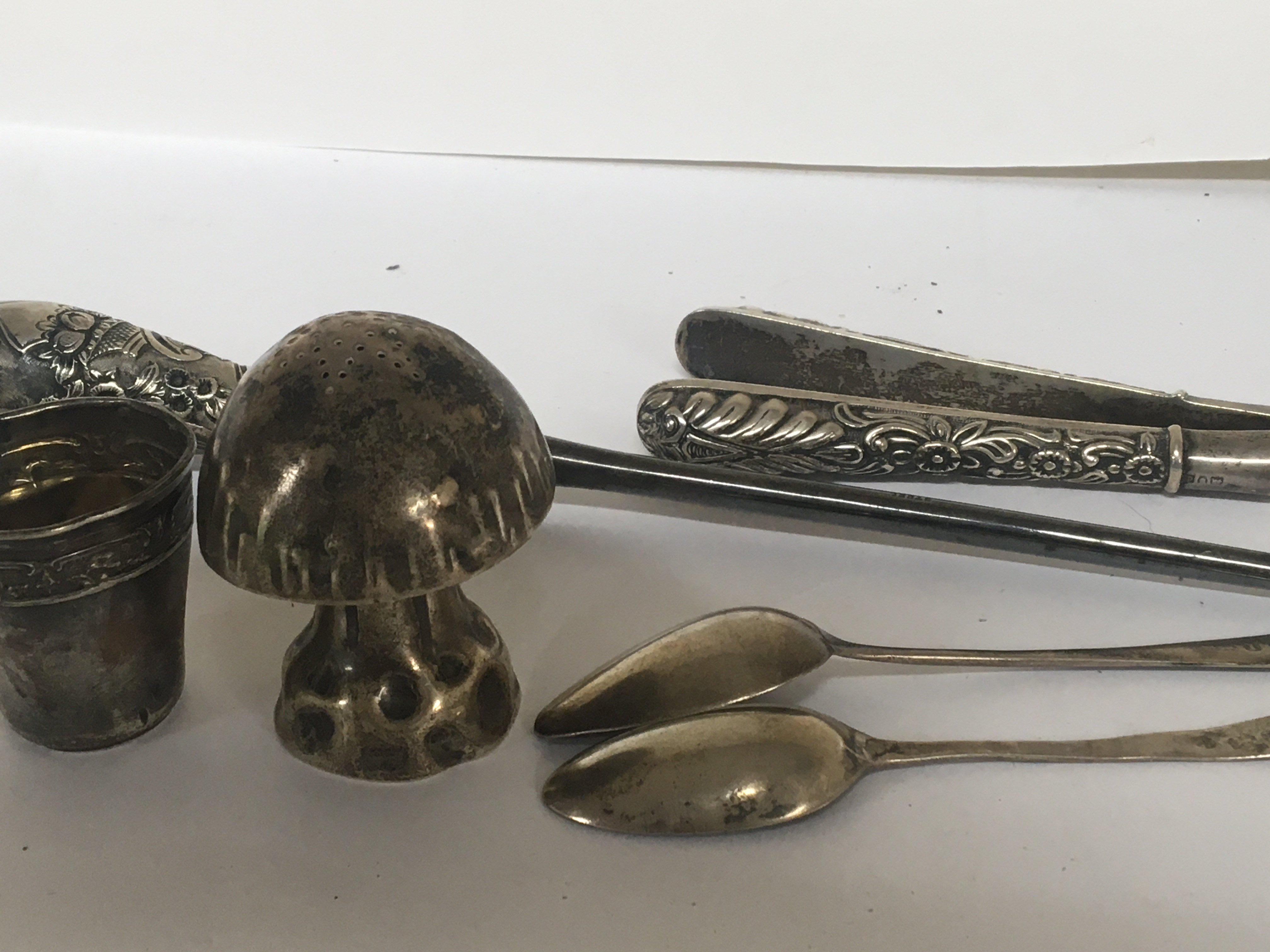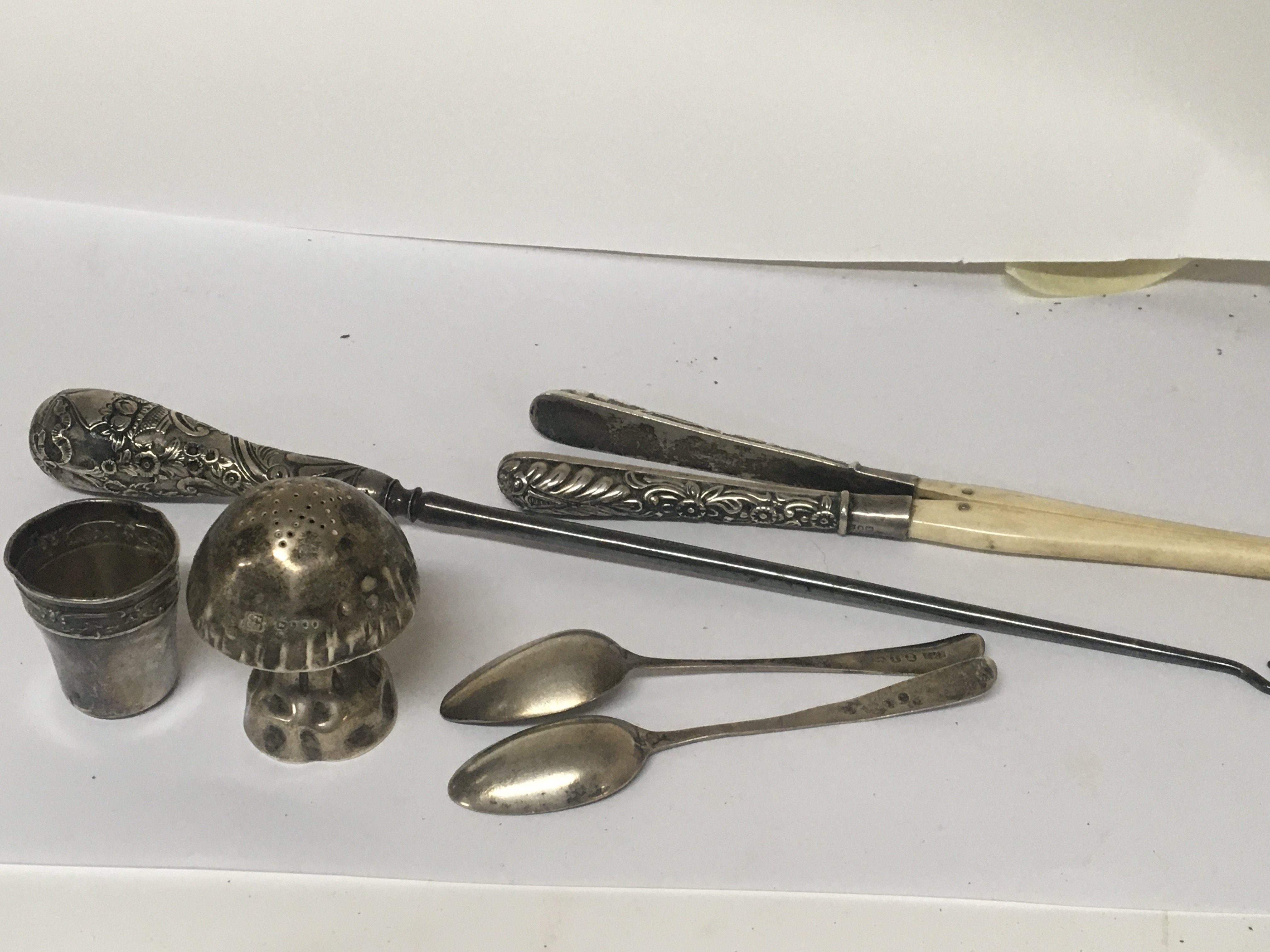 A Victorian silver Novelty mushroom shaped condiment with London hallmarks two silver spons a silver handled button hook and glove stretchers.