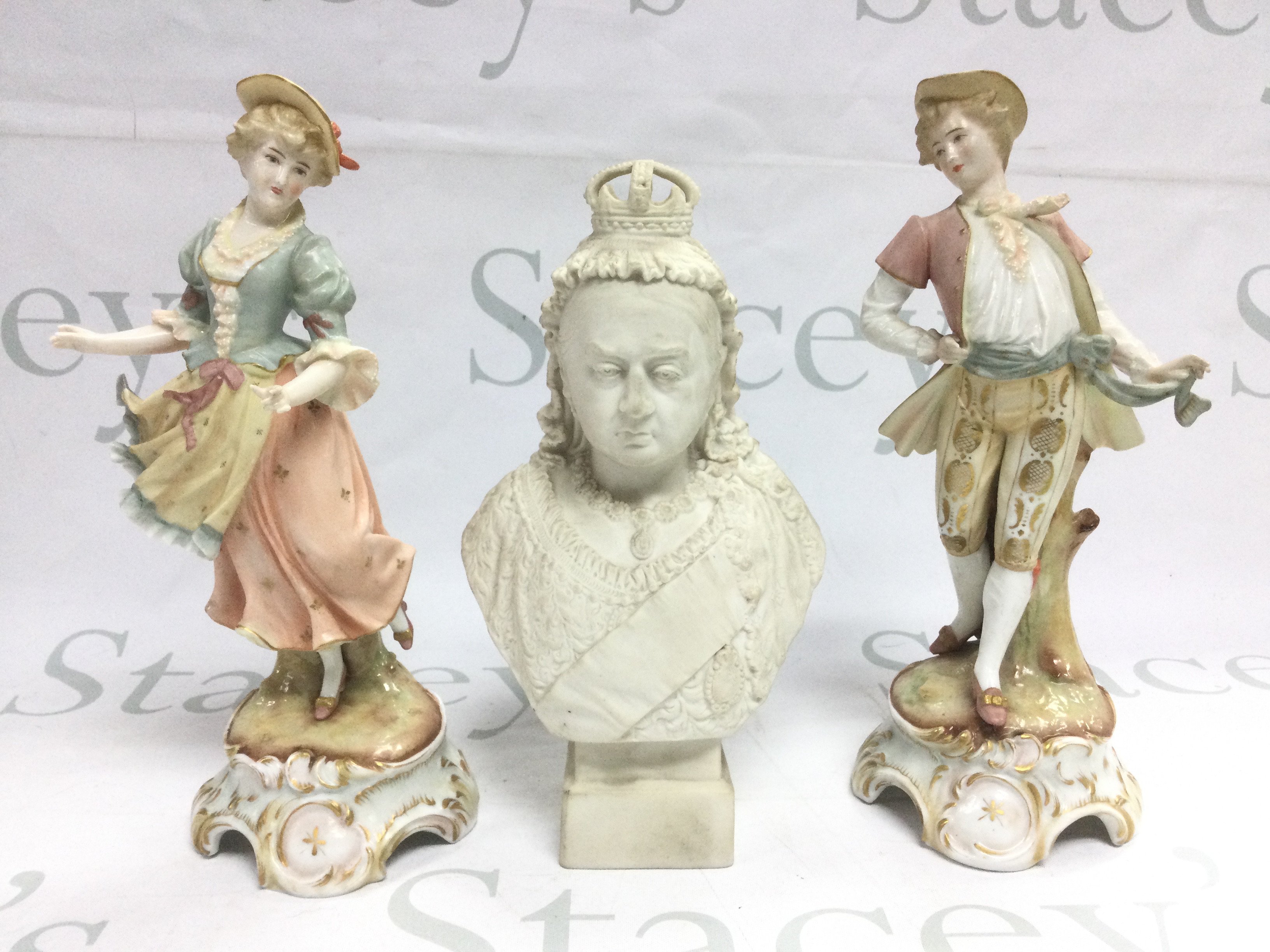 A parianware bust of Queen Victoria and a pair of ceramic figures , approx height 23.5cm (3). Shipping category D.