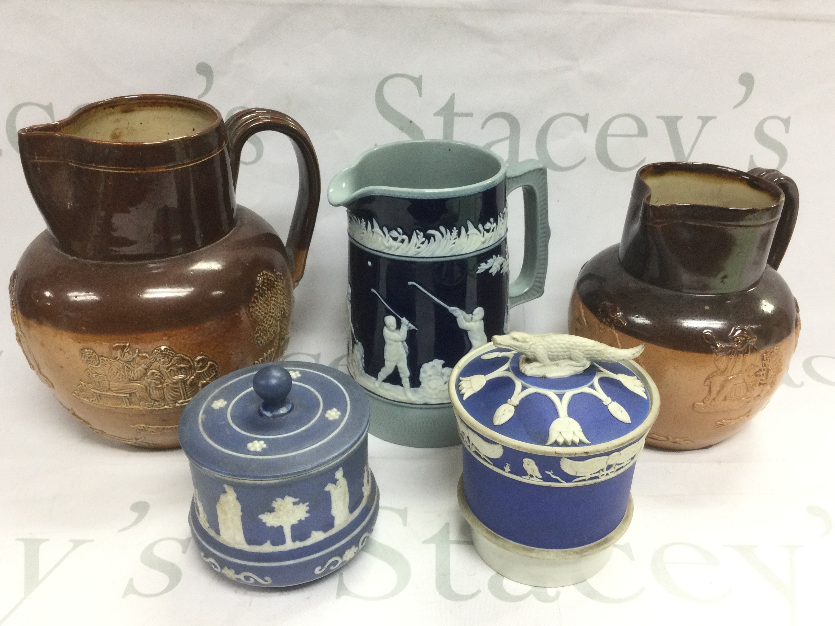 Two Doulton Lambeth harvestware jugs, a Copeland golfing jug etc. Shipping category D.