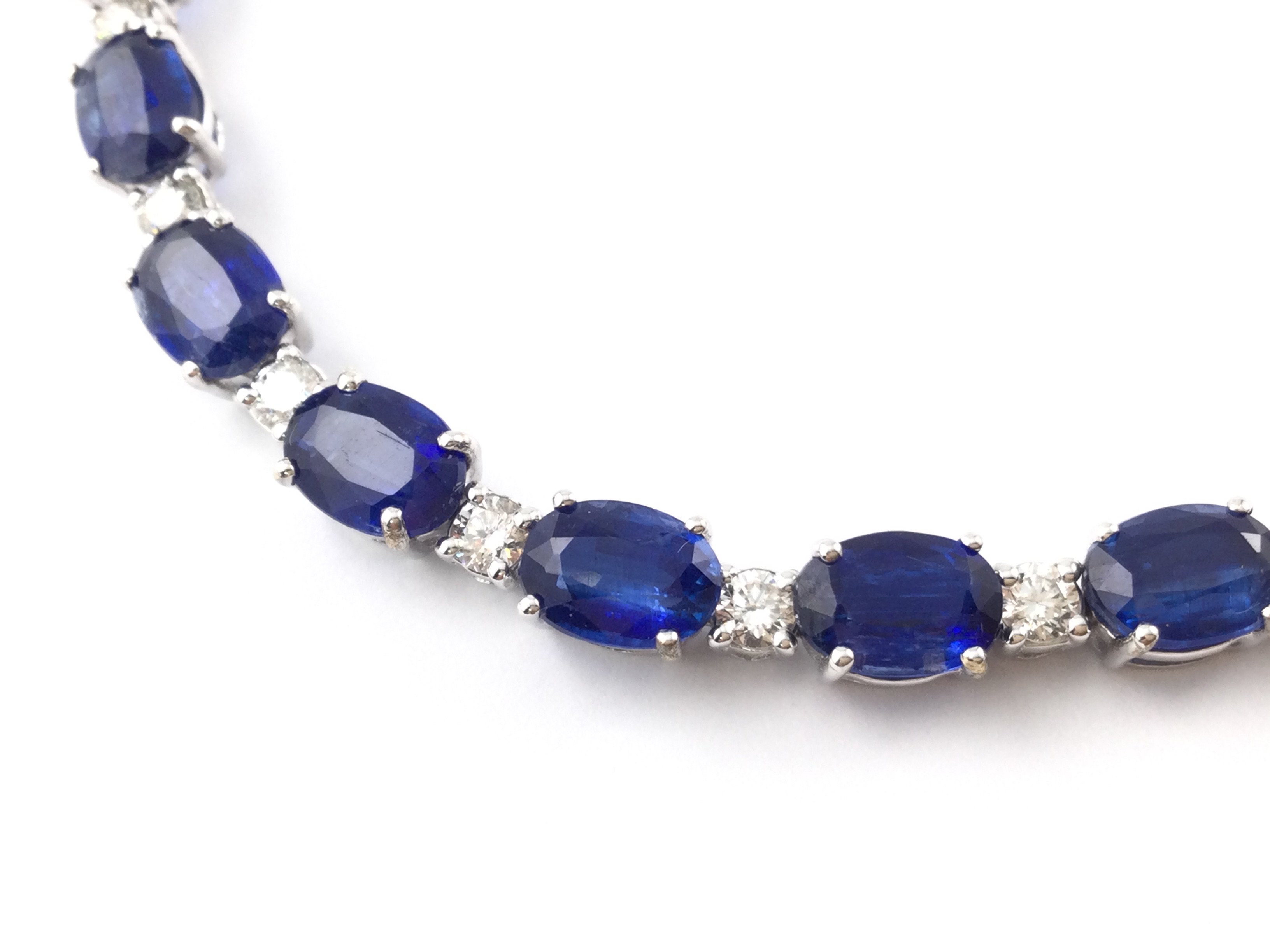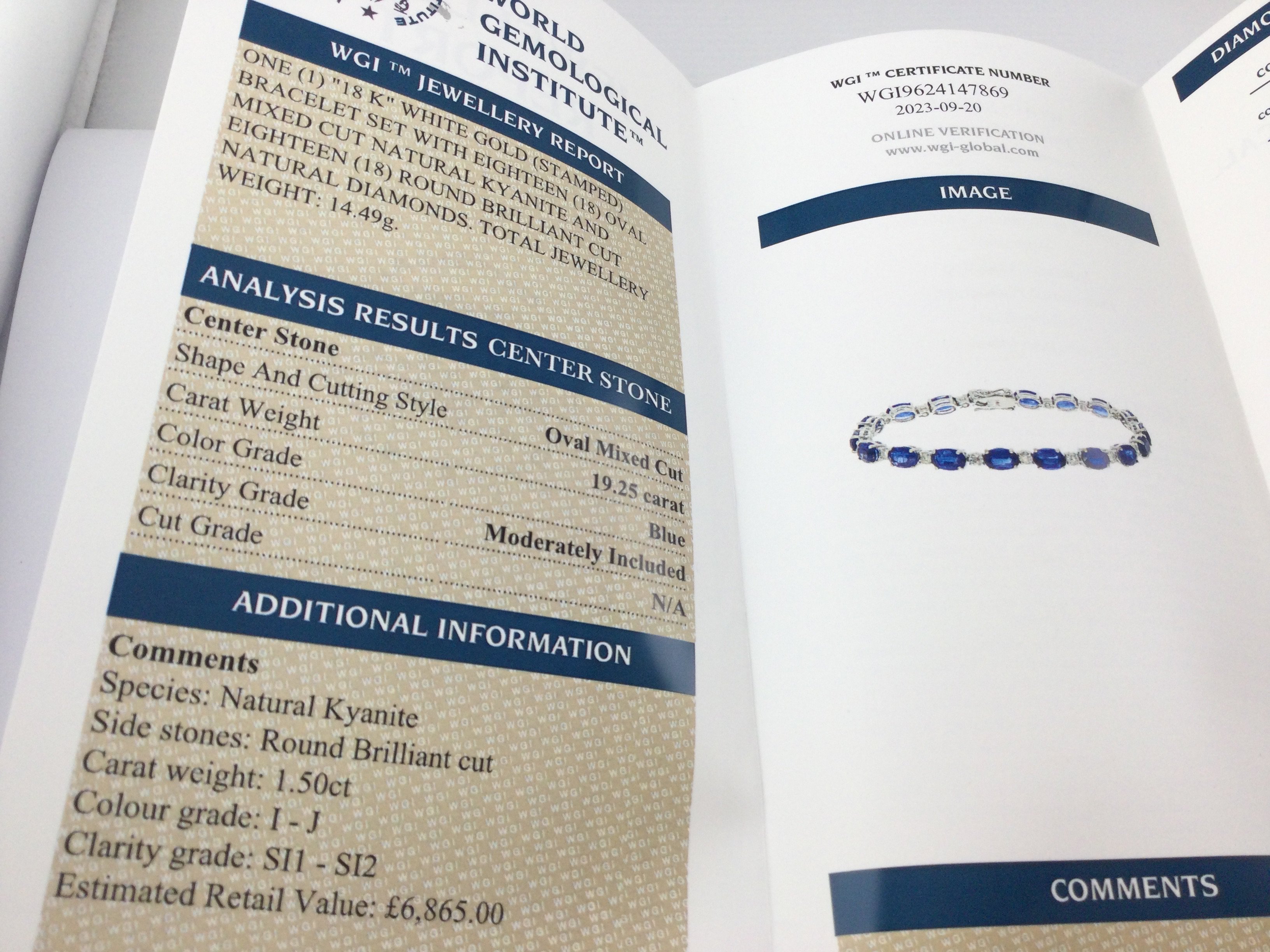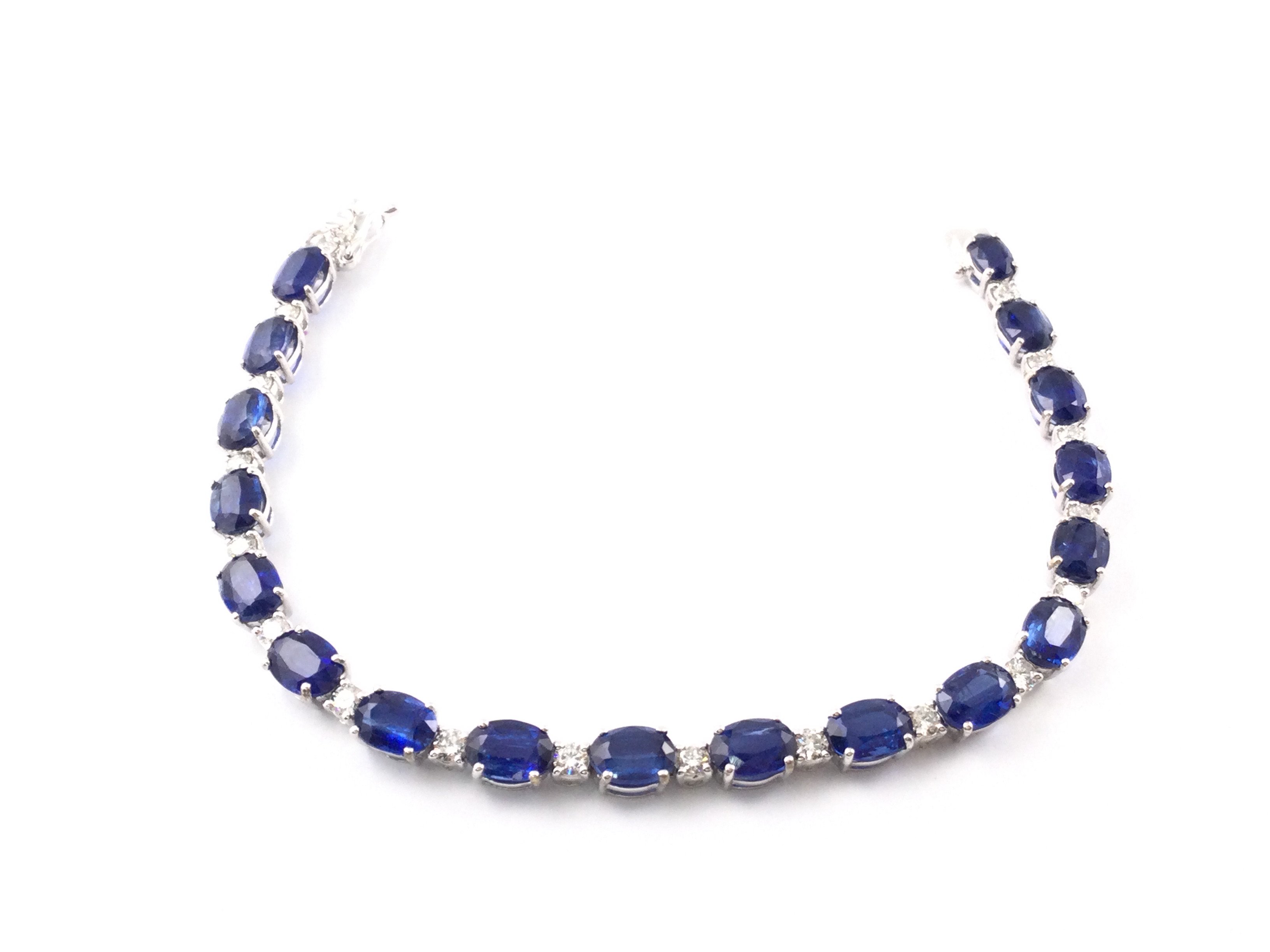 18ct white gold oval kyanite and diamond line bracelet. Kyanites 19.25ct and diamonds 1.50ct. 19cm length. Comes with box and gem Cert. Postage B