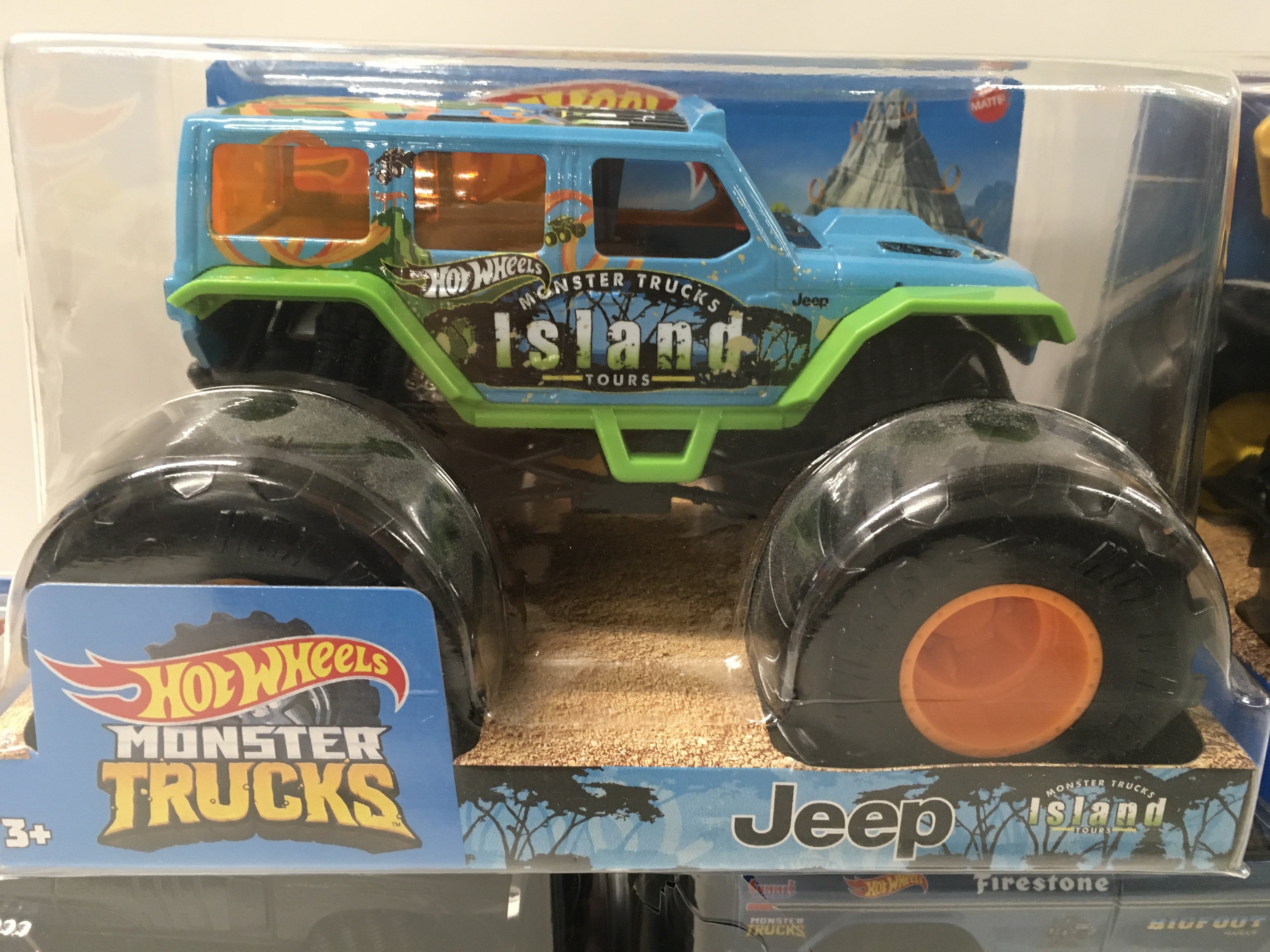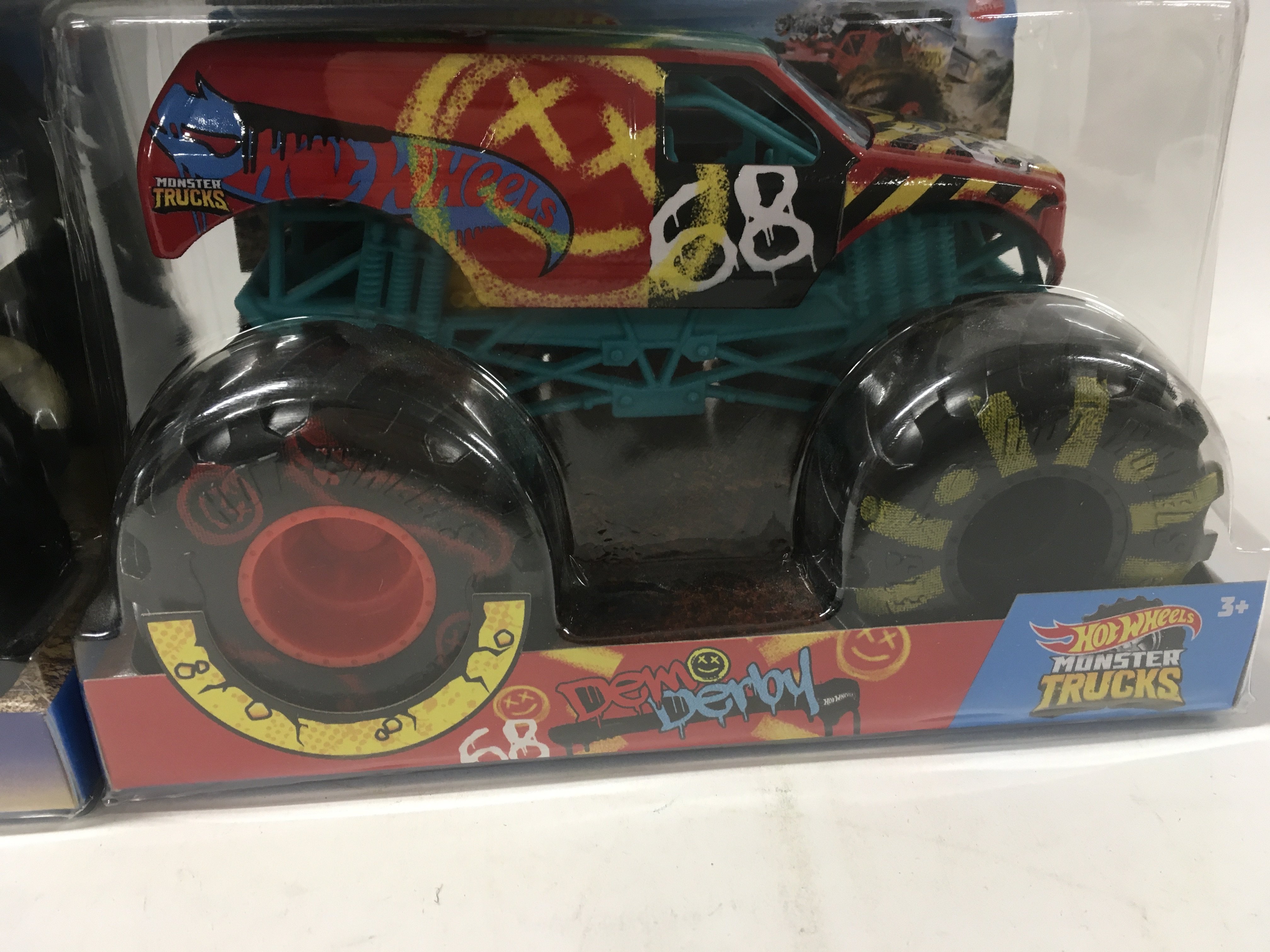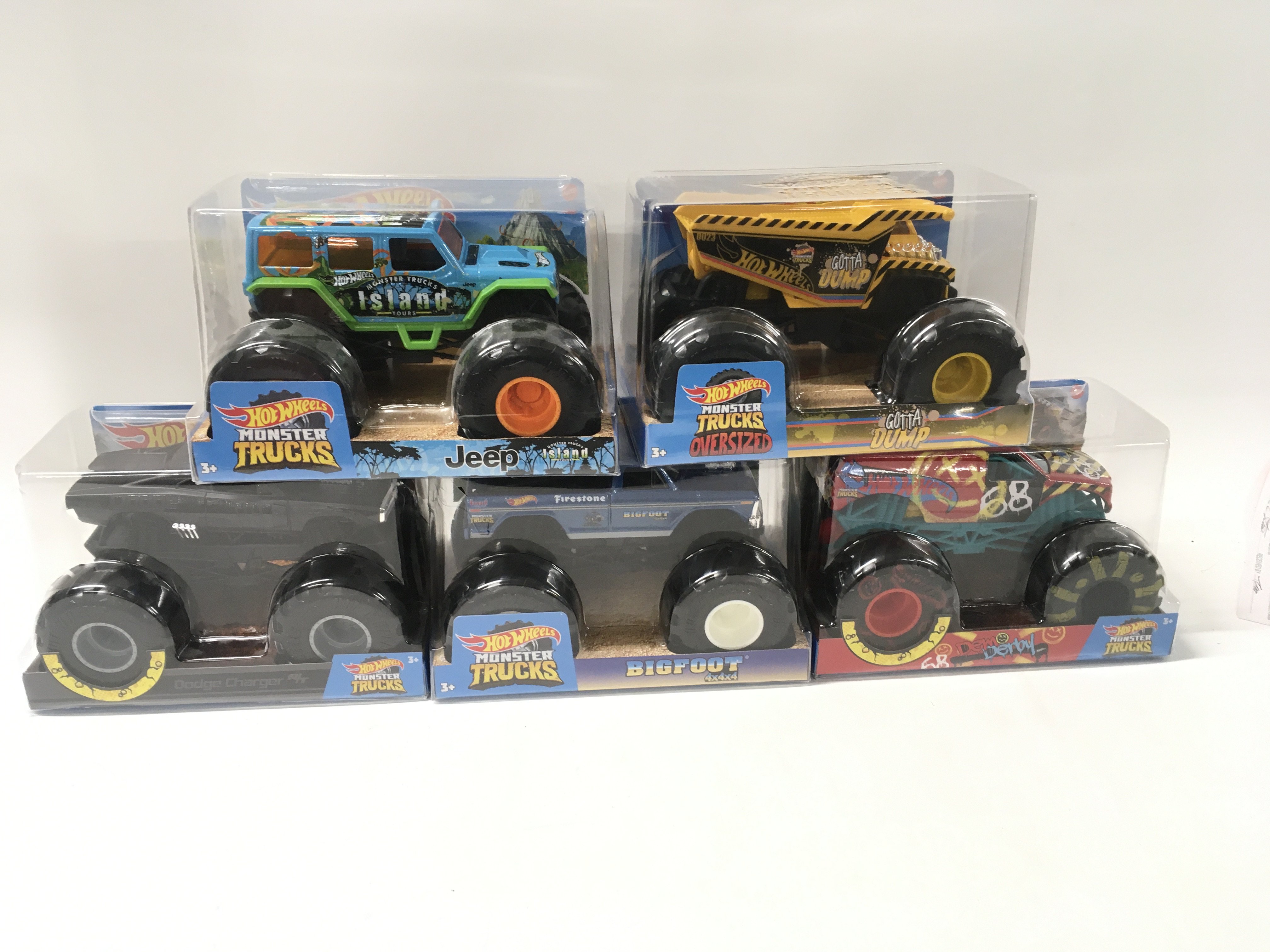 A collection of 5 unopened Hot Wheels Monster Trucks includes ..Island Jeep..Gotta Dump..Dodge Charger..Bigfoot 4x4x4.. Demo Derby. No reserve