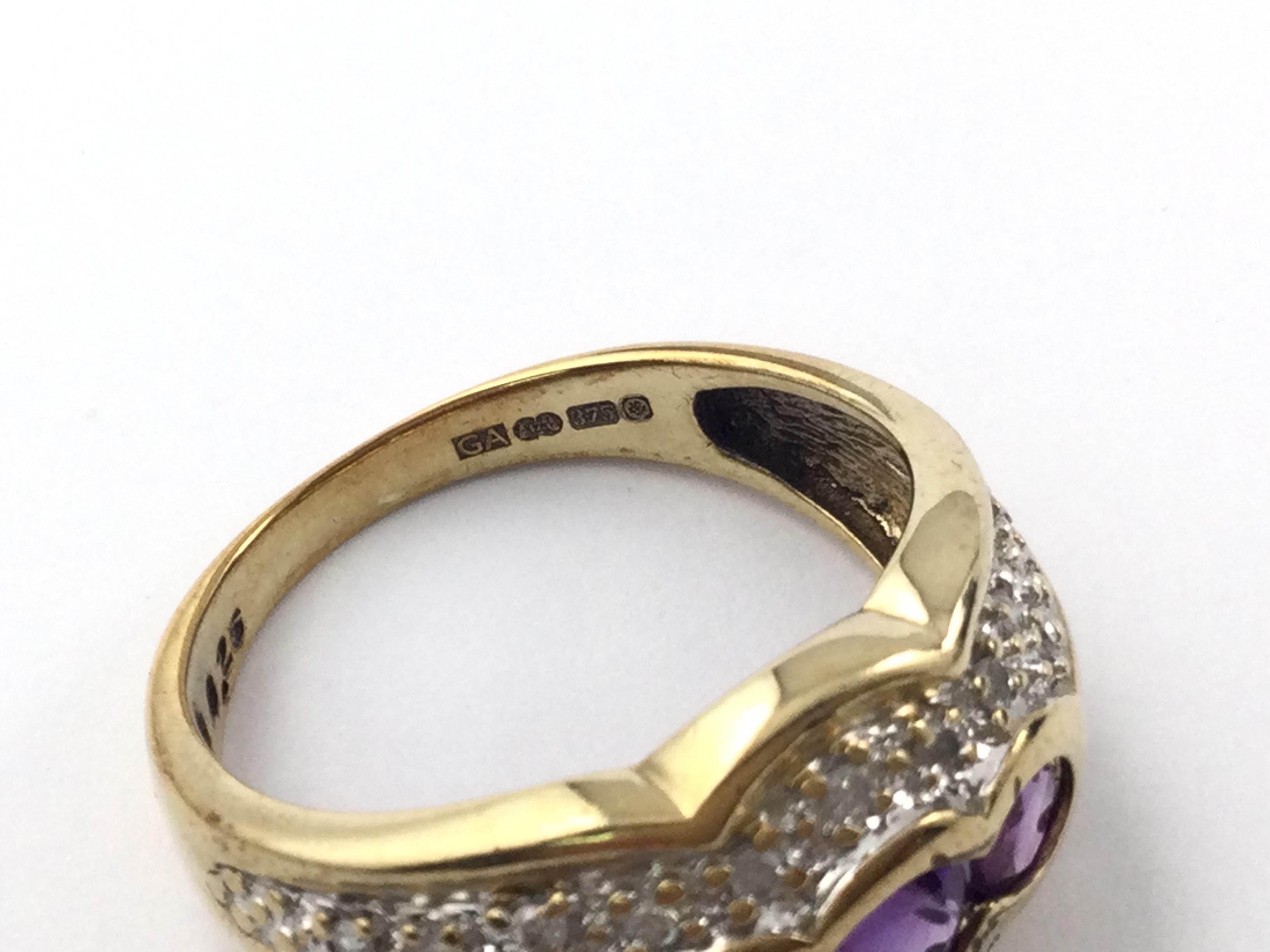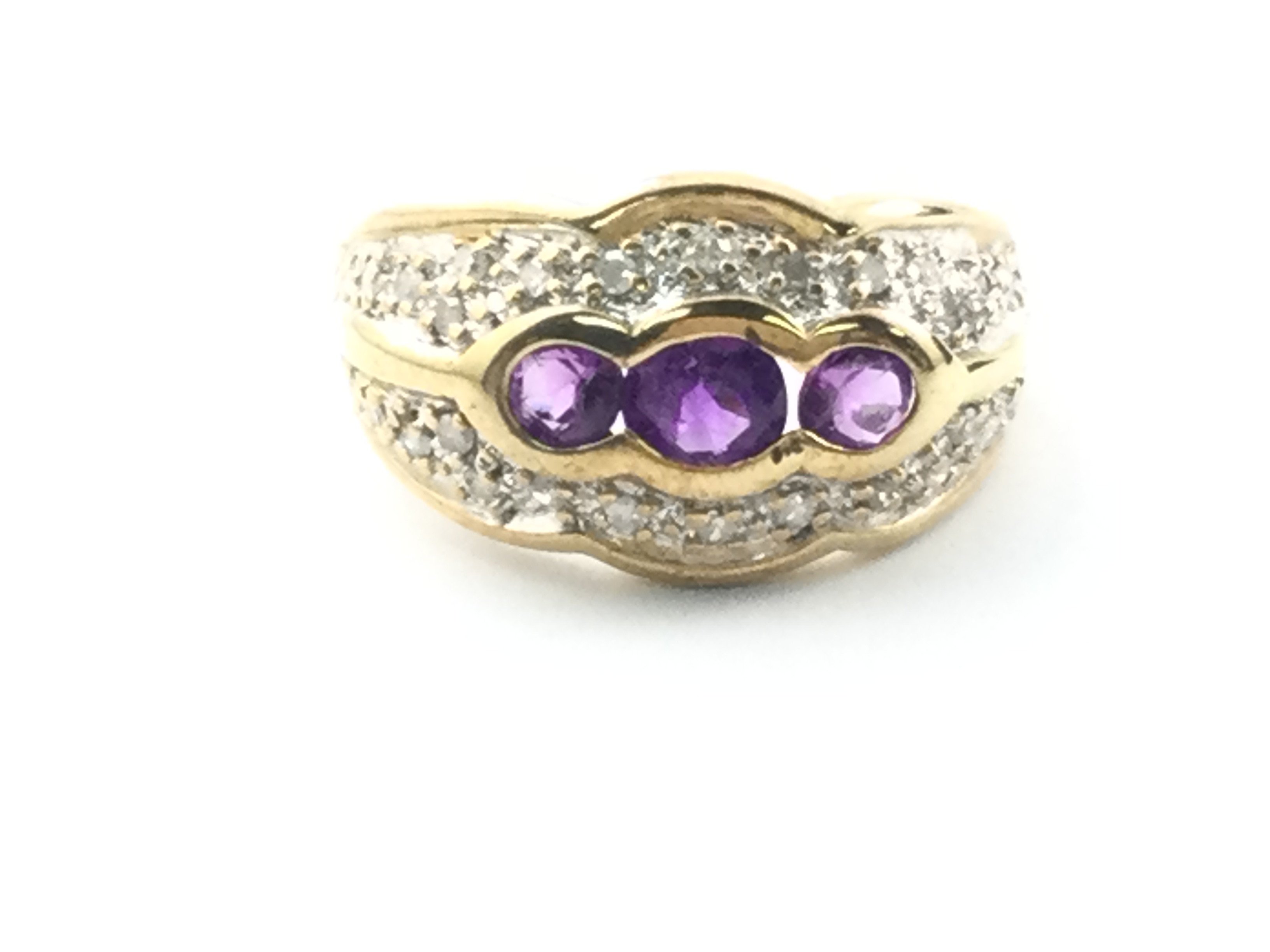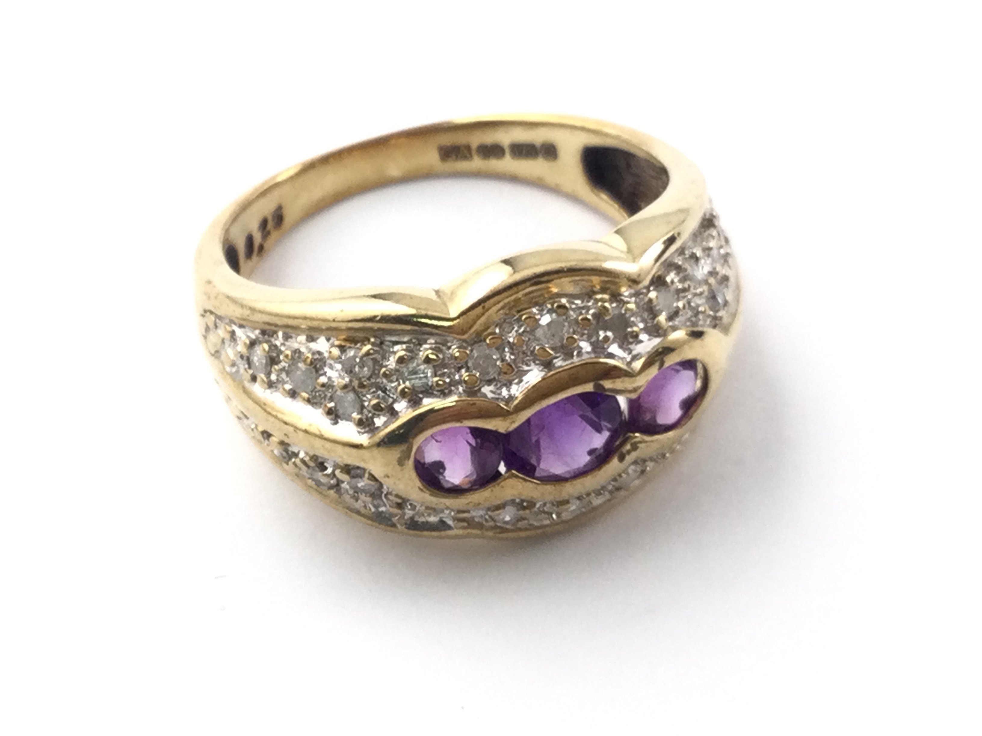 9ct yellow gold dress ring set with 3 oval amethyst and diamonds. Diamonds approx 0.25ct size Q
