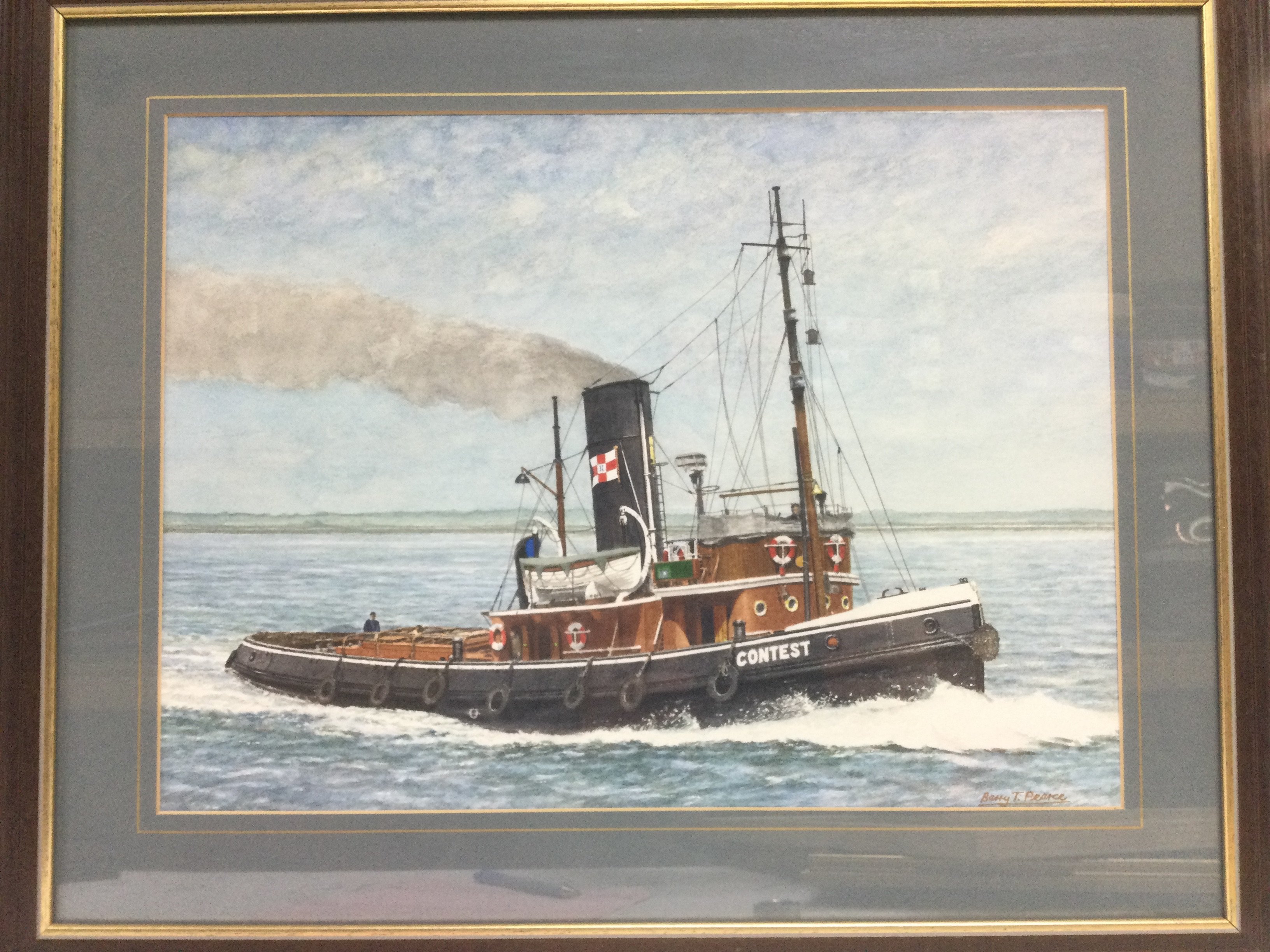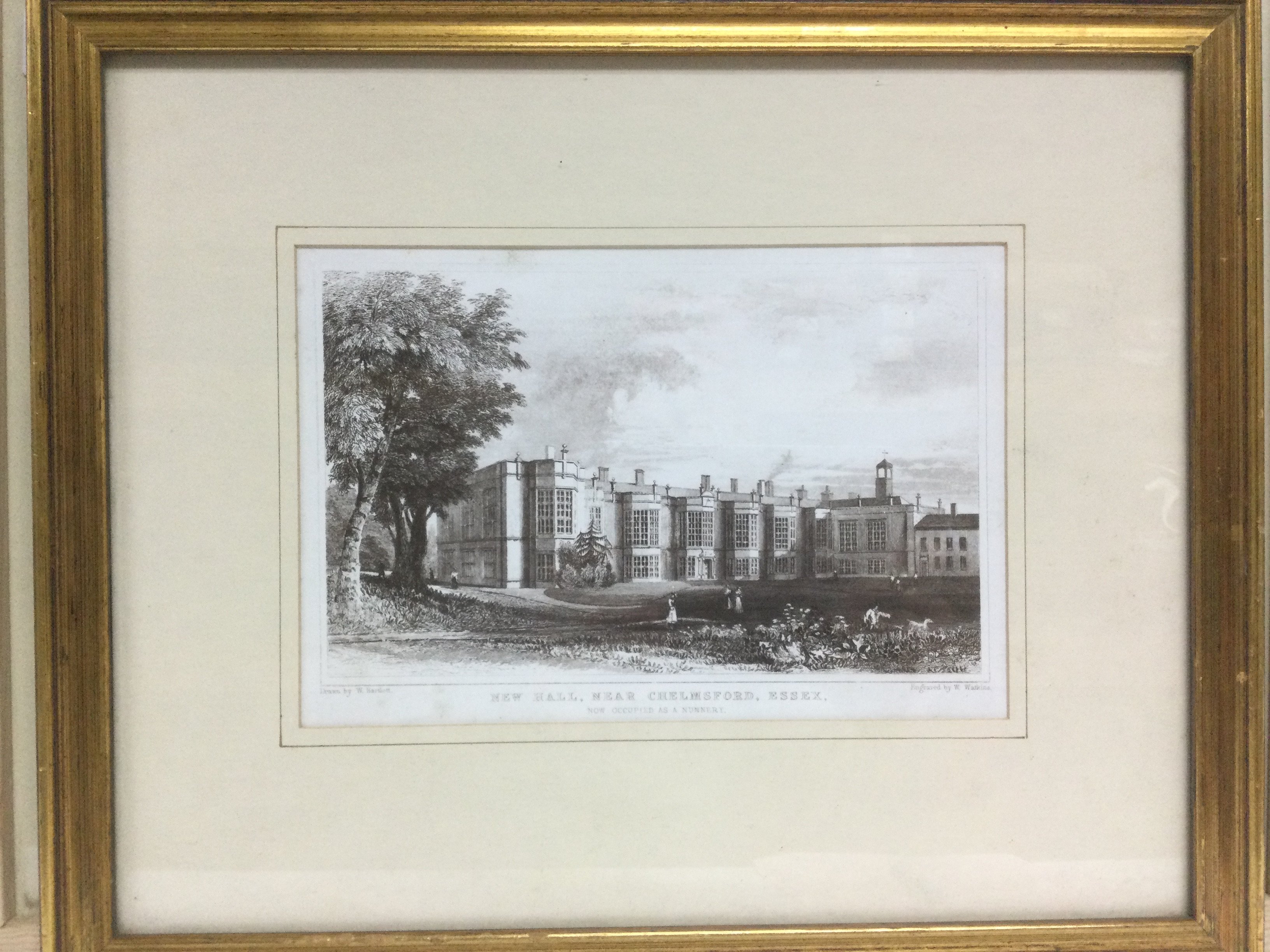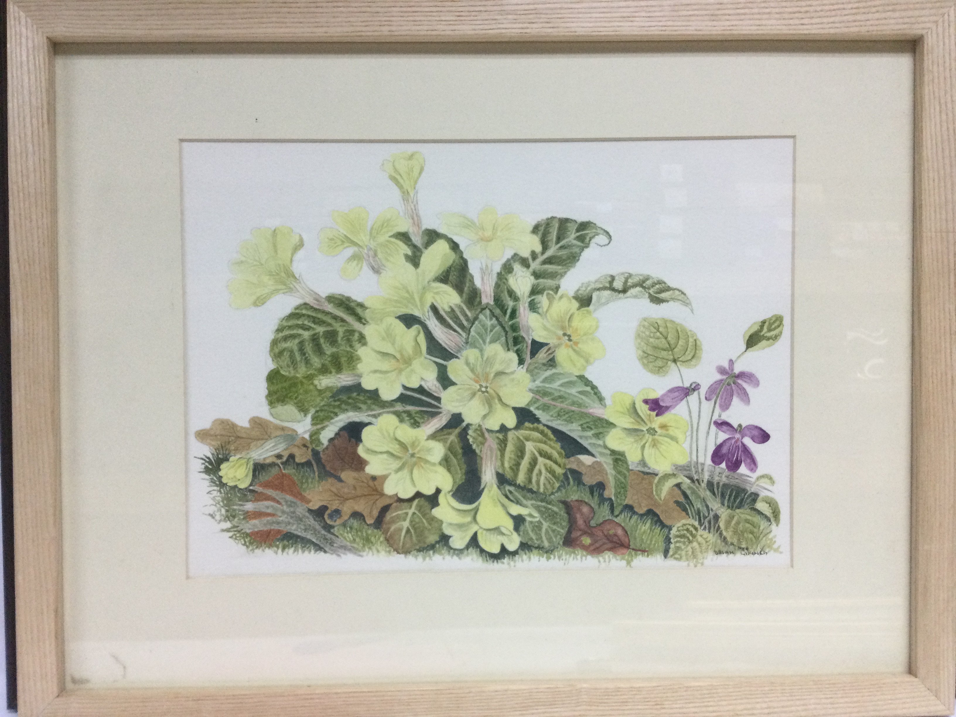 A framed and glazed watercolour of a fishing boat by Barry T Pearce, approx 57cm x 46cm plus Brian Linnett watercolour of primroses and a print of New Hall, near Chelmsford (3). Shipping category D.