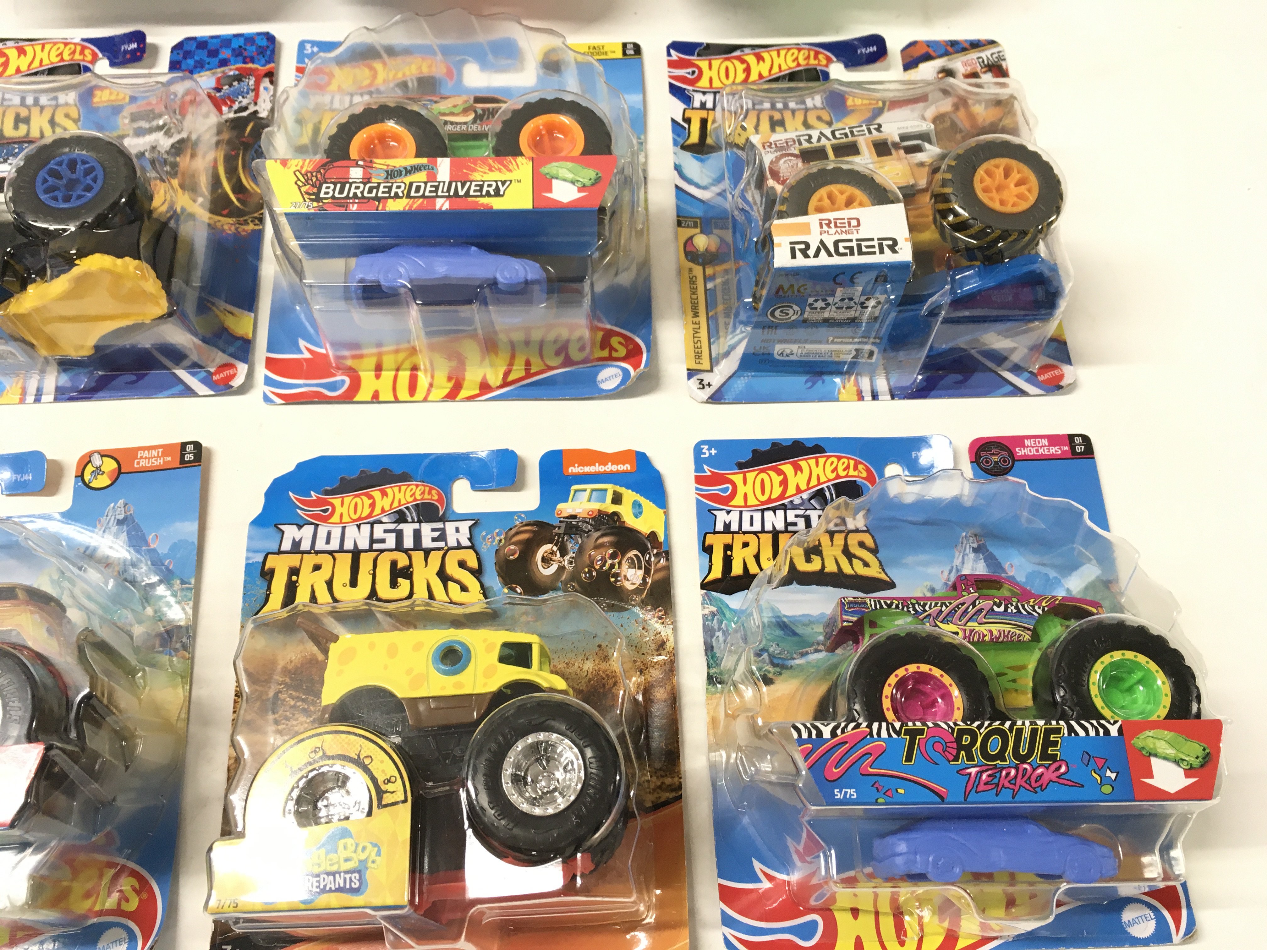 A collection of unopened Hot Wheels Monster Trucks 1:64 scale. Includes SpongeBob SquarePants..Super Mario Bowser plus others. No reserve