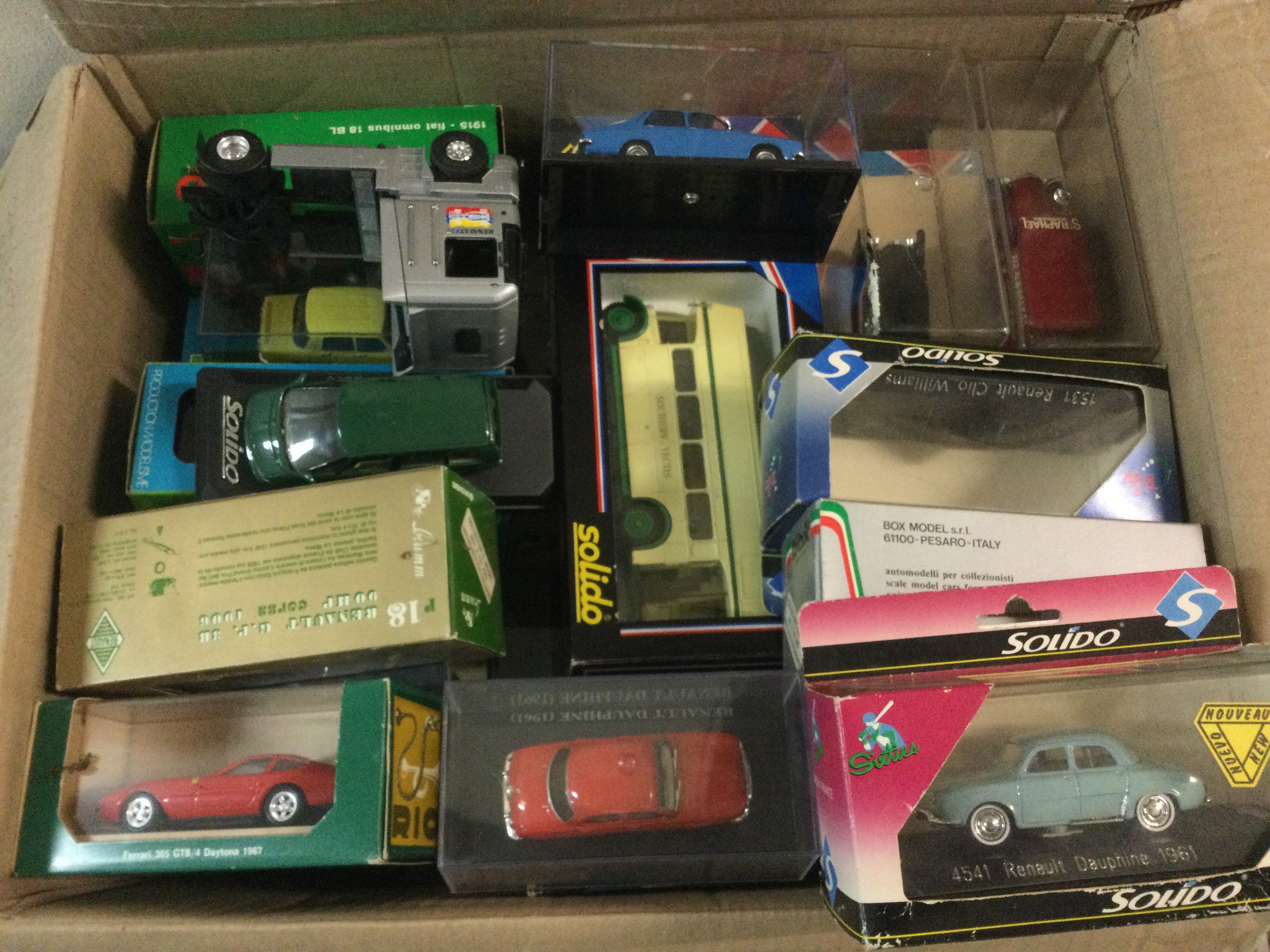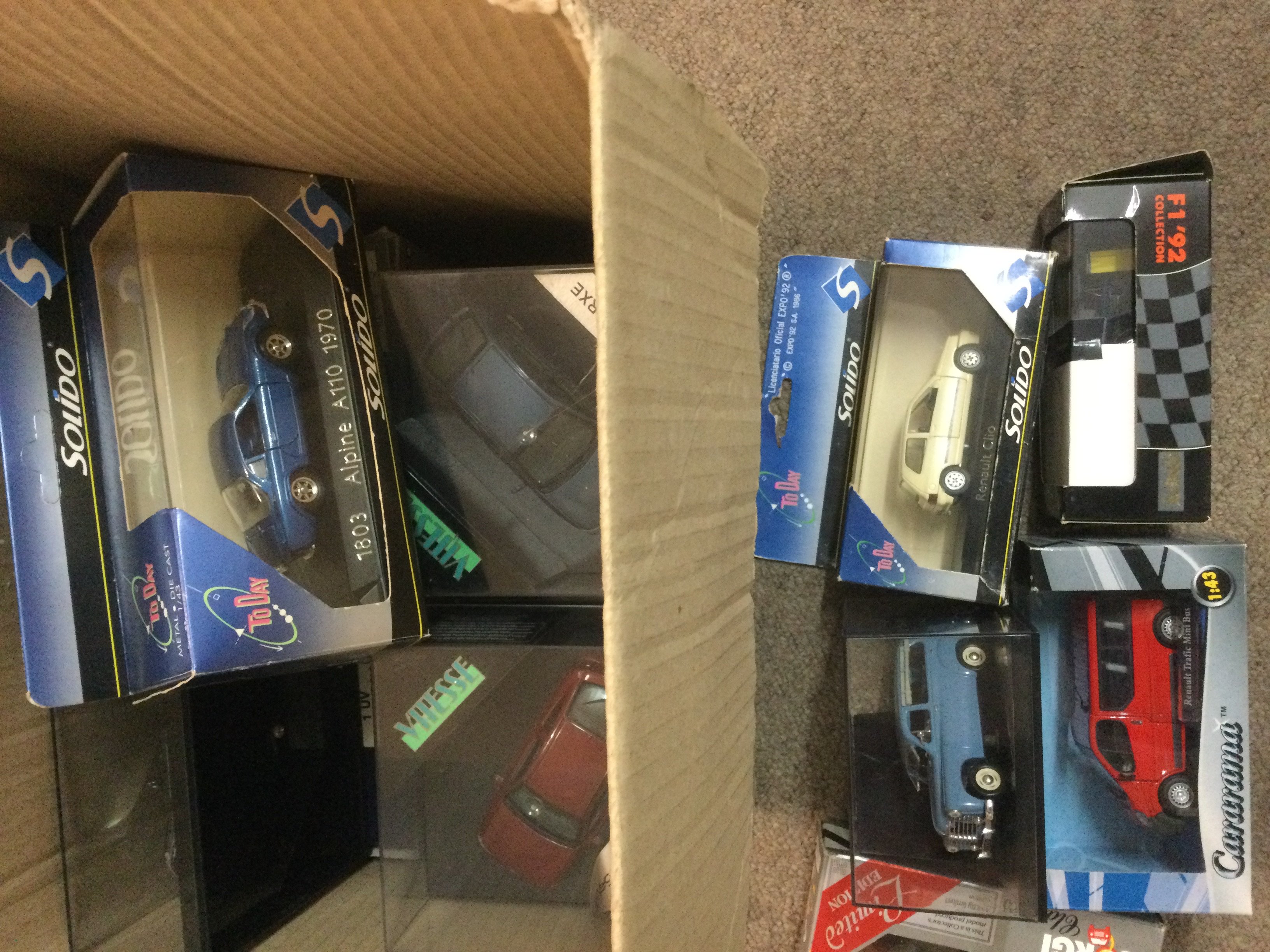 Three boxes of die cast vehicles comprising mostly boxed examples, makes include Dinky, Solido and others. Shipping category D.