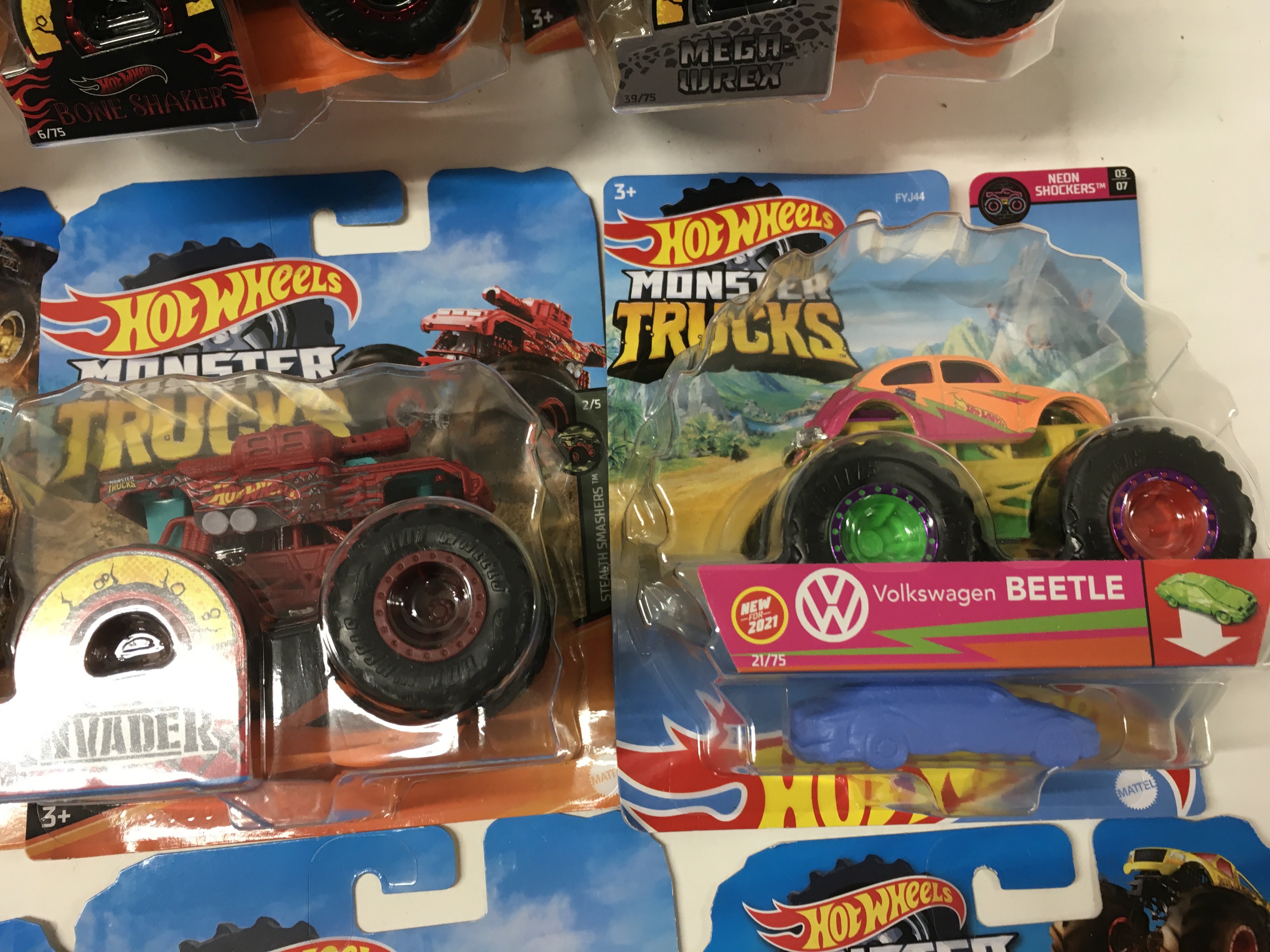 A collection of 12 Hot Wheels Monster Trucks 1:64 scale. Includes All Fried Up..Zombie Wrex..plus others. No reserve