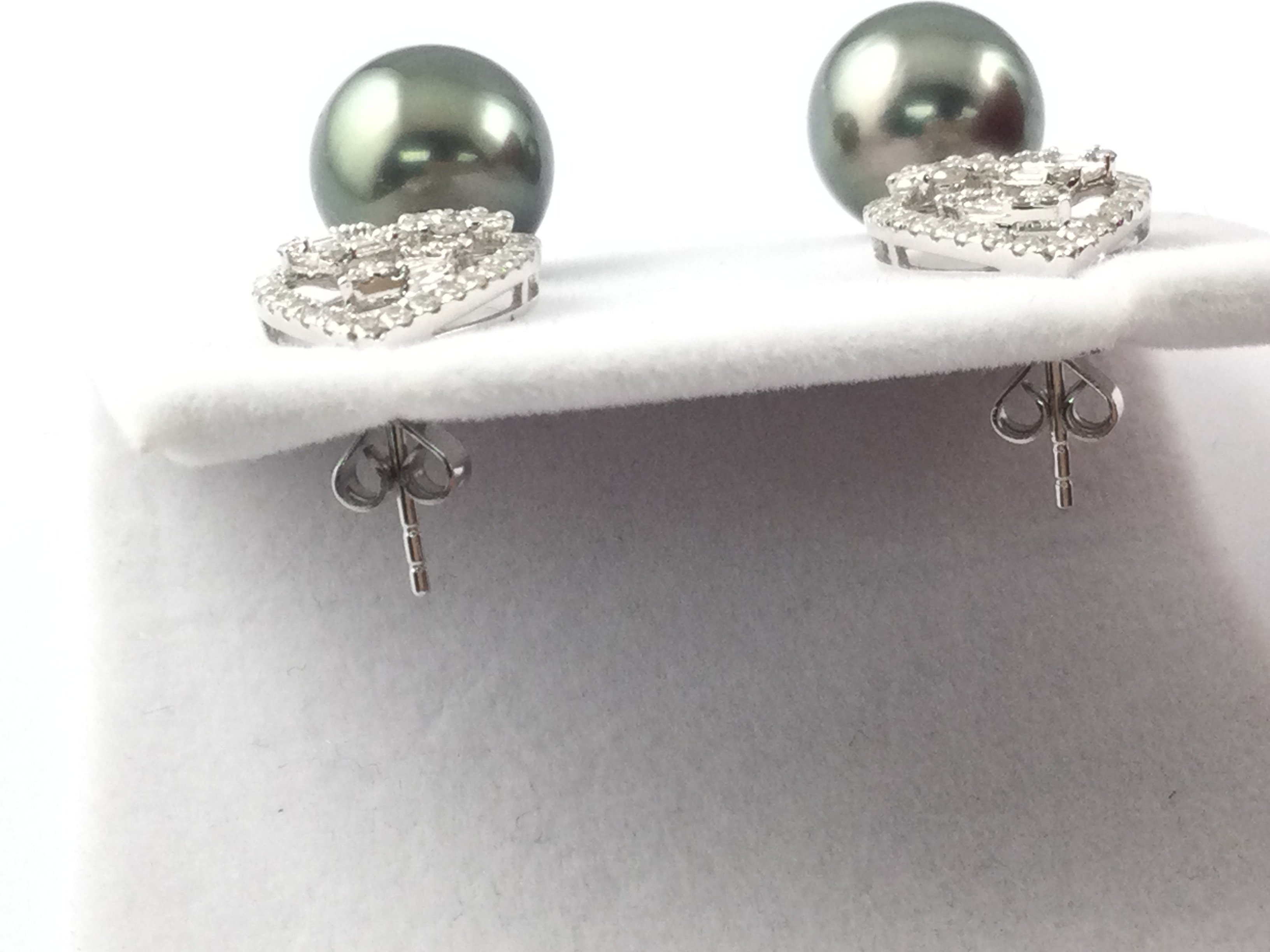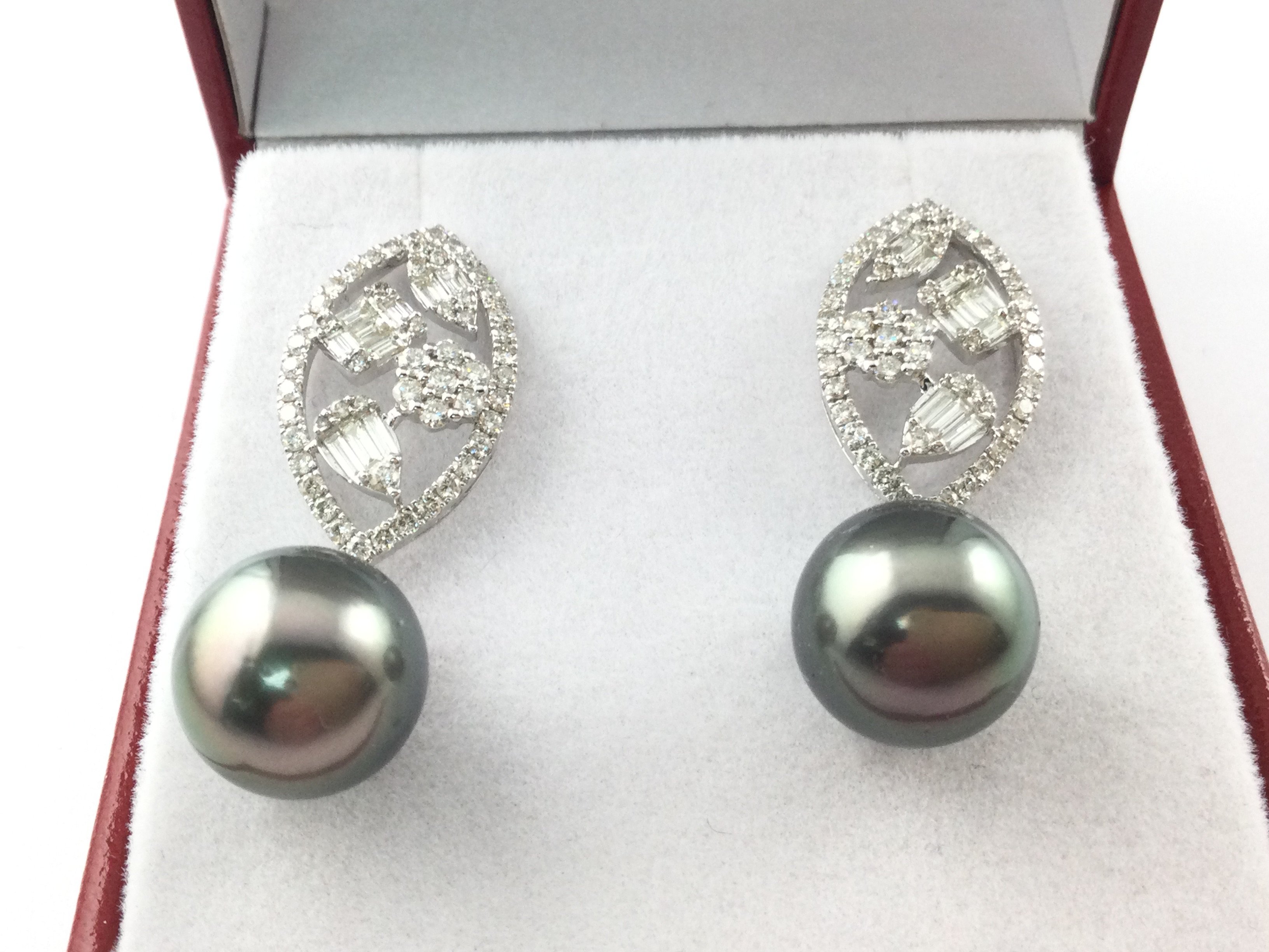 A pair of 18ct white gold drop earrings with Tahitian pearls and diamonds set large marquise shaped openwork bales. Approximately 1.71ct diamonds. Postage B