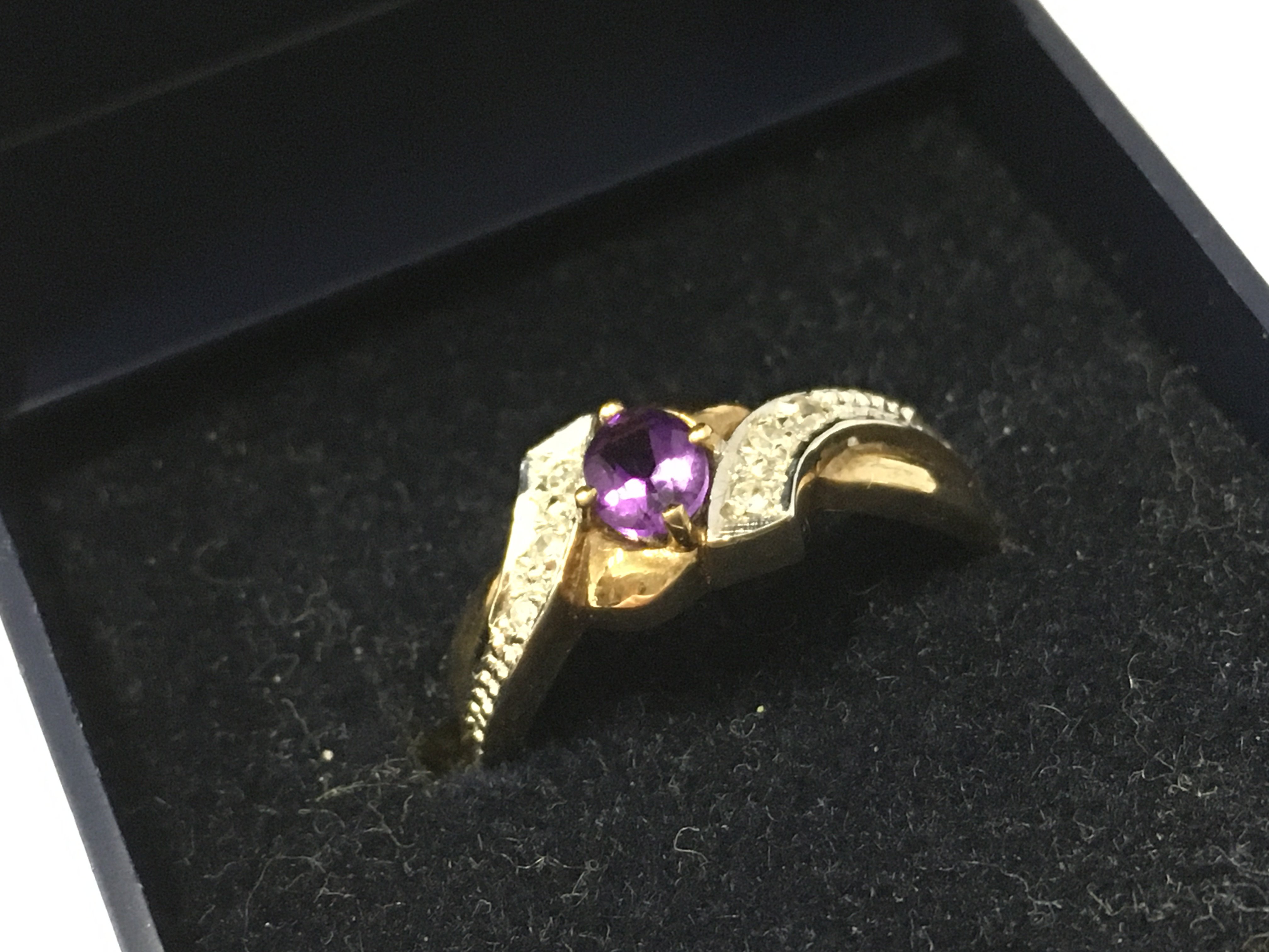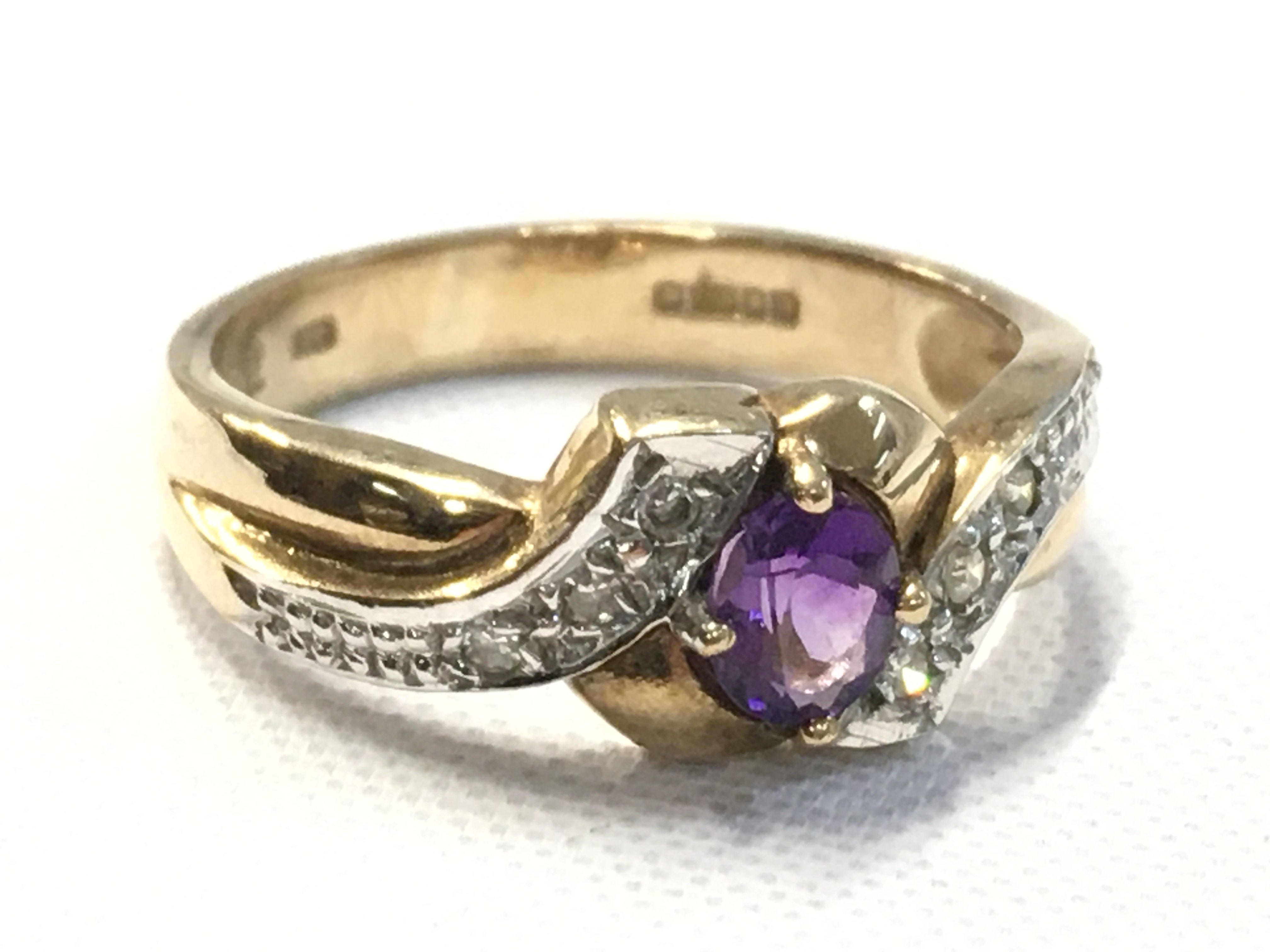 A purple sapphire and diamond set 9ct gold ring , size O. 3g total weight