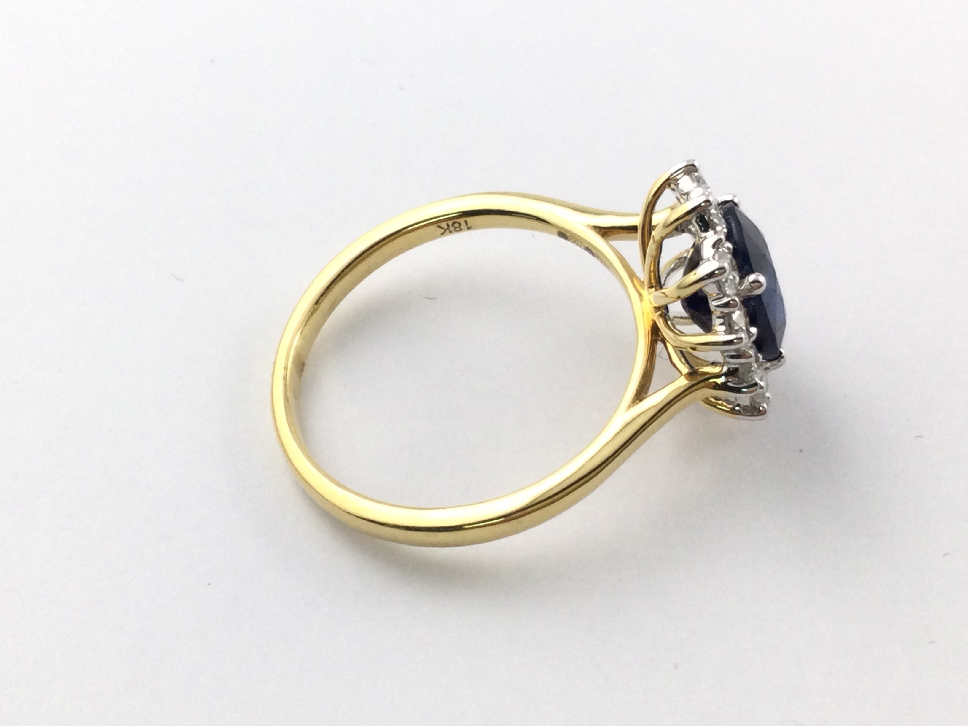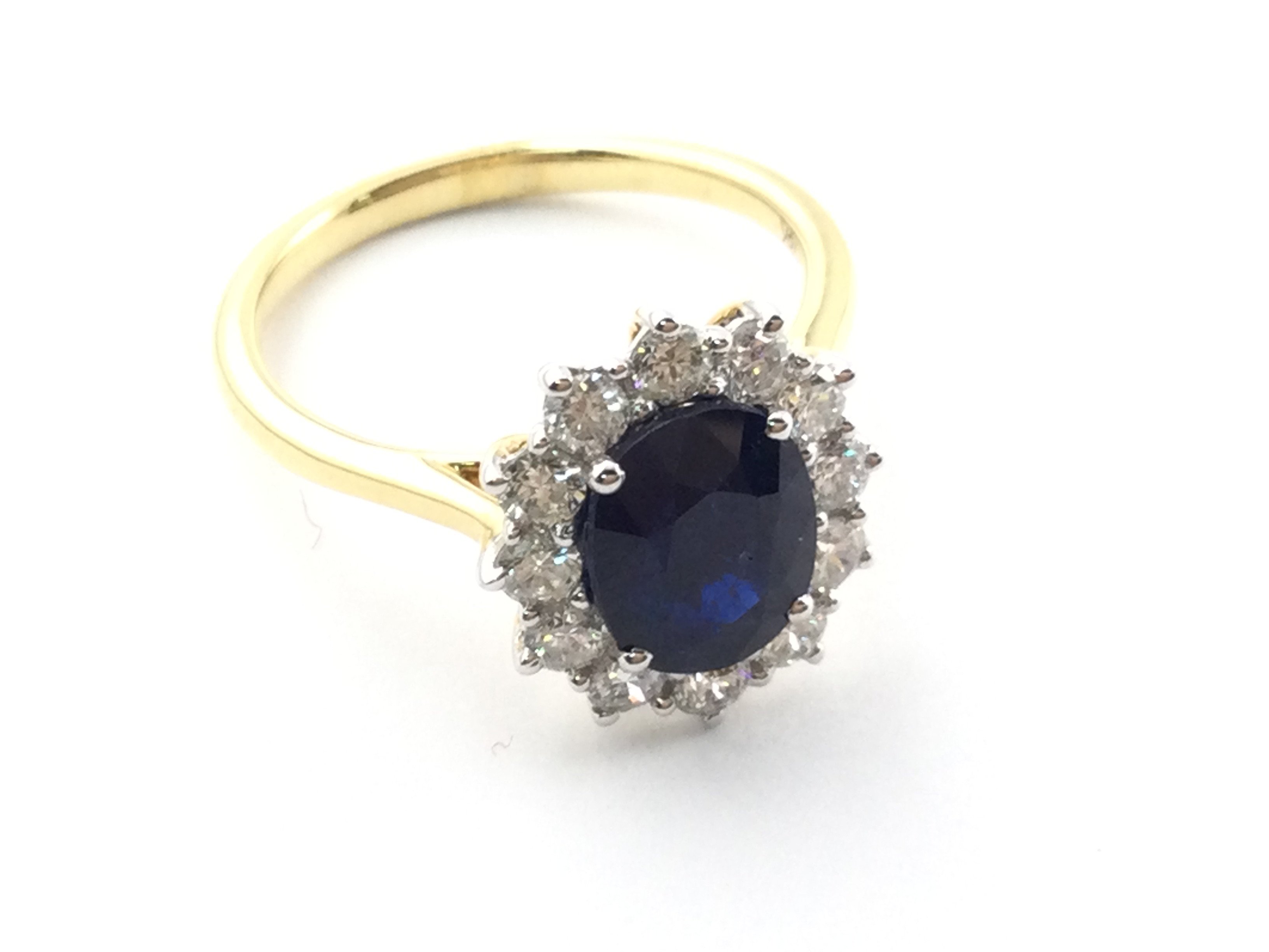 An 18ct yellow and white gold oval sapphire and diamond cluster ring. Sapphire 3.03ct and diamonds 0.84ct size P
