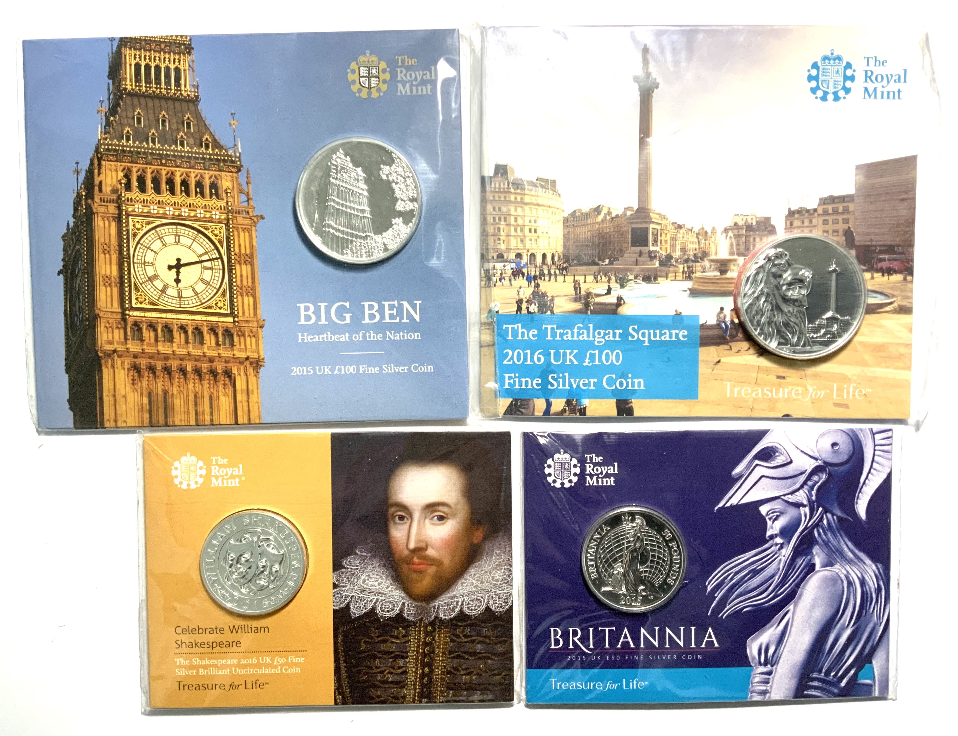 2 Royal Mint 100 2015/2016 fine silver coins together with 2 50 2015/2016 coins.