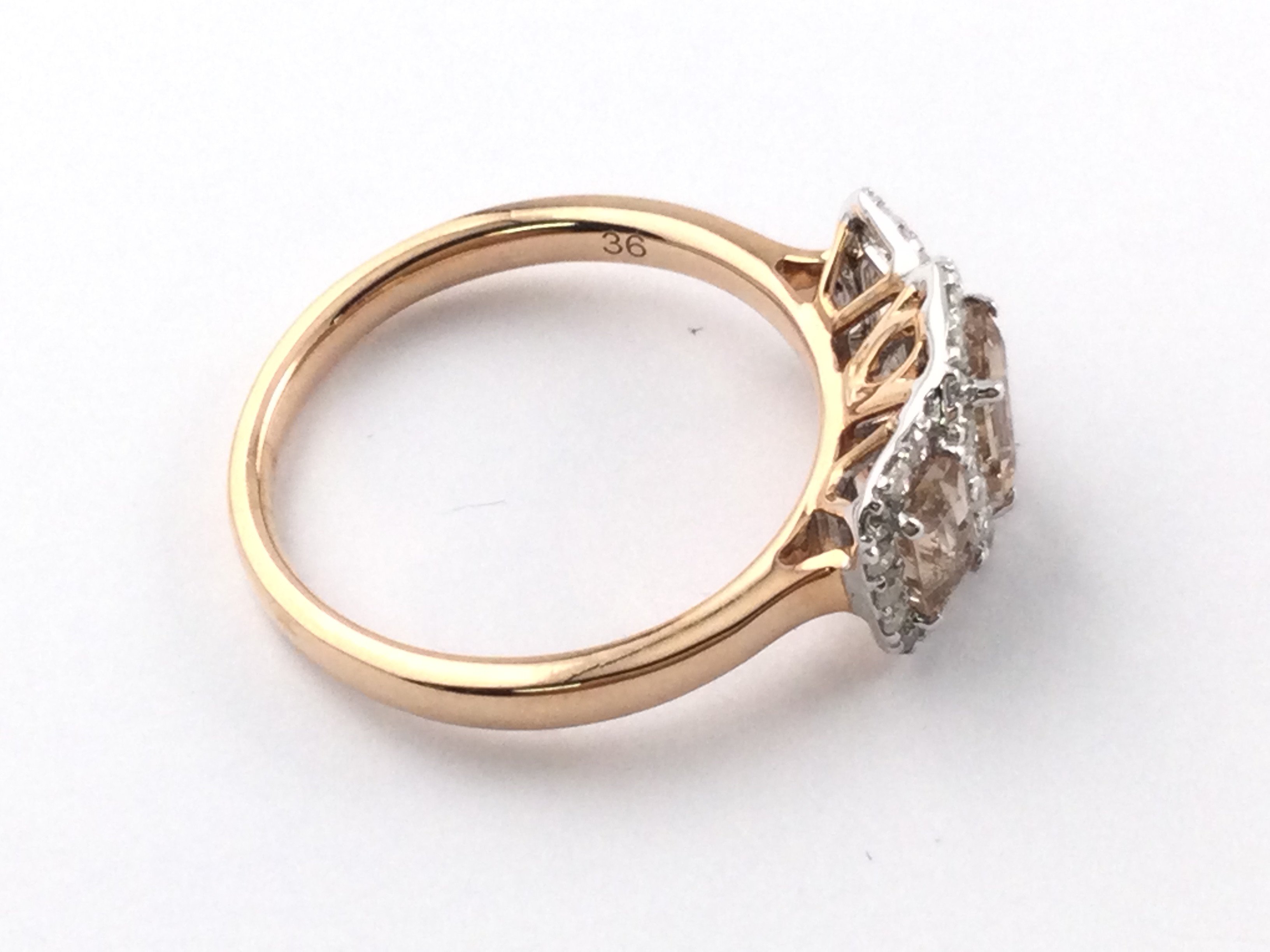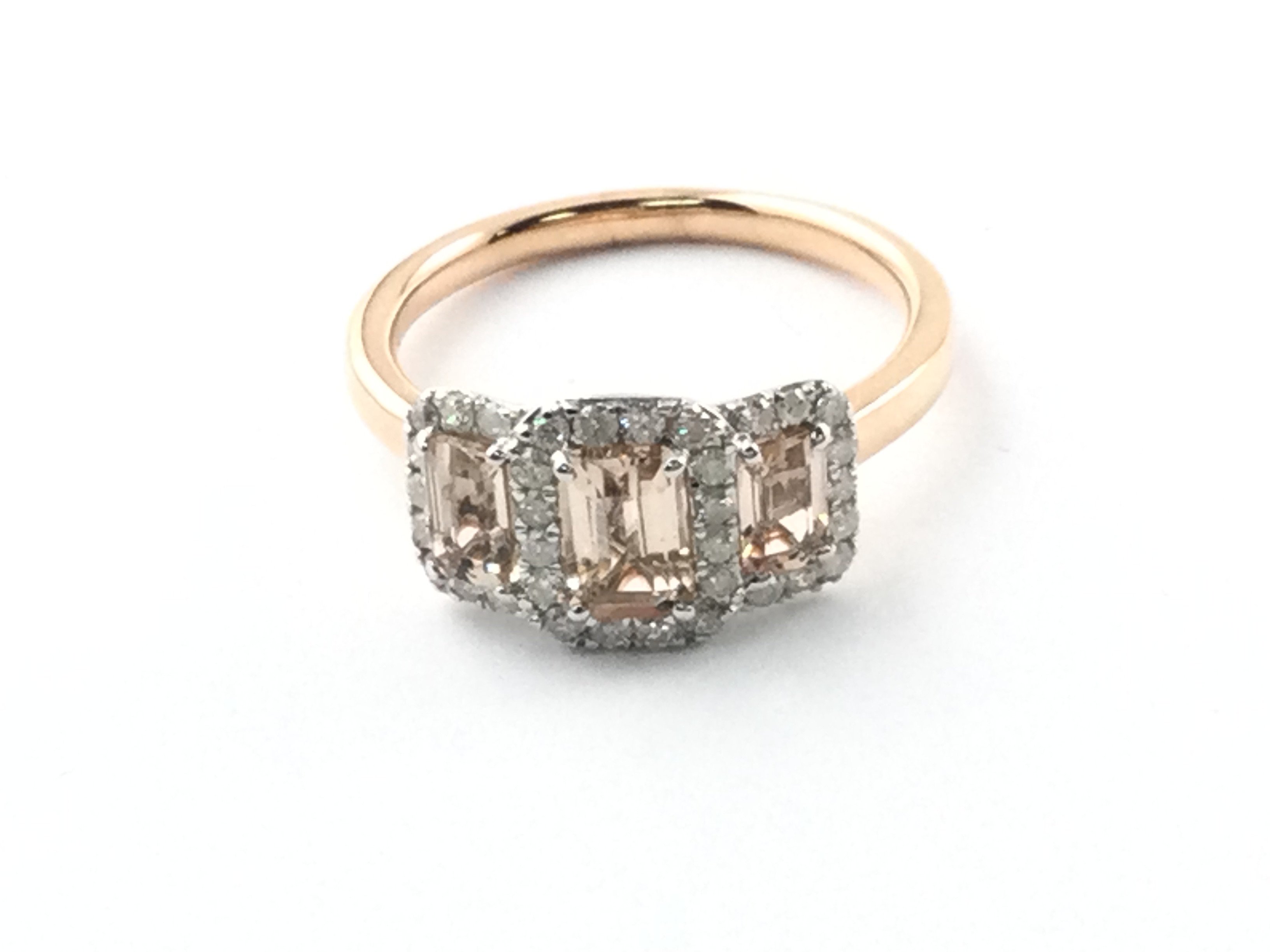 9ct rose gold and white gold Art Deco style ring set with step cut morganites each surrounded by diamonds. Morganites 1.22ct and diamonds 0.34ct. Size N 1/2