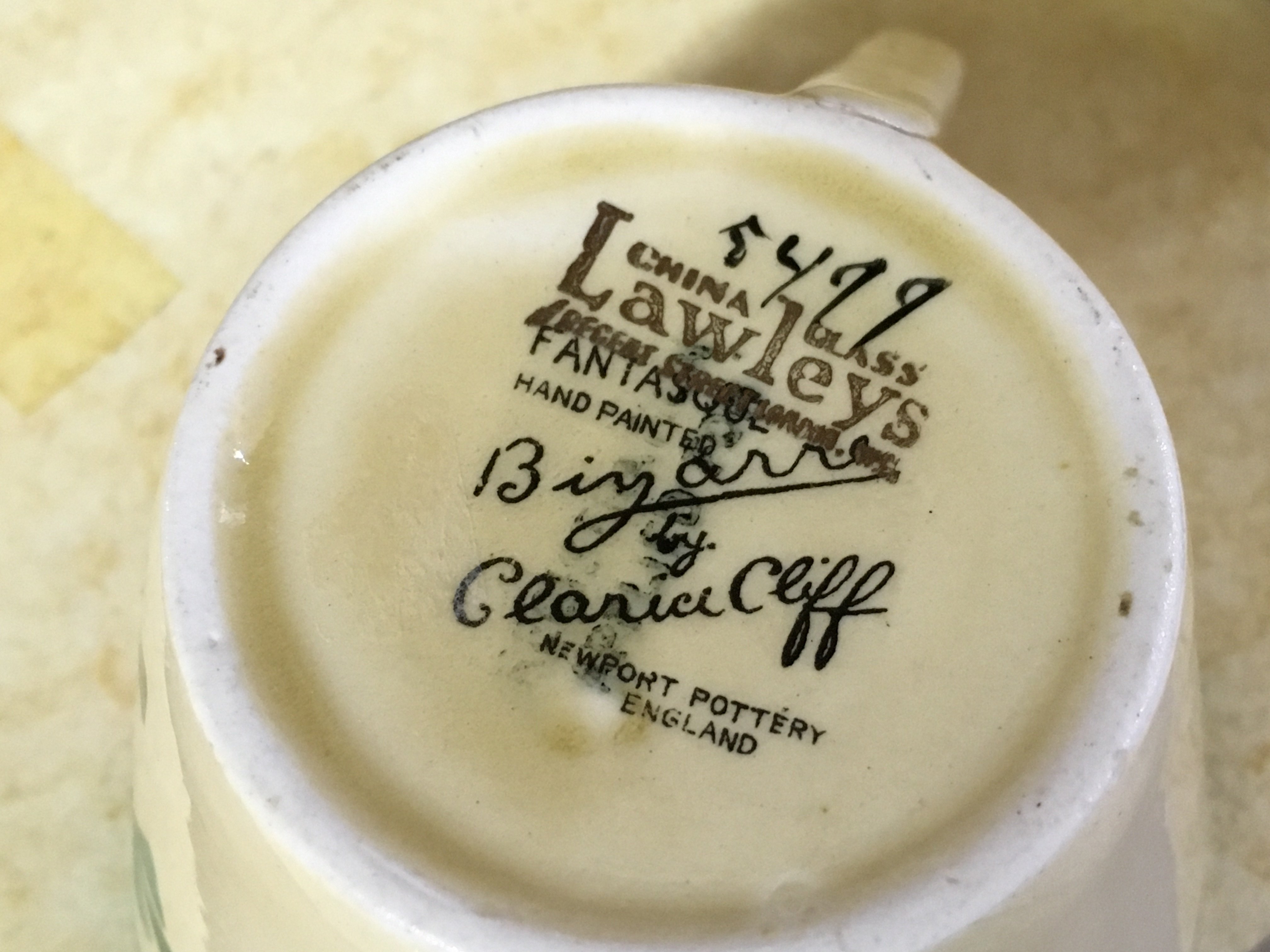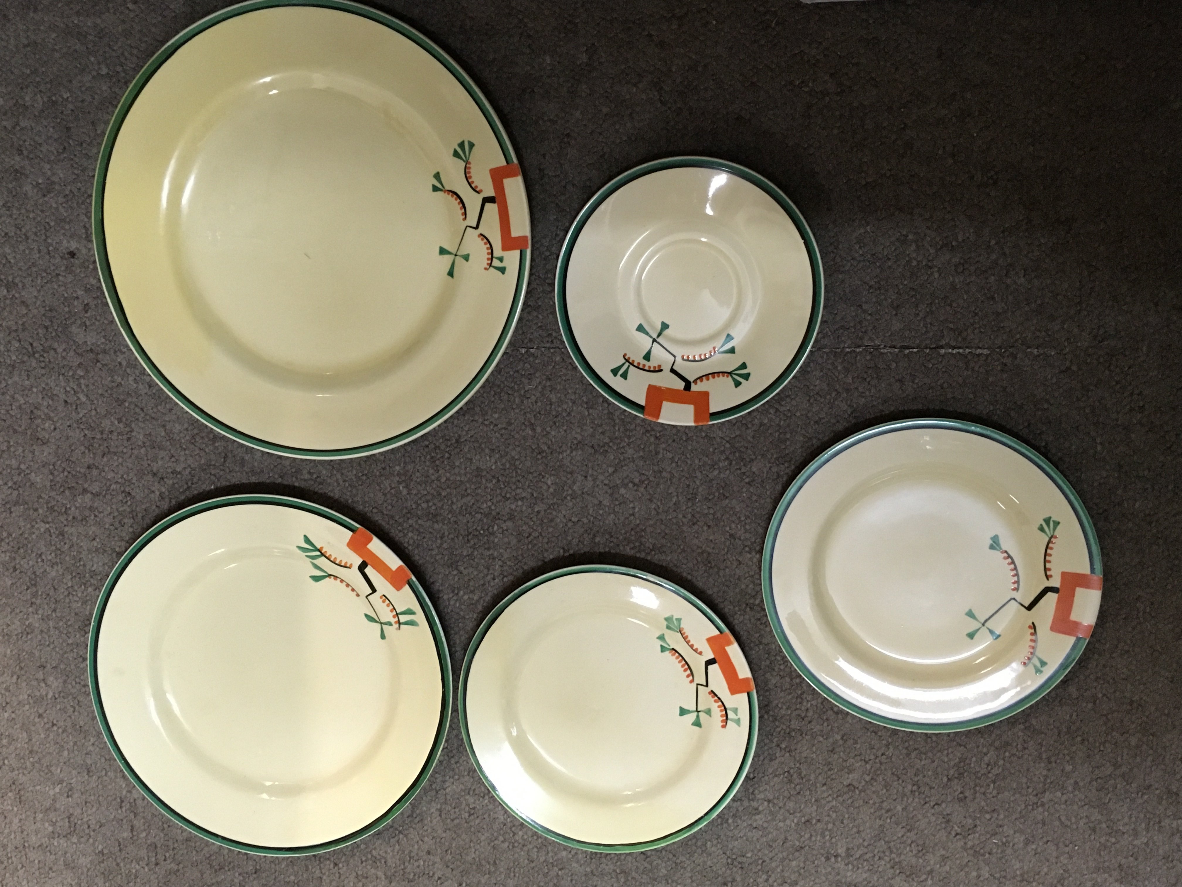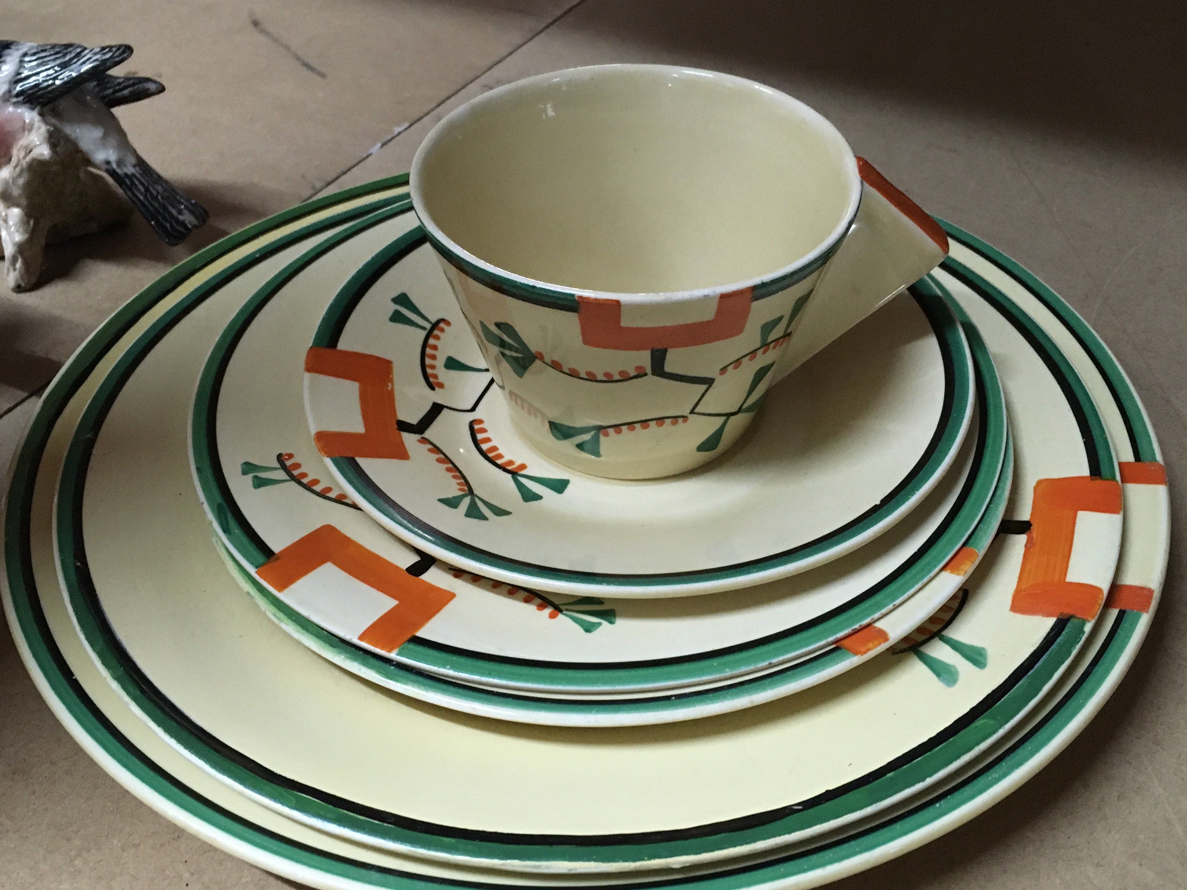 A Clarice Cliff Rauel 1930s art deco ravel pattern conical trio plus plates , this lot cannot be posted . Some fading, no obvious large damage