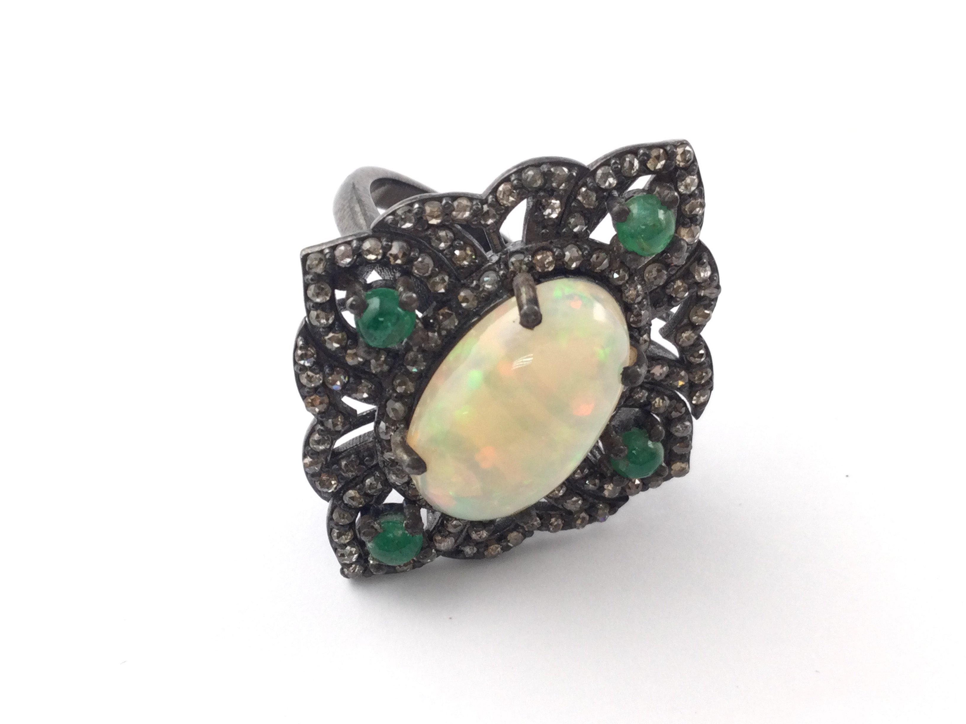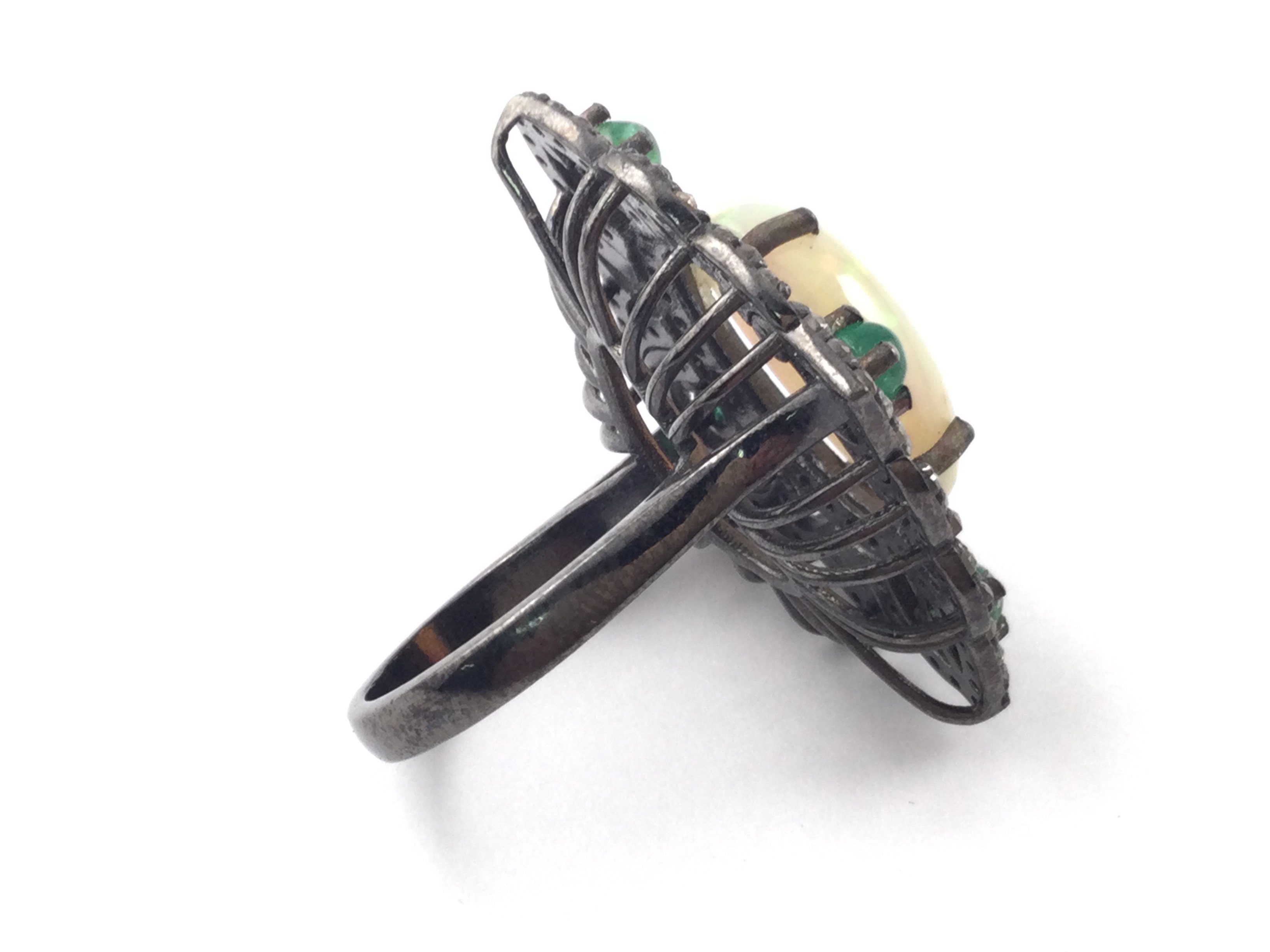 Large dress ring set with an oval cabochon opal round cabochon emeralds and diamonds. Set in rhodium coated silver. Approximately 4ct opal 1ct diamonds and 0.50ct emeralds. Size O
