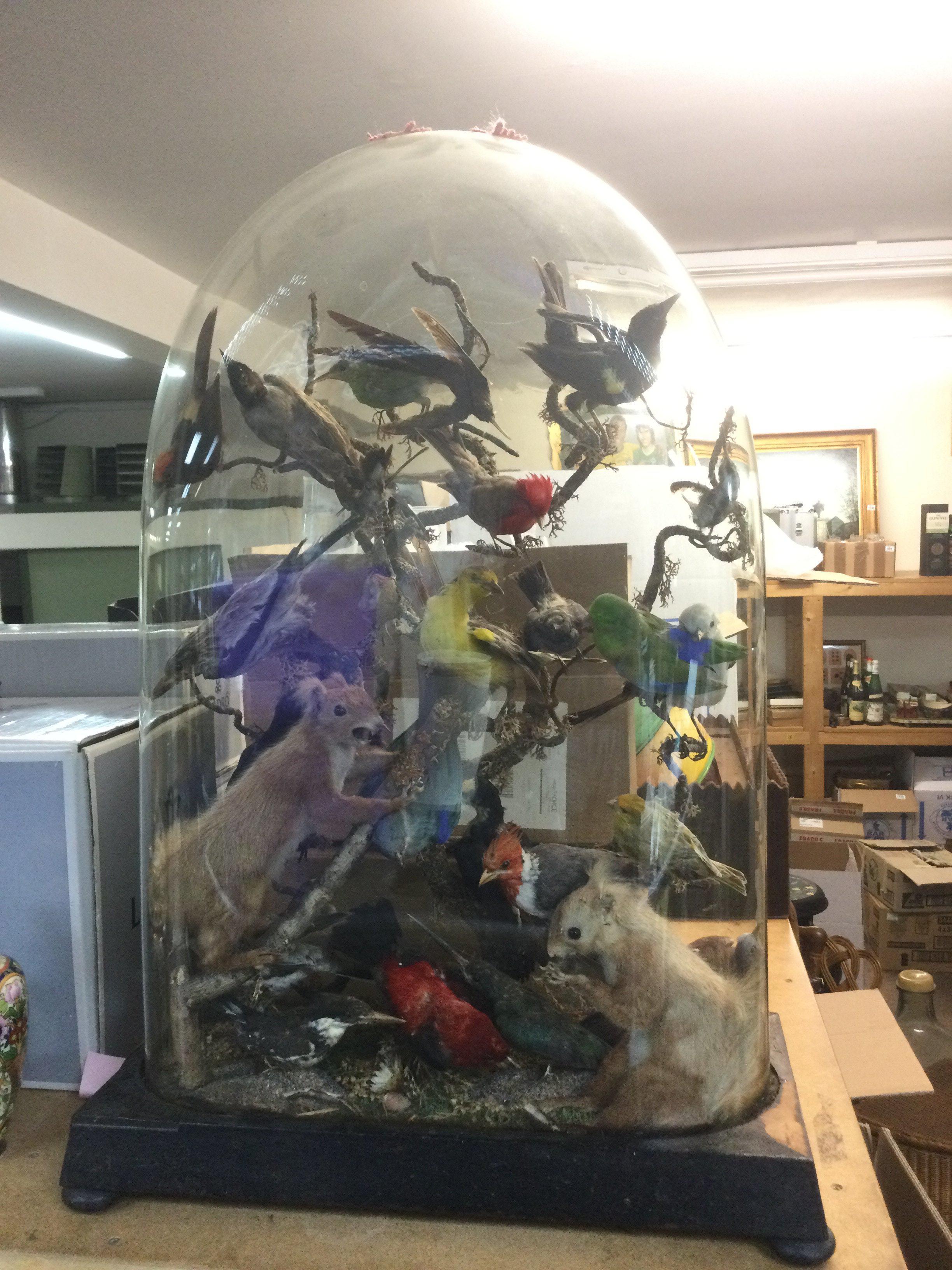 Taxidermy. A case containing squirrels and birds underneath a glass dome. Shipping category D.