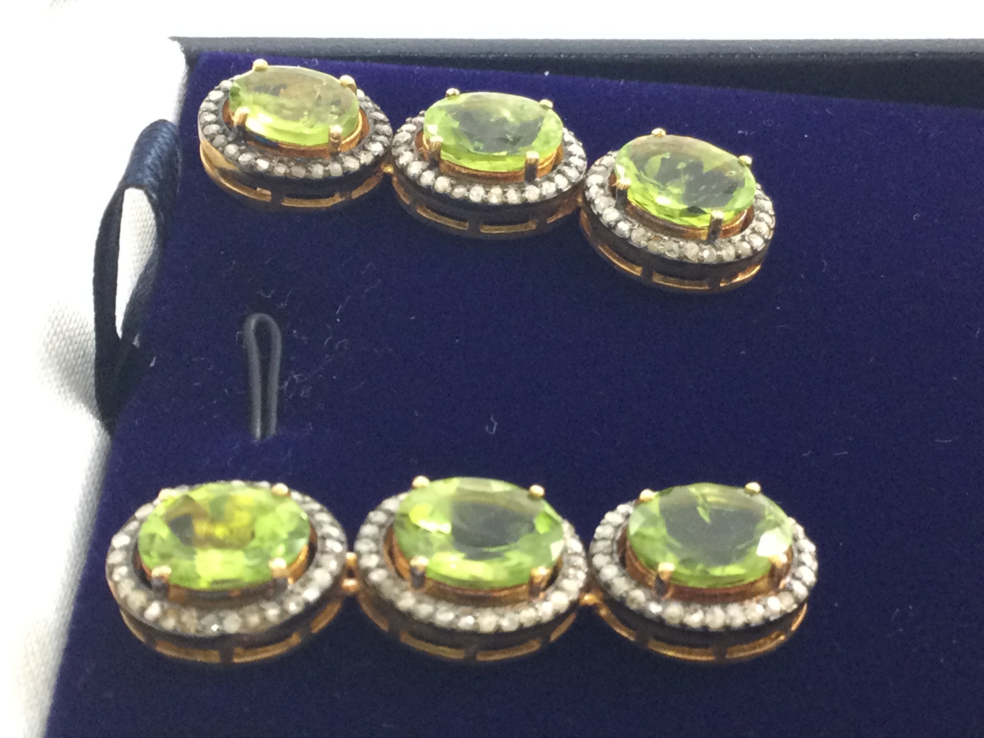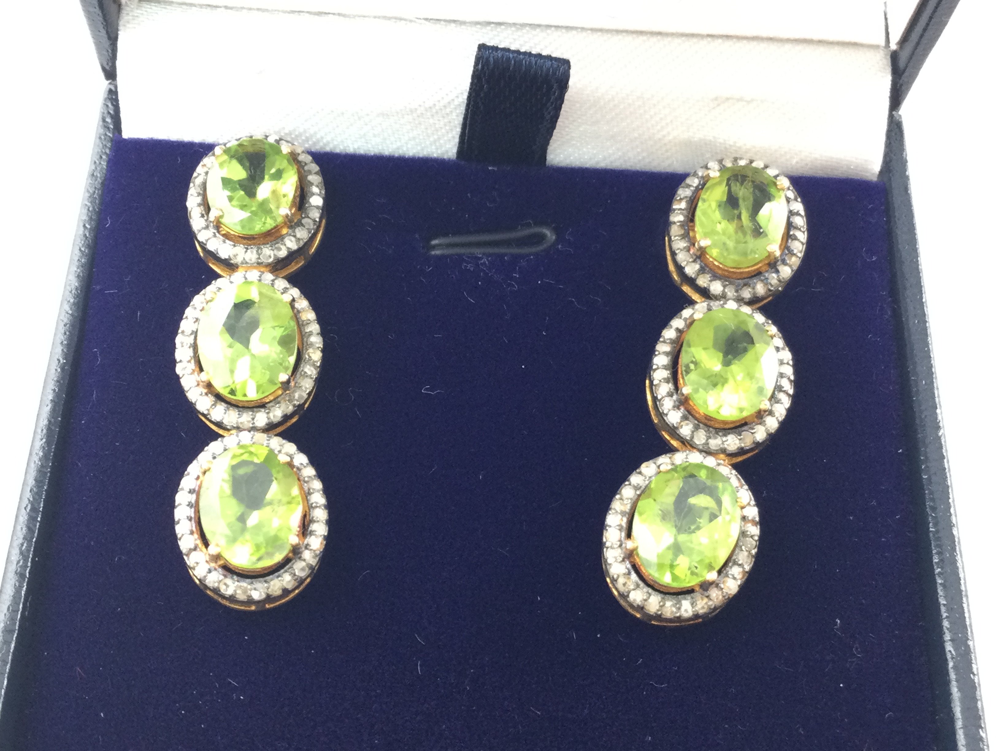 A pair of triple halo drop earrings in silver gilt set with oval peridot and diamond clusters. Approximately 12ct peridots and 0.80ct diamonds.