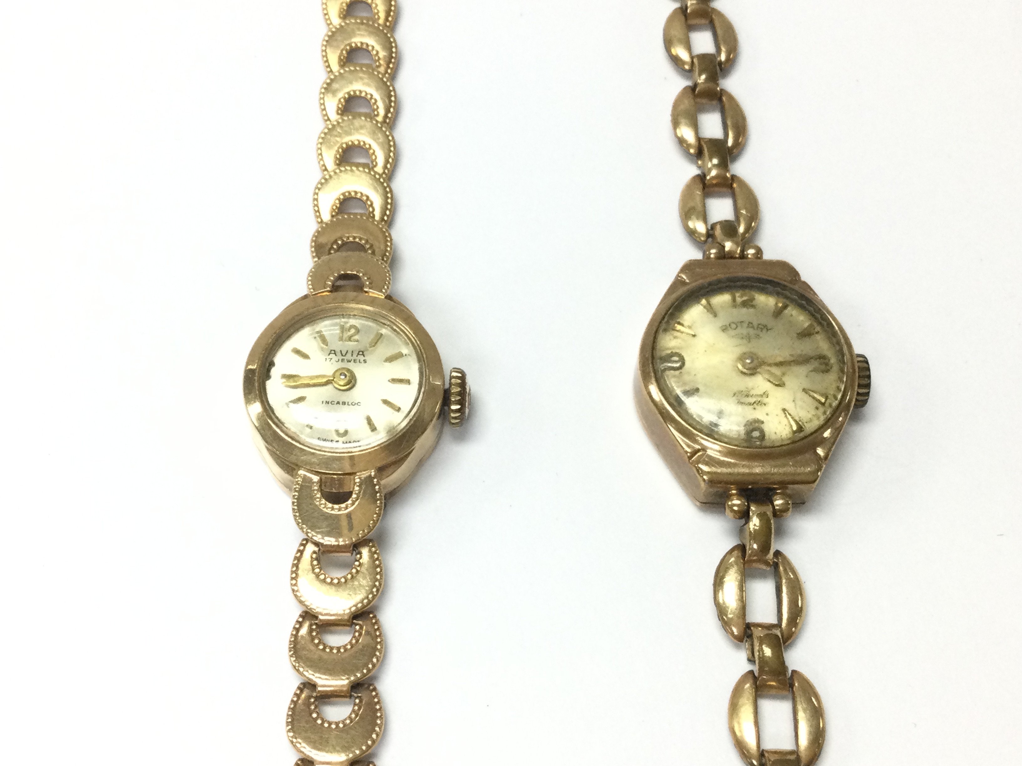A 9ct vintage ladies Avia wrist watch 11.69g and a 9ct metal core ladies rotary watch 12g. Postage B