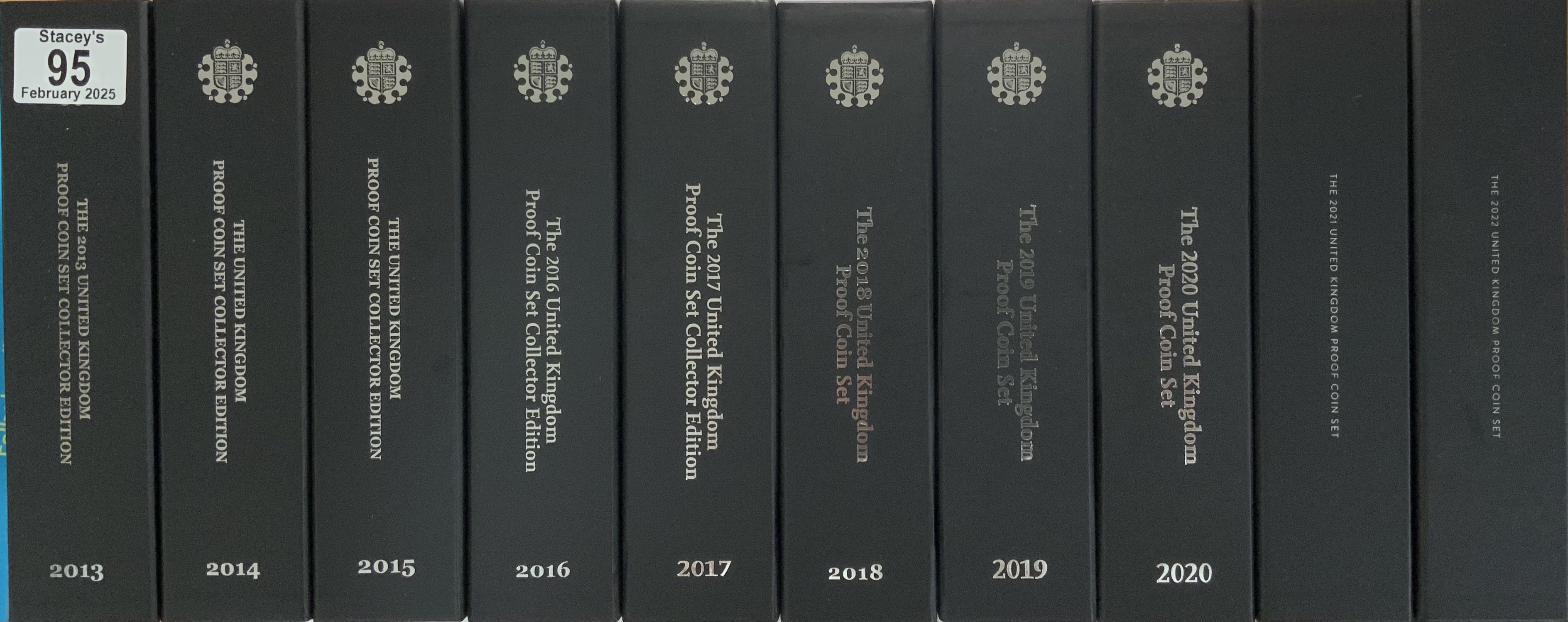 Royal Mint United Kingdom proof coin sets. 2013 - 2022, including 2016 Master Proof set