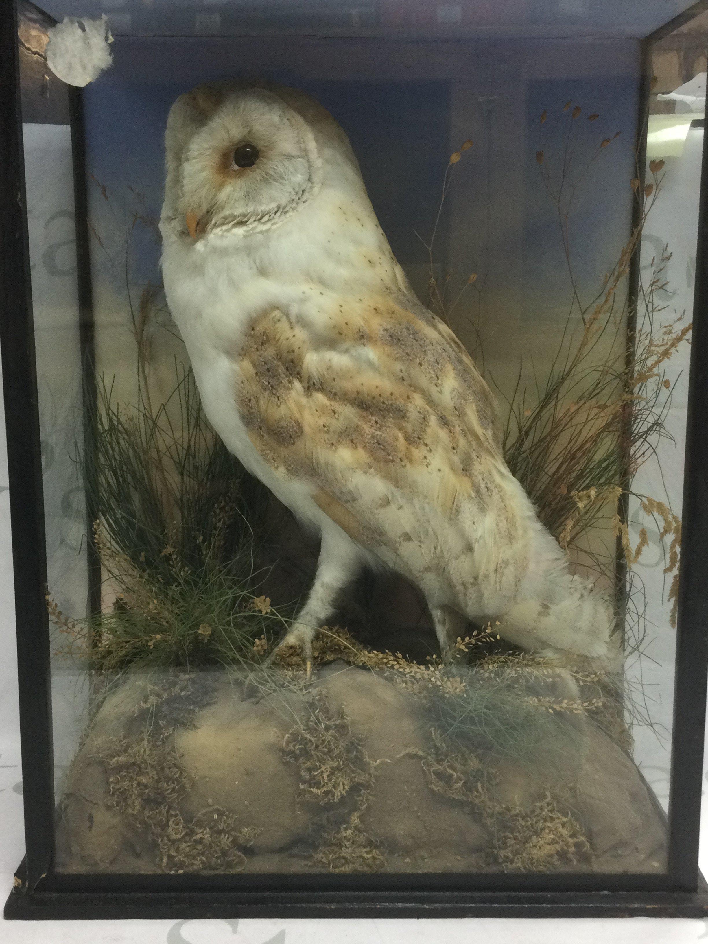 Taxidermy. A barn owl housed in a glass case, approx height 42cm. Shipping category D.