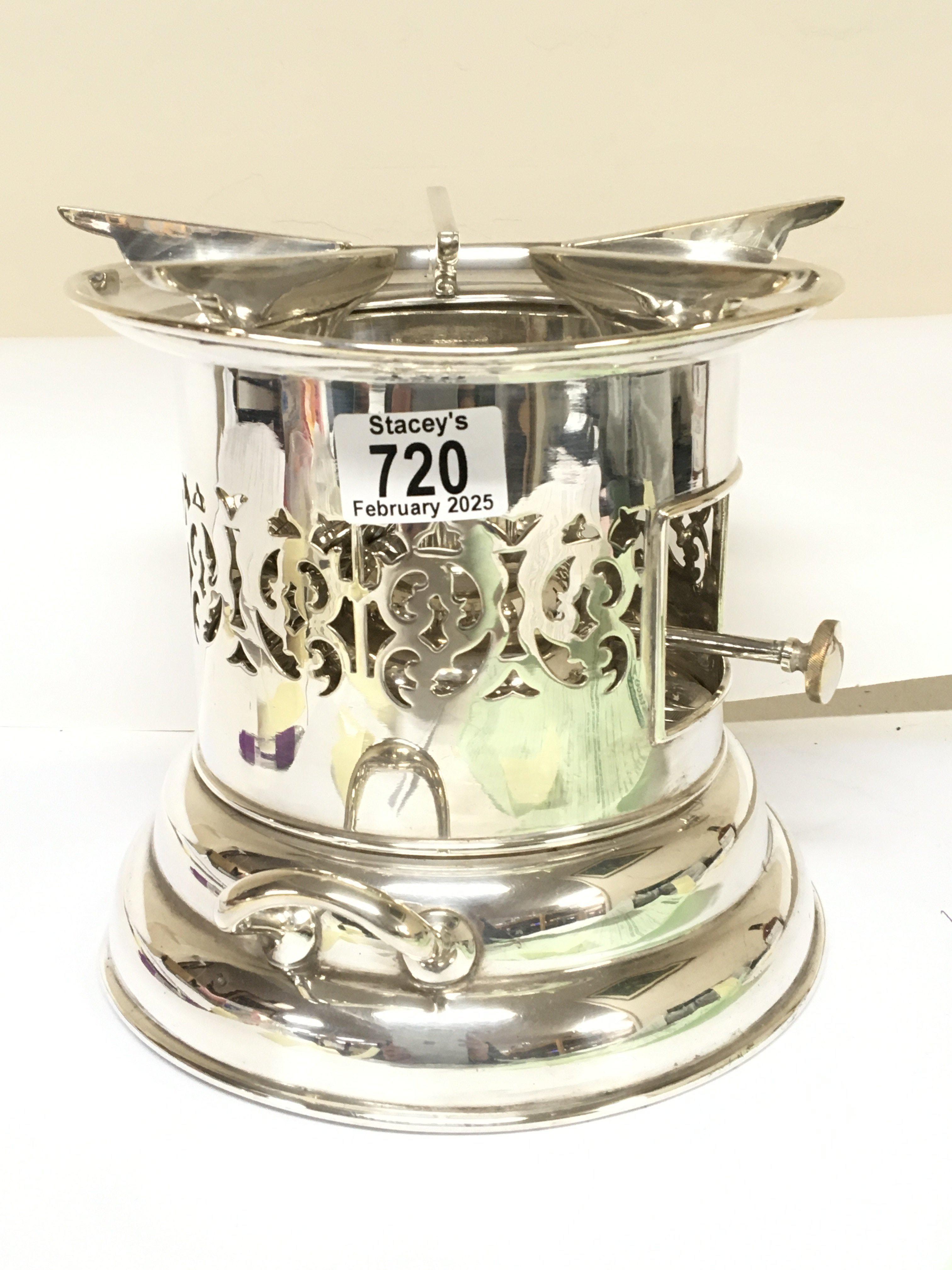 A silver plated flambe stand with burner and raised handles to the side Hight 20cm
