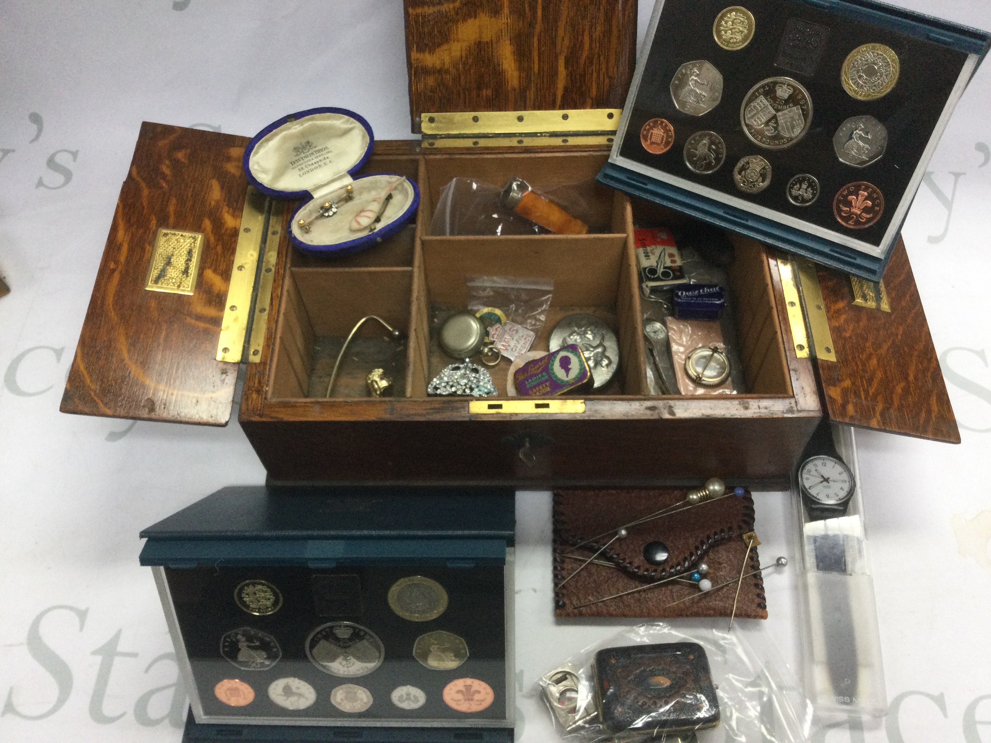 A box of oddments comprising coin sets, hat pins, Sovereign case etc. Shipping category D.