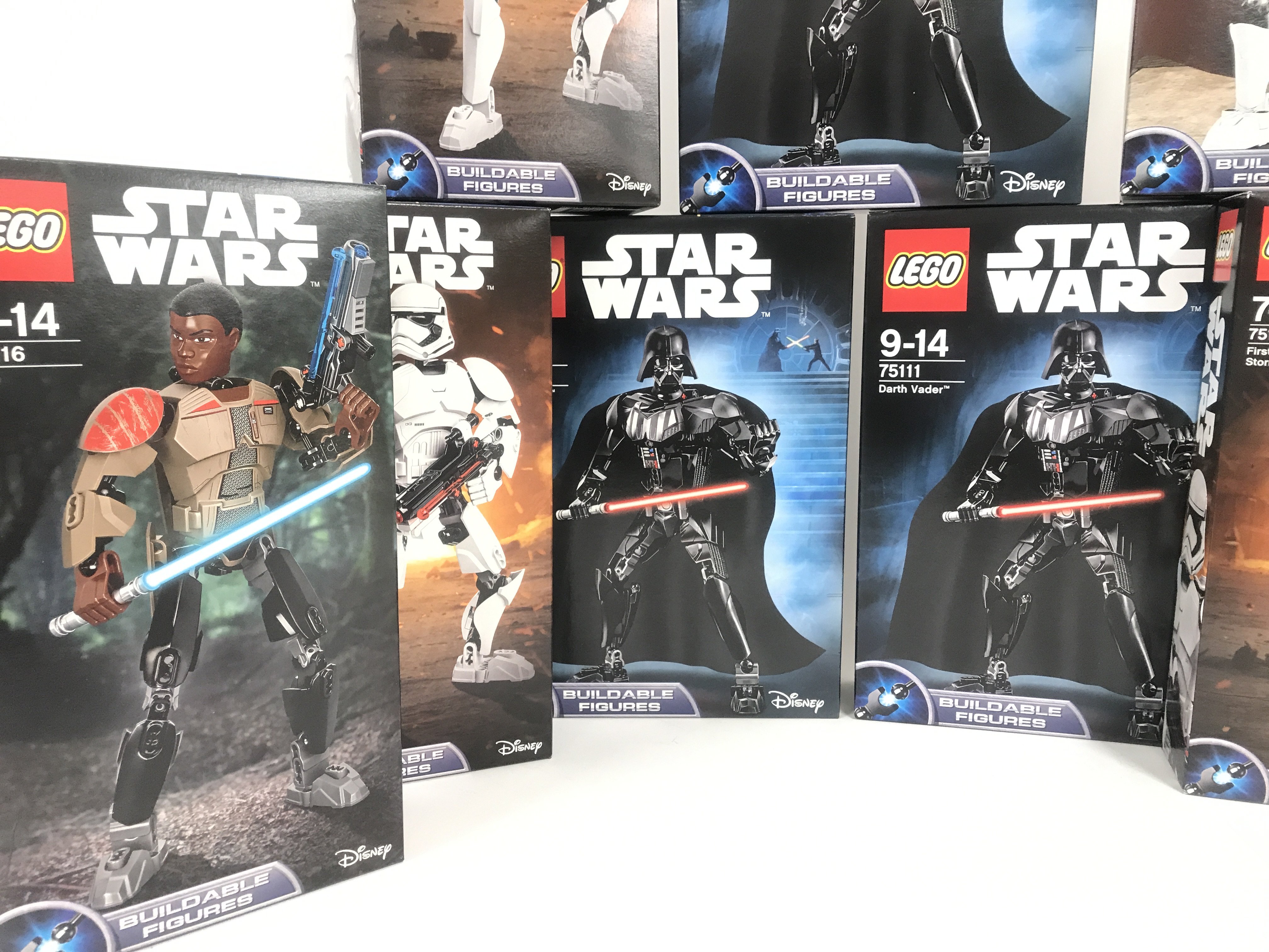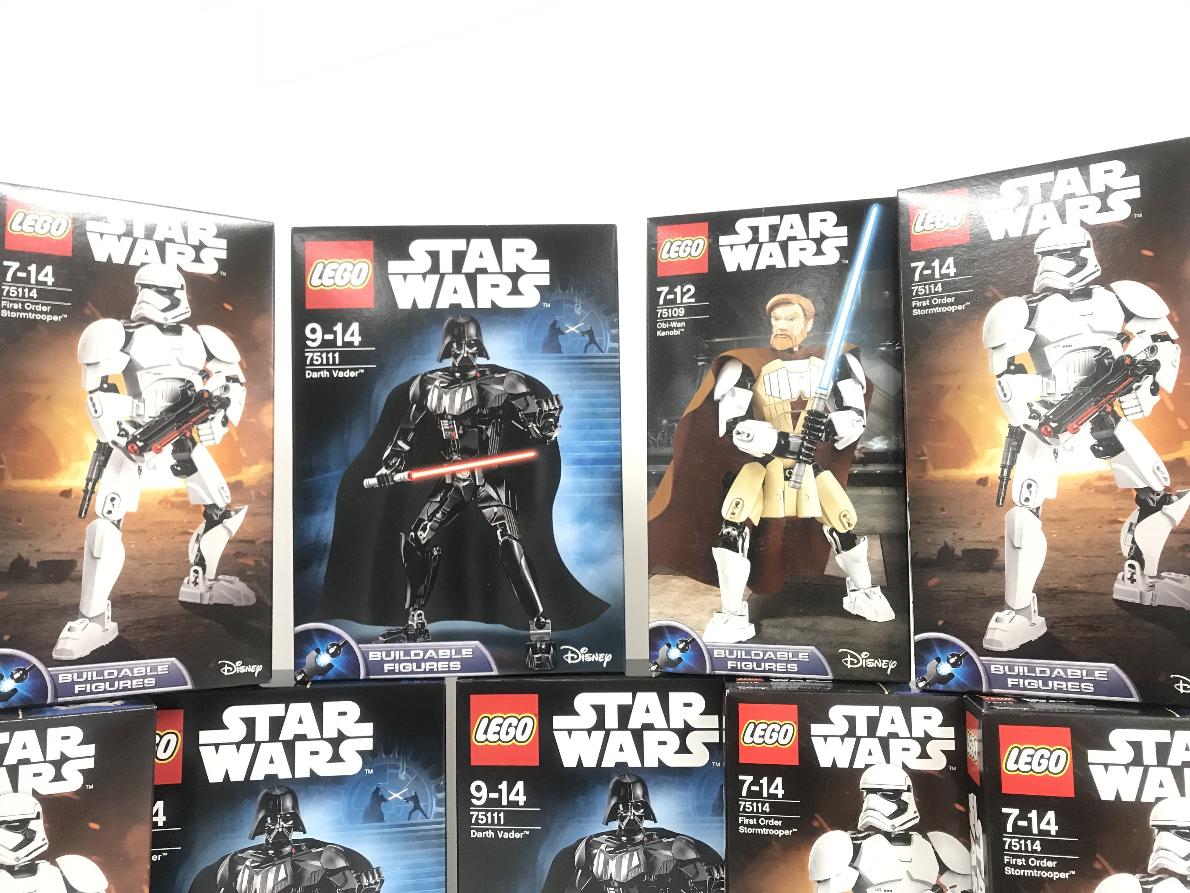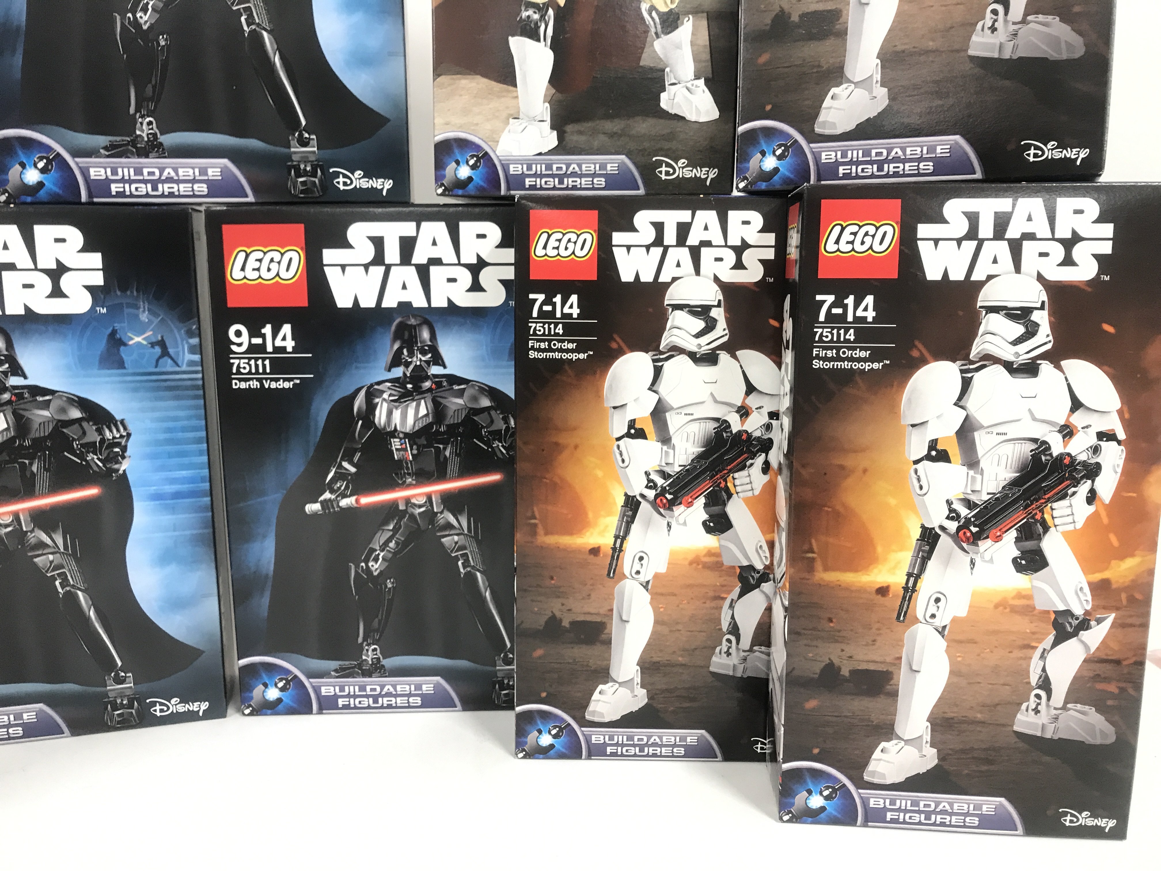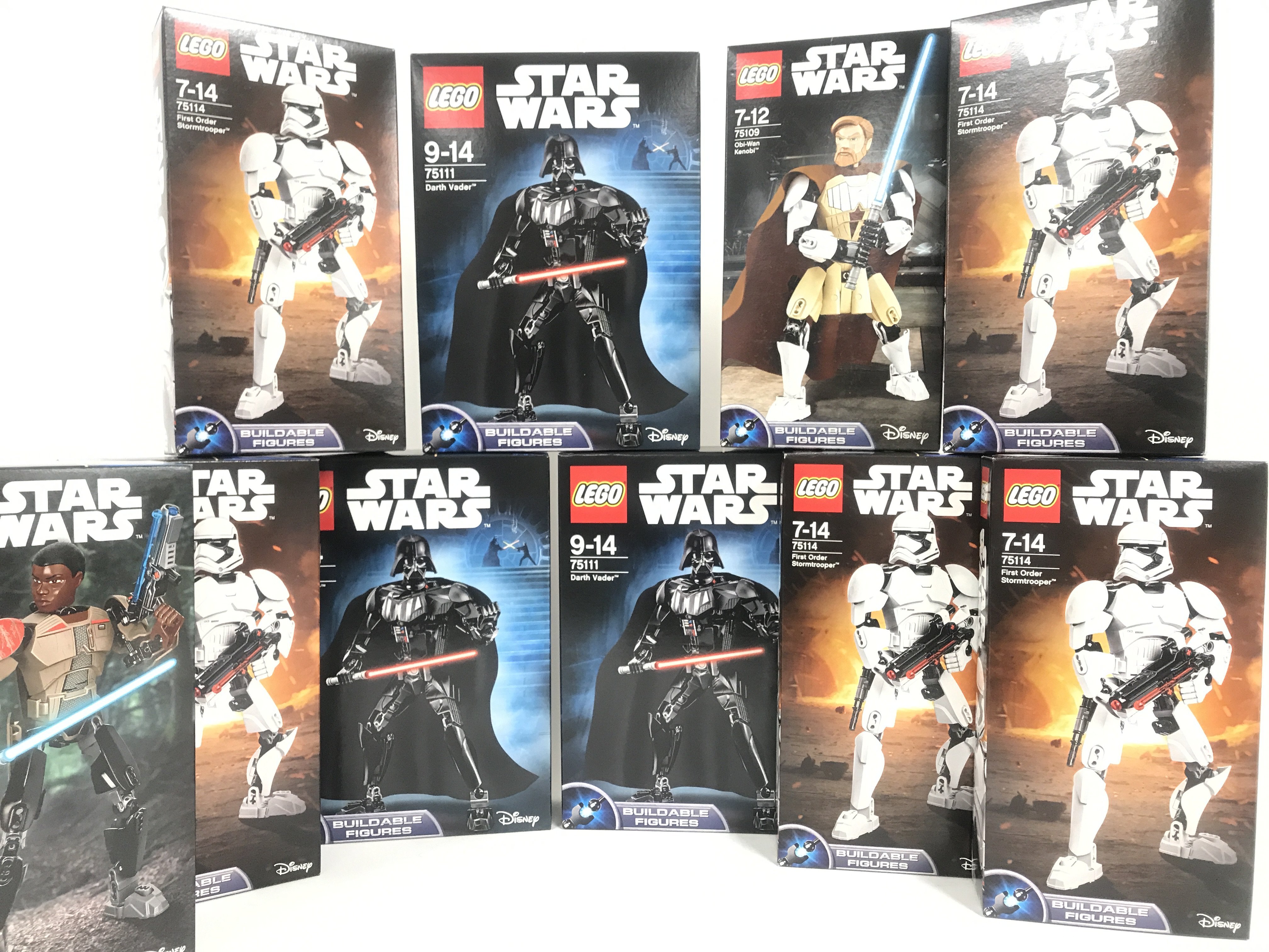 10 Boxed And Sealed Lego Buildable Figures including First Order Stormtroopers #75114. Darth Vader #75111. Finn #75116 And Obi-Wan Kenobi #75109.