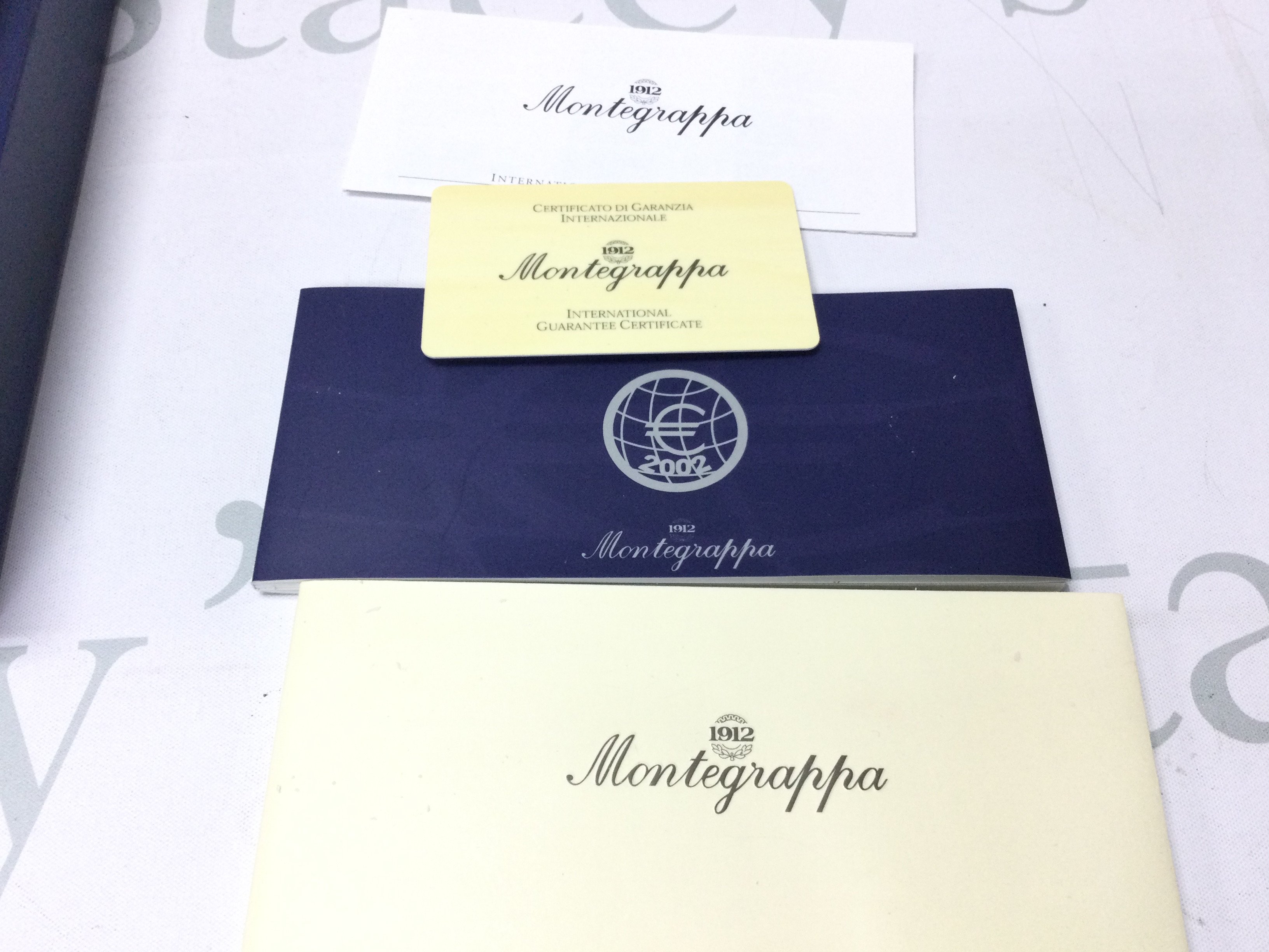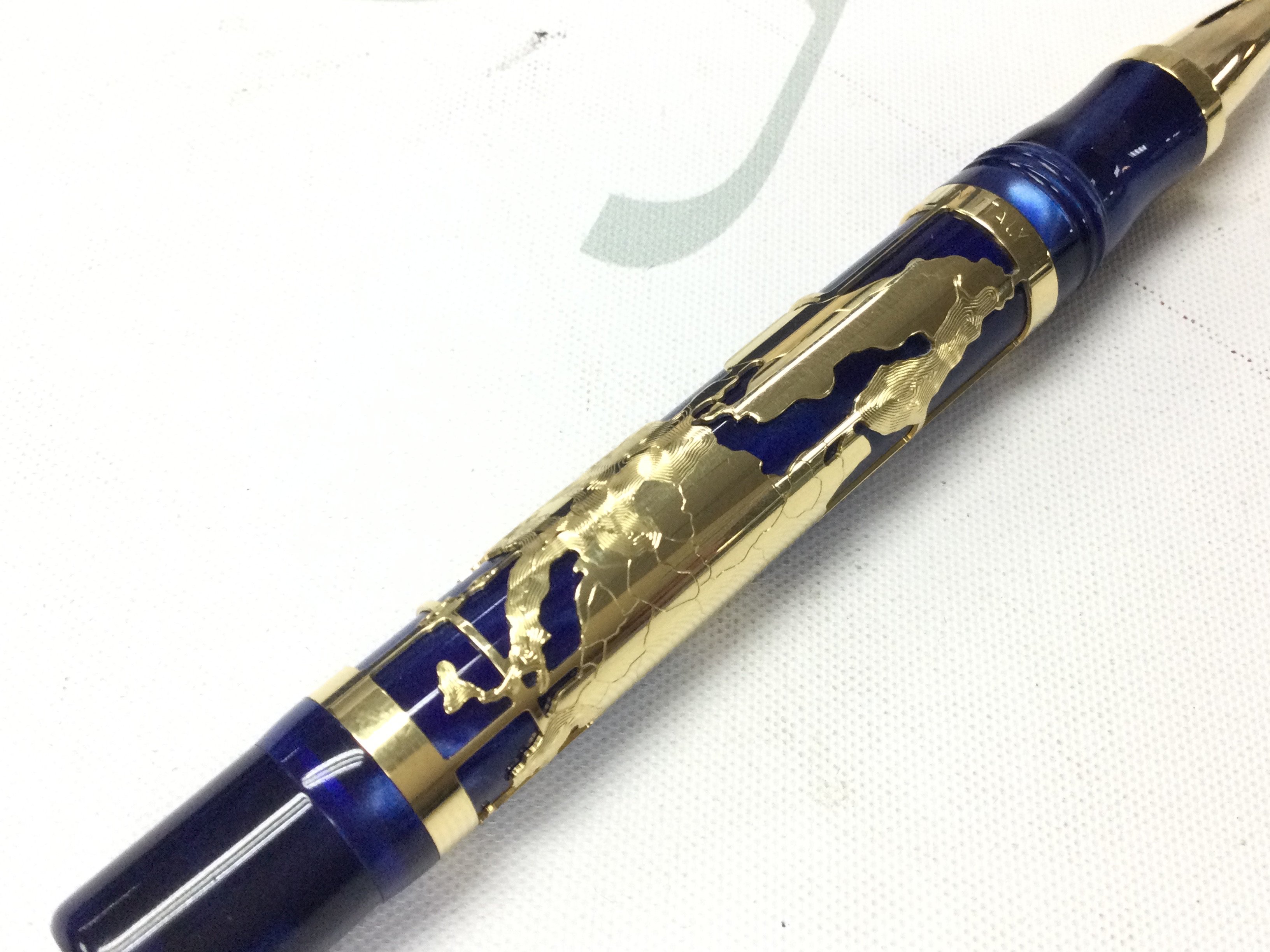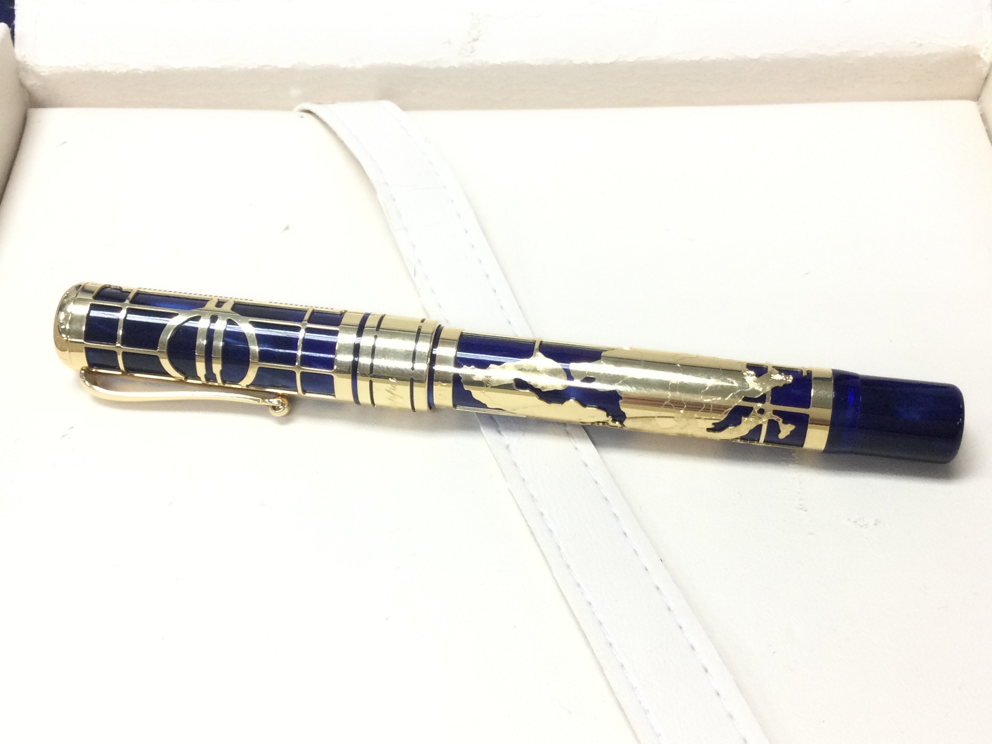 An extremely rare 2002 euro montegrappa 18k gold and blue enamel roller ball Ben with box and papers. The map of Europe accent around the pen is also hallmarked 18k gold