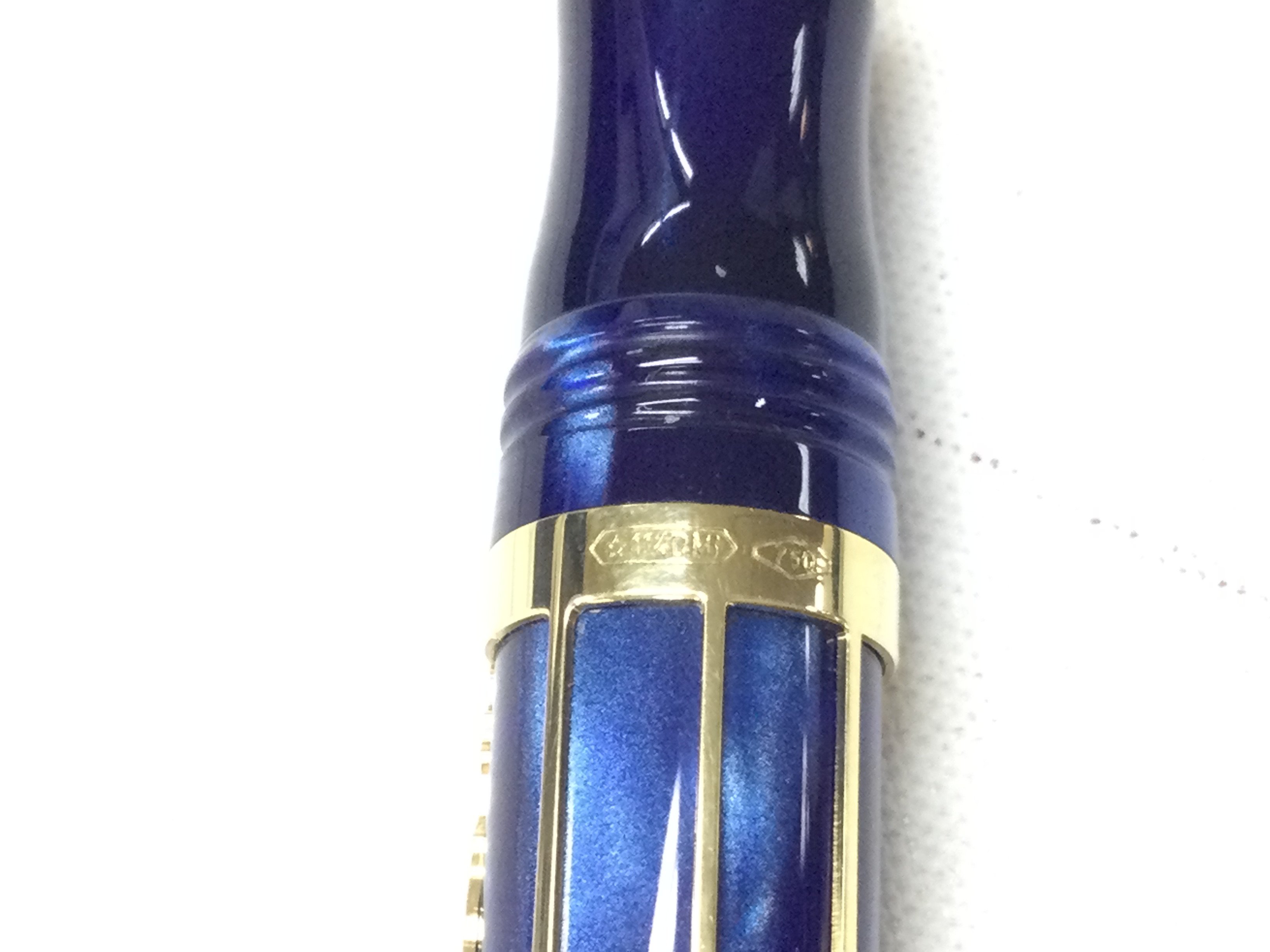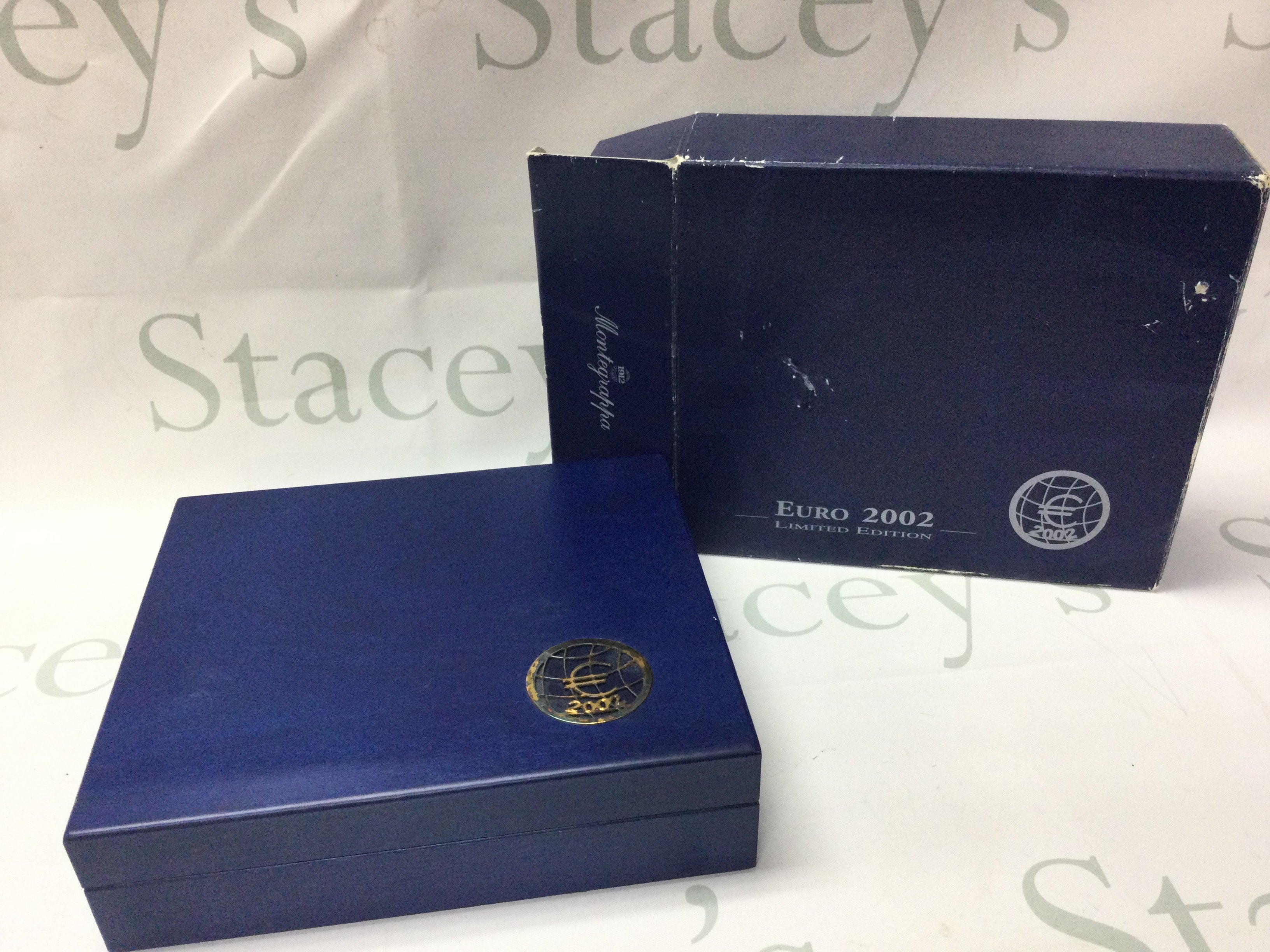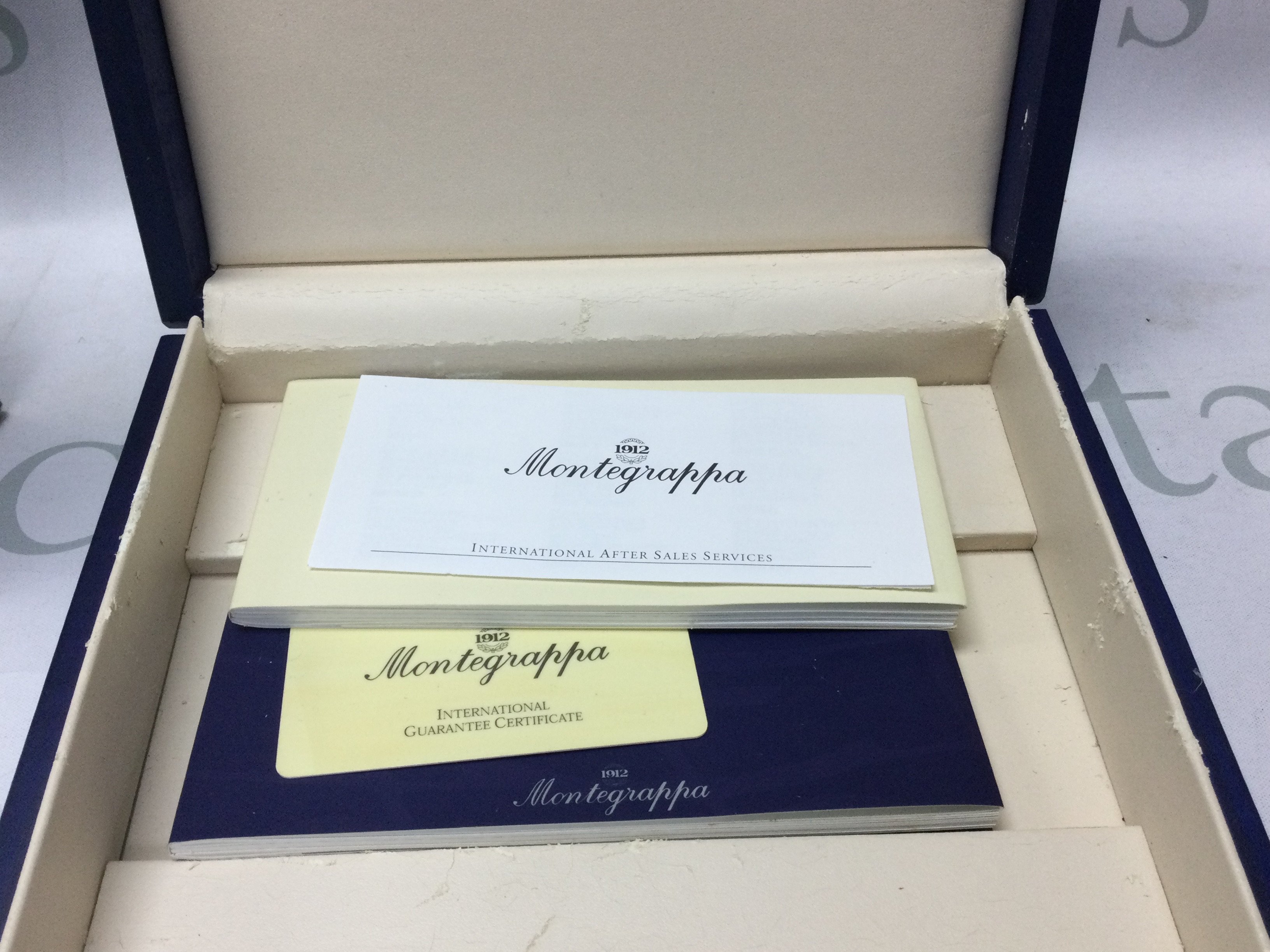 An extremely rare 2002 euro montegrappa 18k gold and blue enamel roller ball Ben with box and papers. The map of Europe accent around the pen is also hallmarked 18k gold