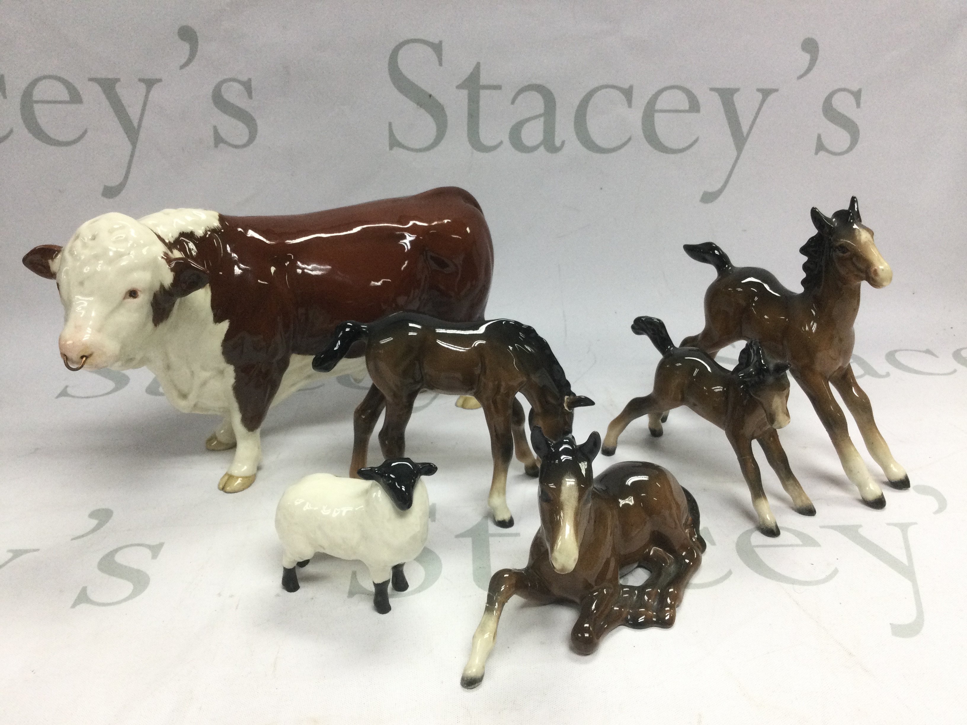 A small collection of Beswick animals comprising a Herefordshire bull, various horses and a lamb, some damage. Shipping category D.