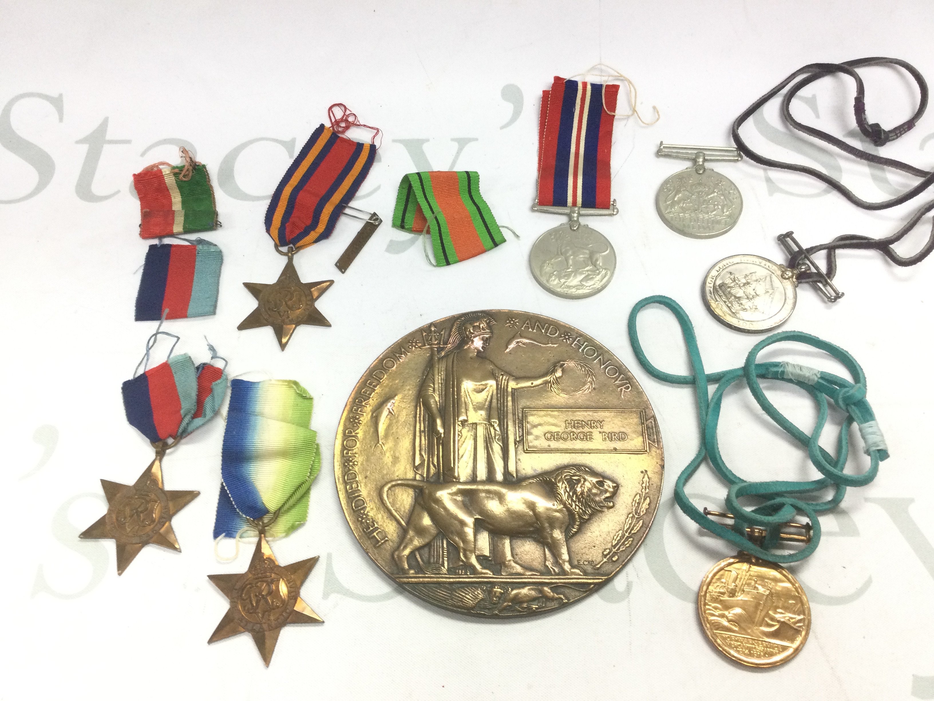 A WW1 memorial plaque for Henry George Bird plus WW1 and WW2 medals including a naval war service medal plus various tunic buttons etc. Shipping category B.